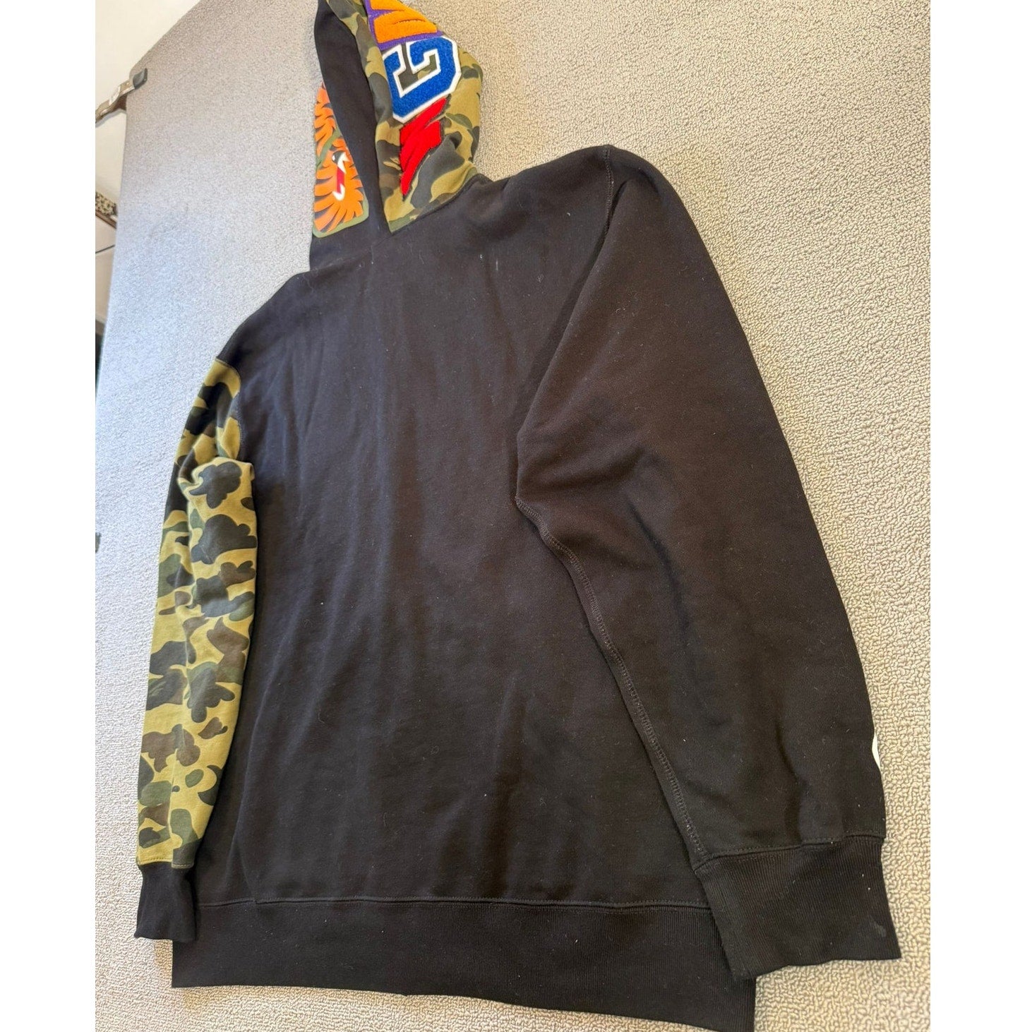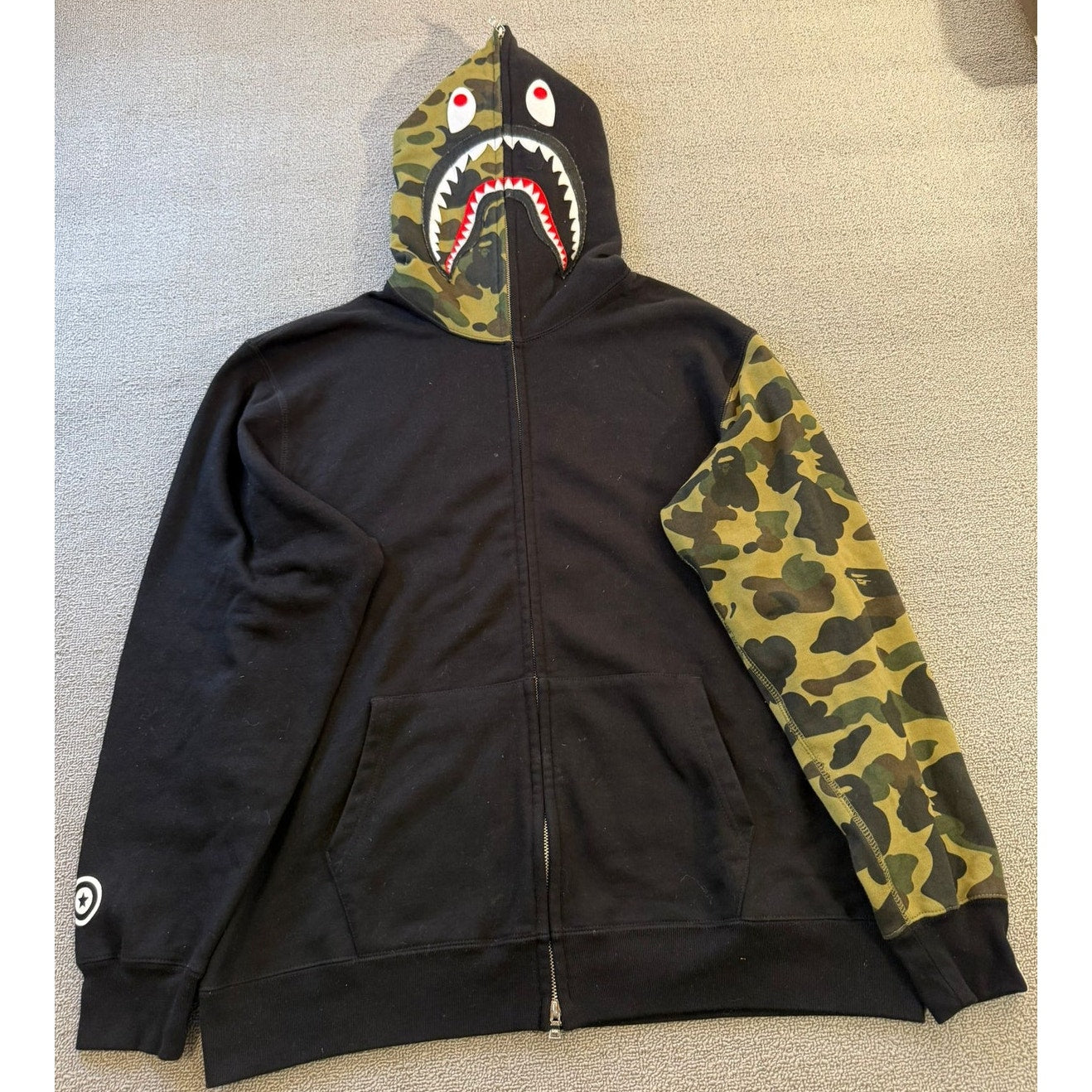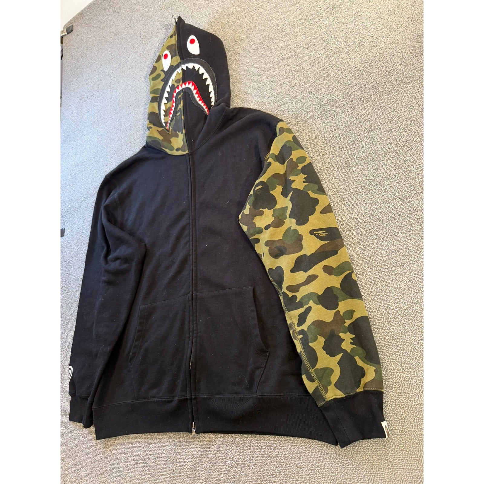Iconic BAPE shark full‑zip hoodie featuring a contrasting camo sleeve and hood detail with a bold shark‑face graphic—standout streetwear piece.