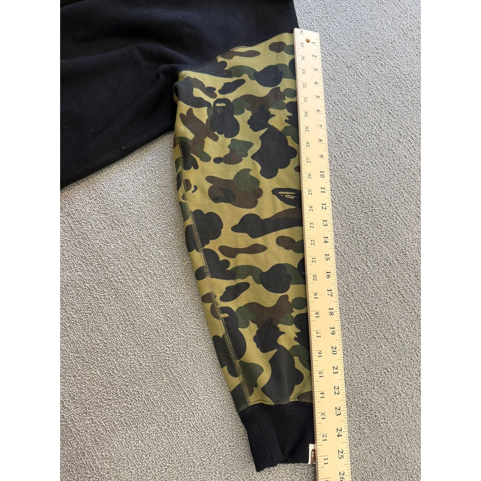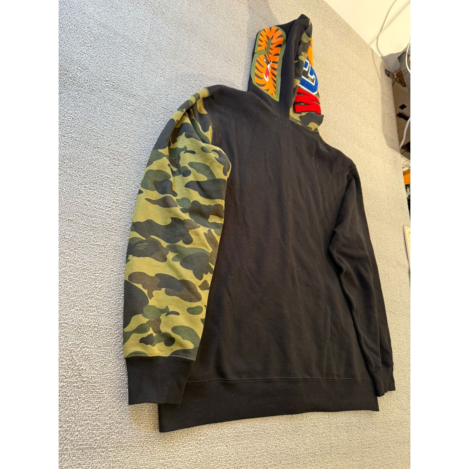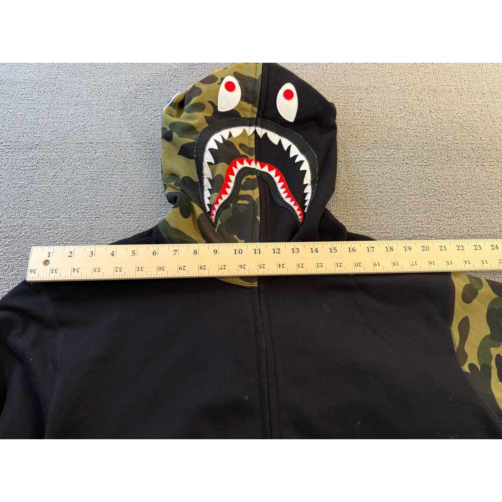 Iconic BAPE shark full‑zip hoodie featuring a contrasting camo sleeve and hood detail with a bold shark‑face graphic—standout streetwear piece.