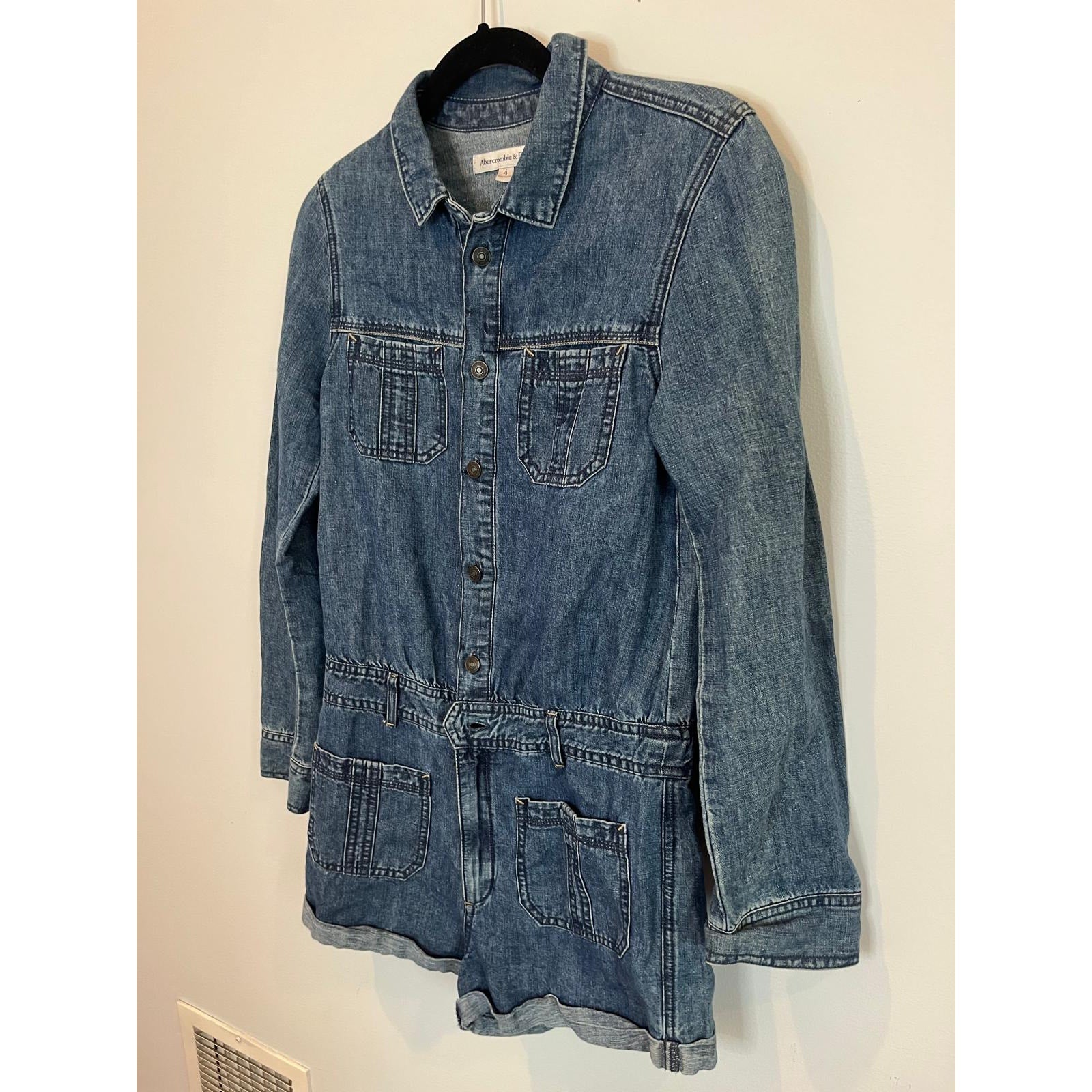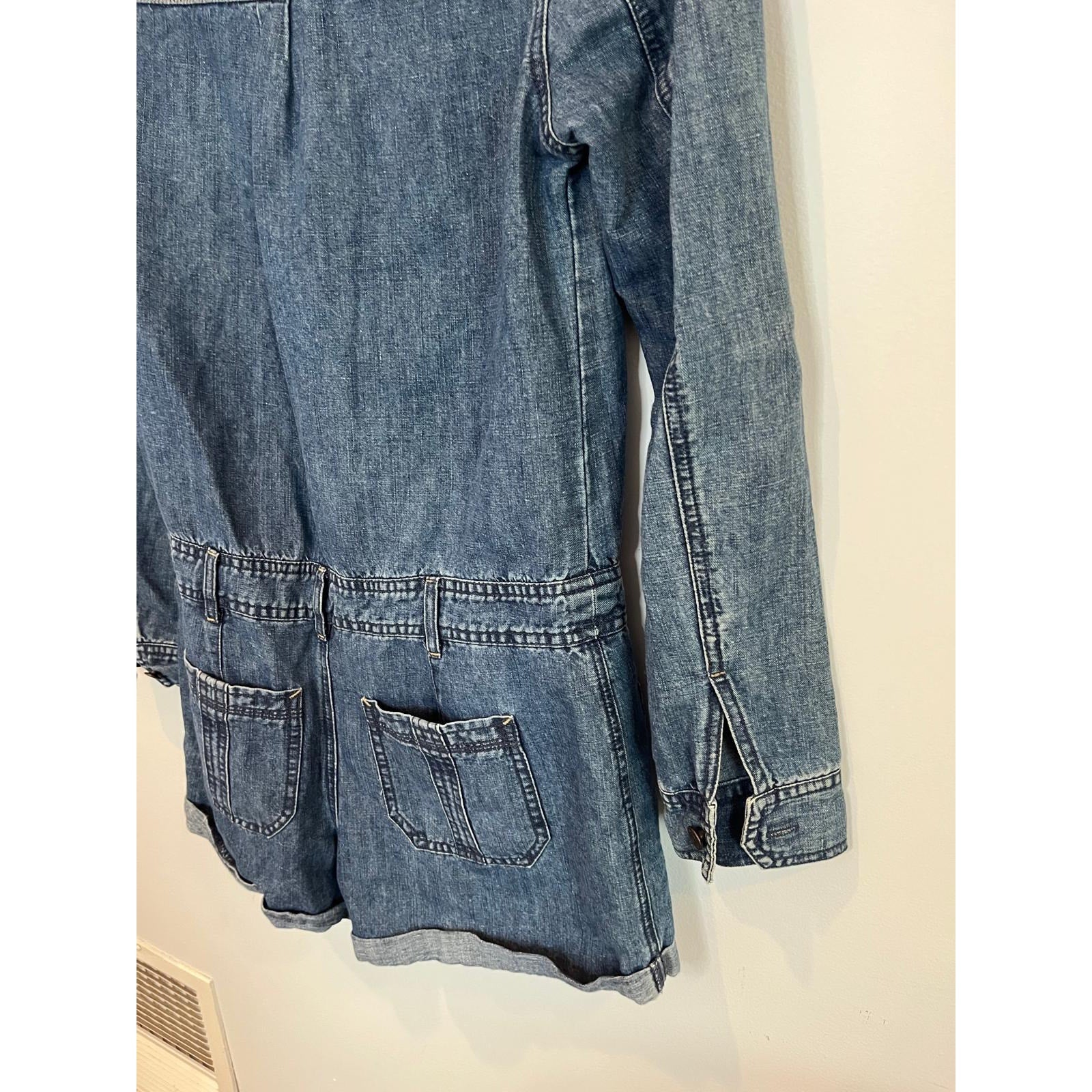 Structured denim romper with long sleeves, front chest pockets, and utility-style front seams. Snap-button and zip fly closure.