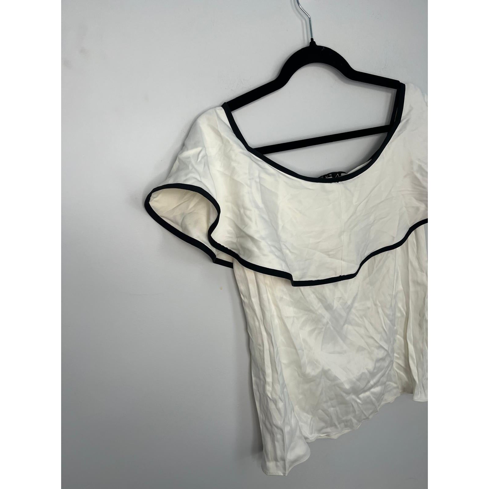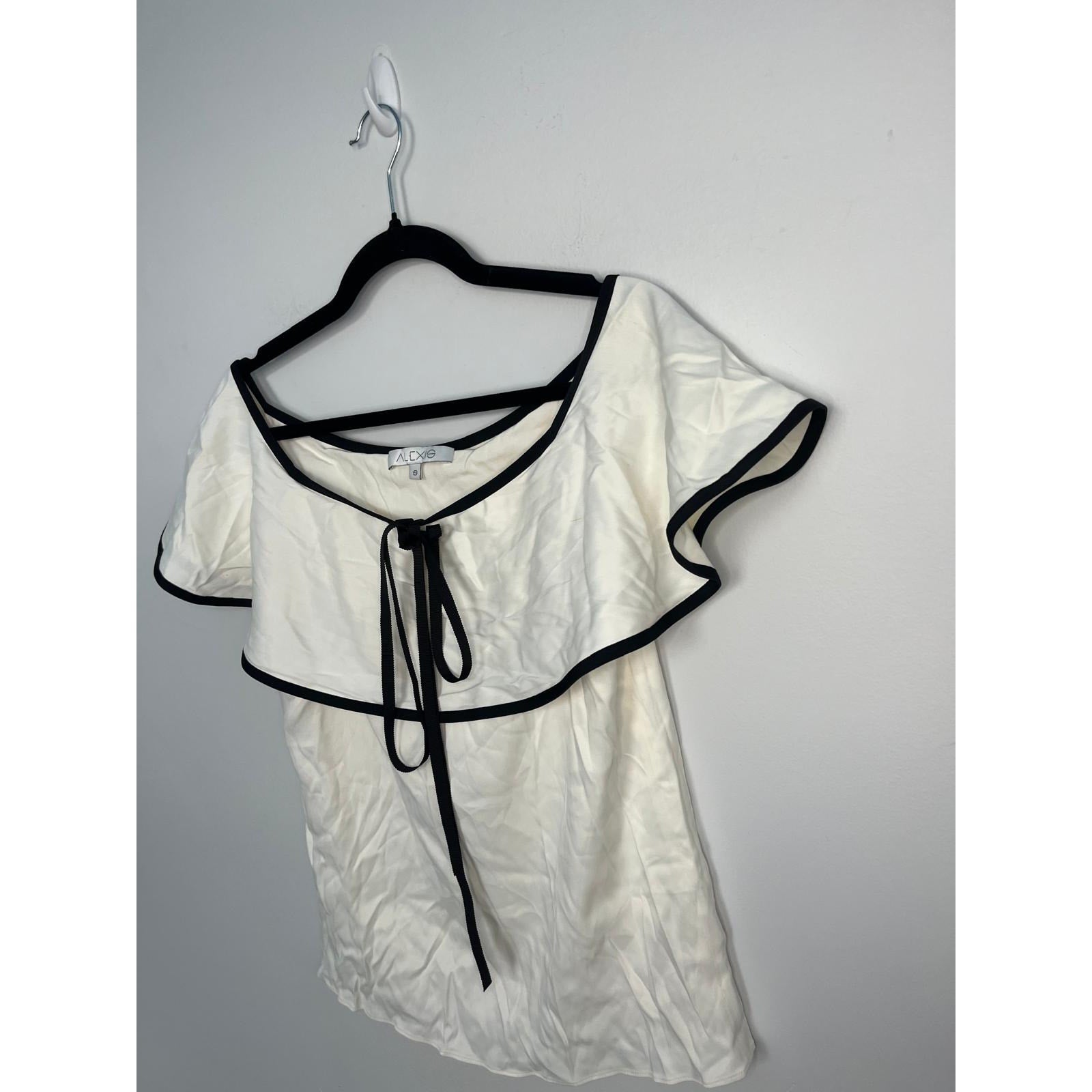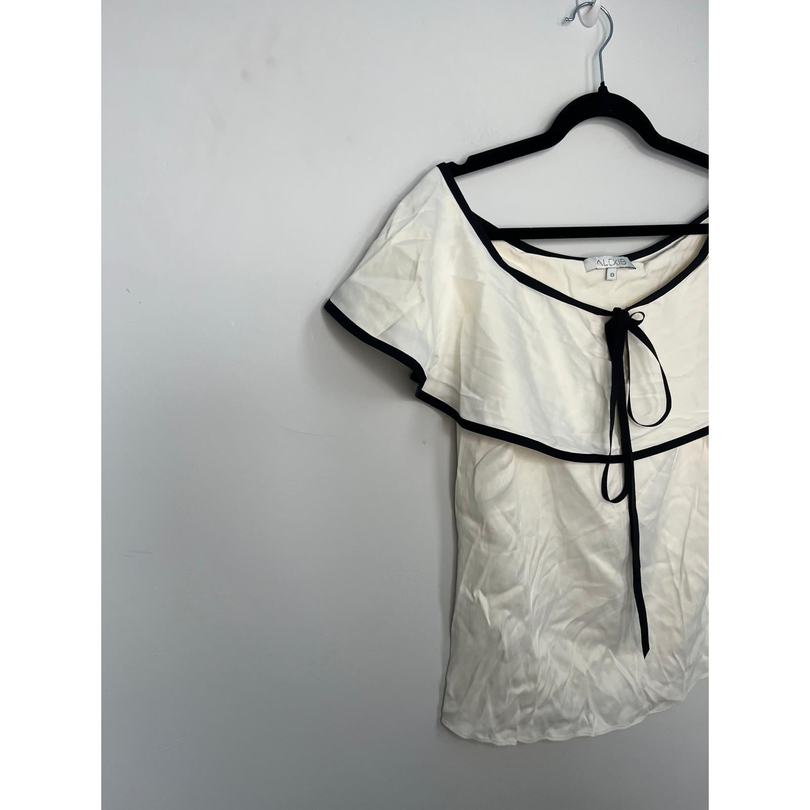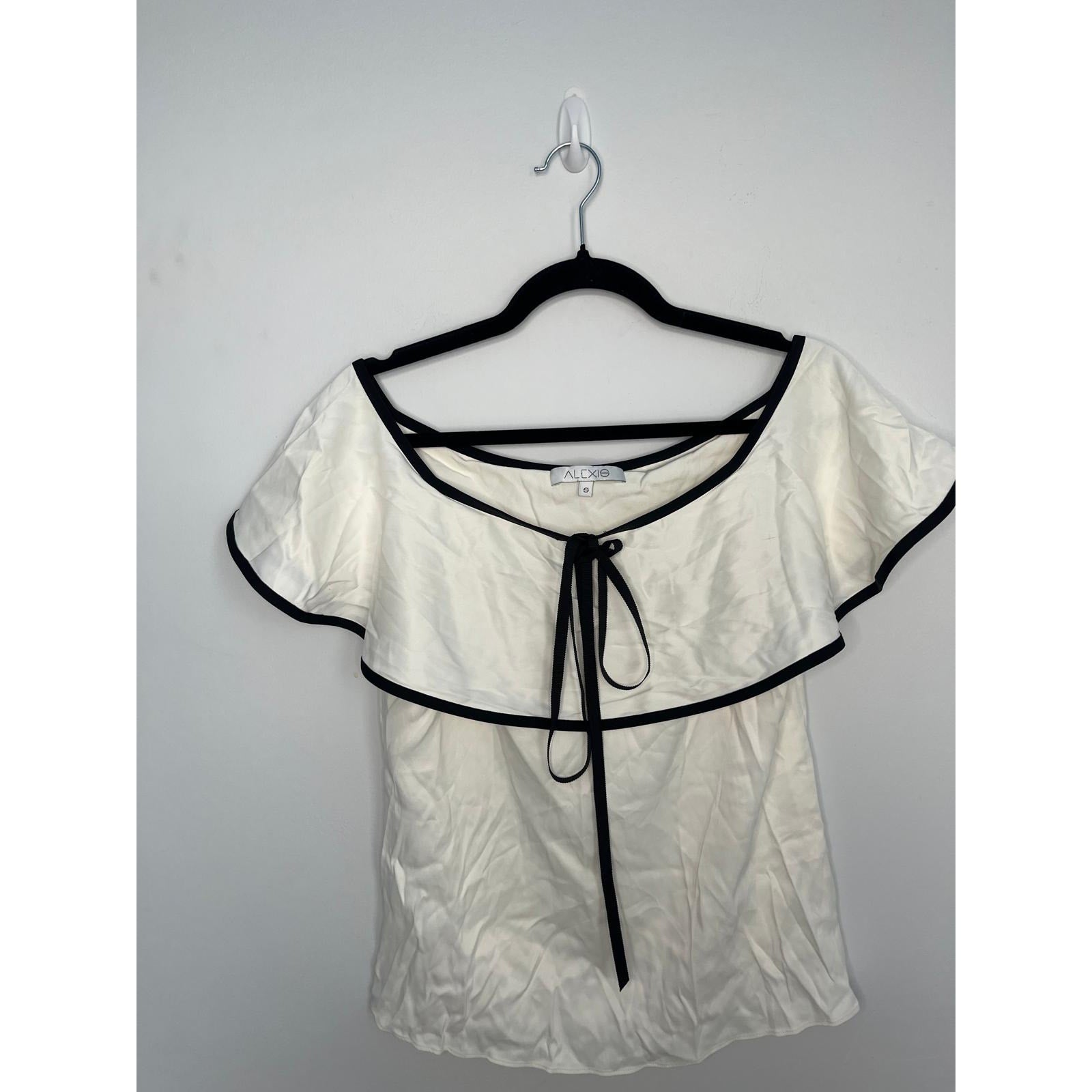 Lightweight cream blouse with black contrast trim and a wide ruffle neckline. Features a front tie detail and short sleeves with a feminine silhouette.