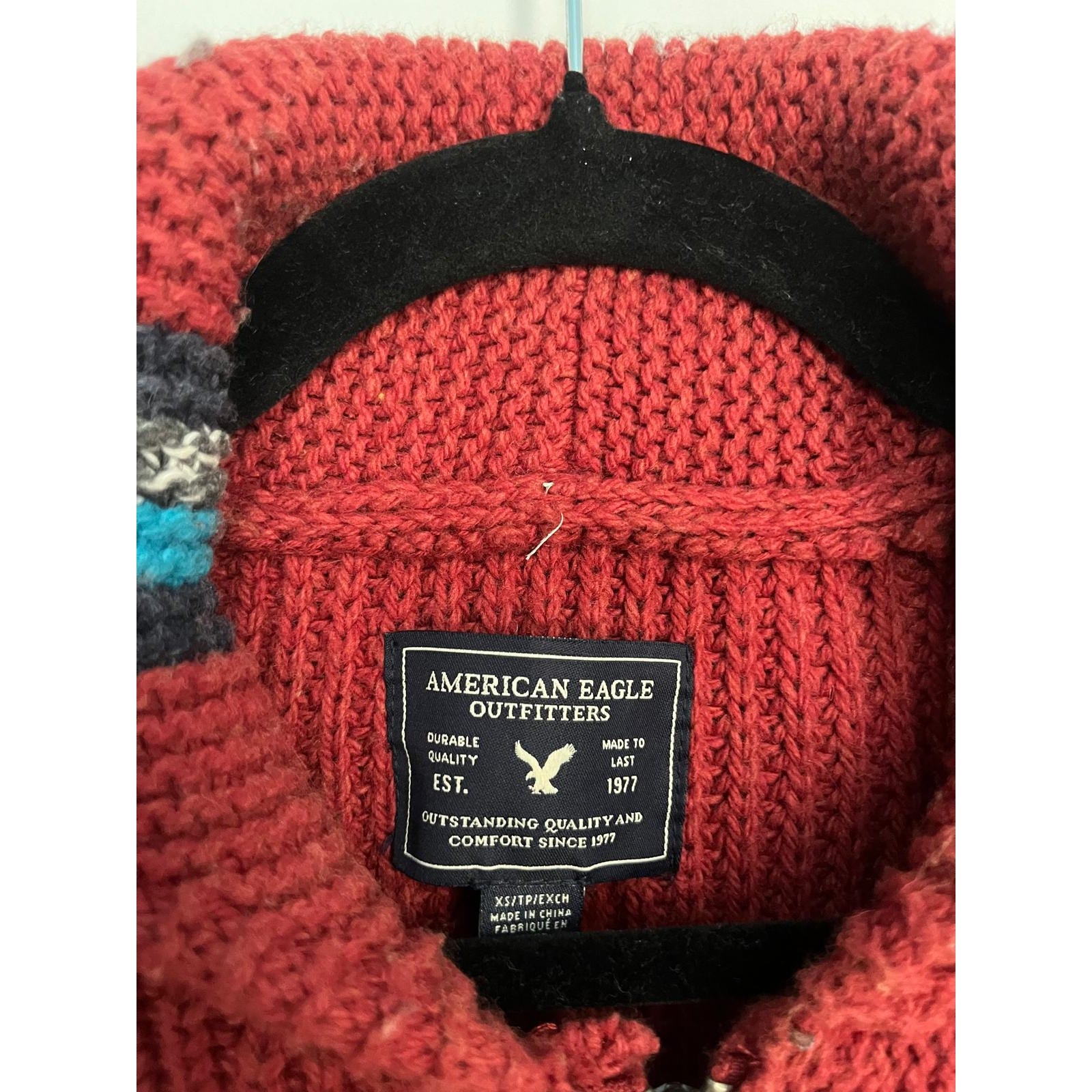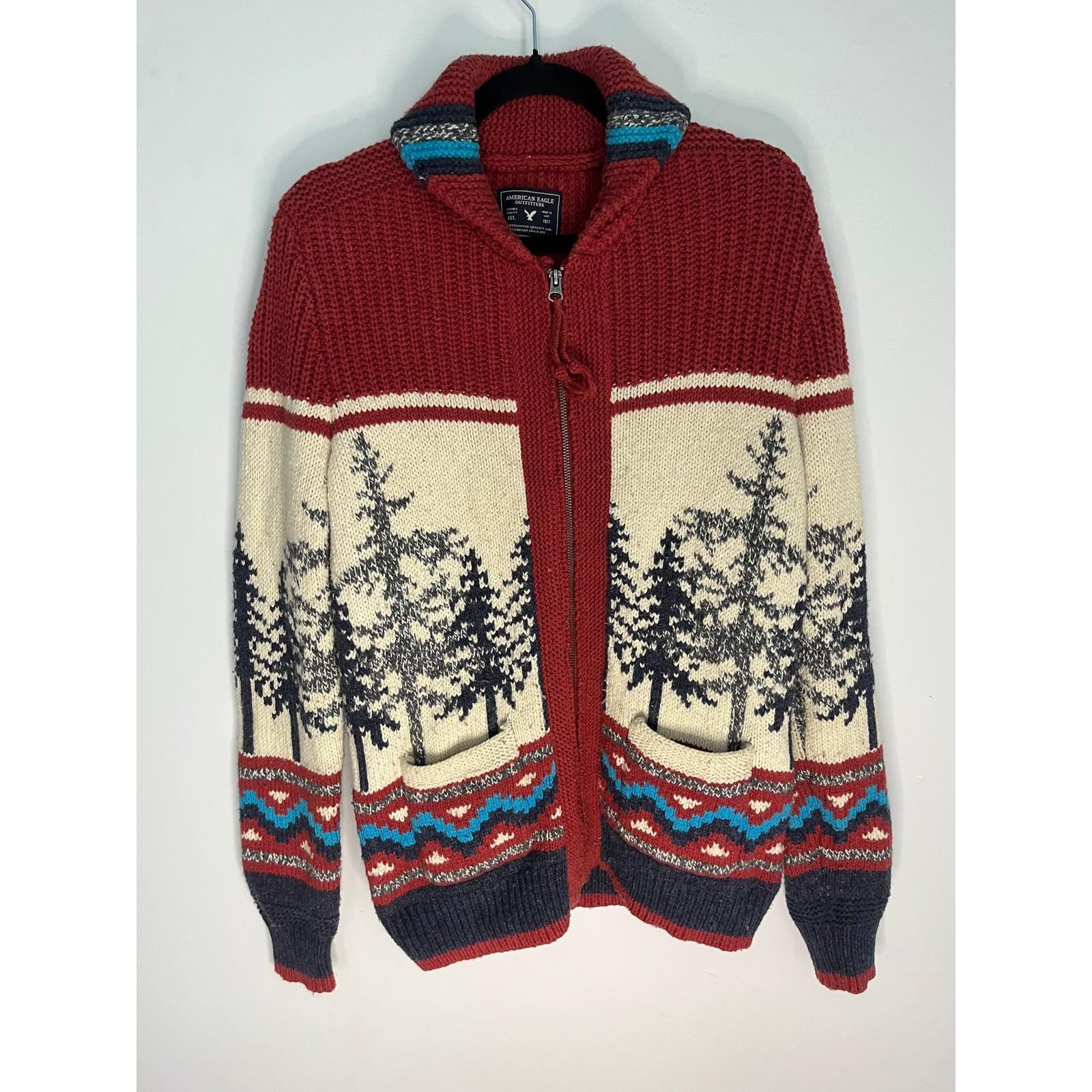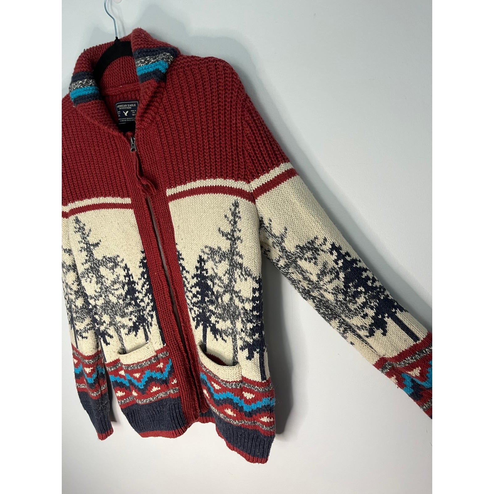 American Eagle Cardigan Women XS Knit Sweater Red Winter Fair Isle Zip Trees