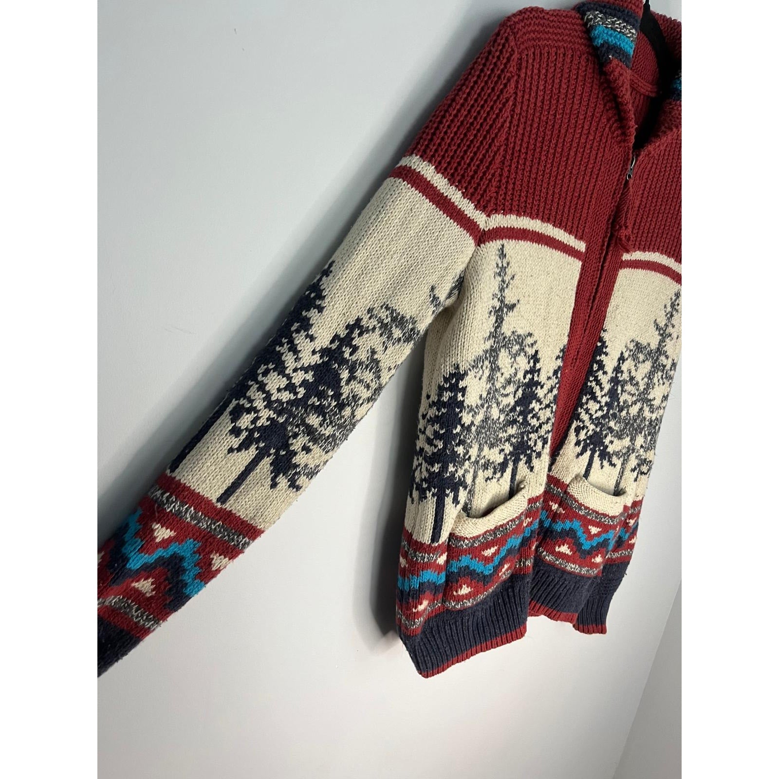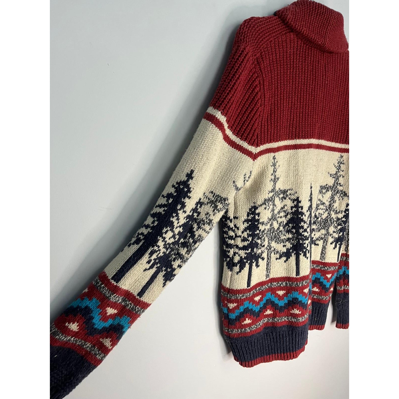 Thick knit zip-up cardigan sweater with forest tree jacquard design, shawl collar, and rustic winter fair isle pattern in red, cream, navy, and blue. Chunky construction and front pockets make this ideal for layering in cold weather.