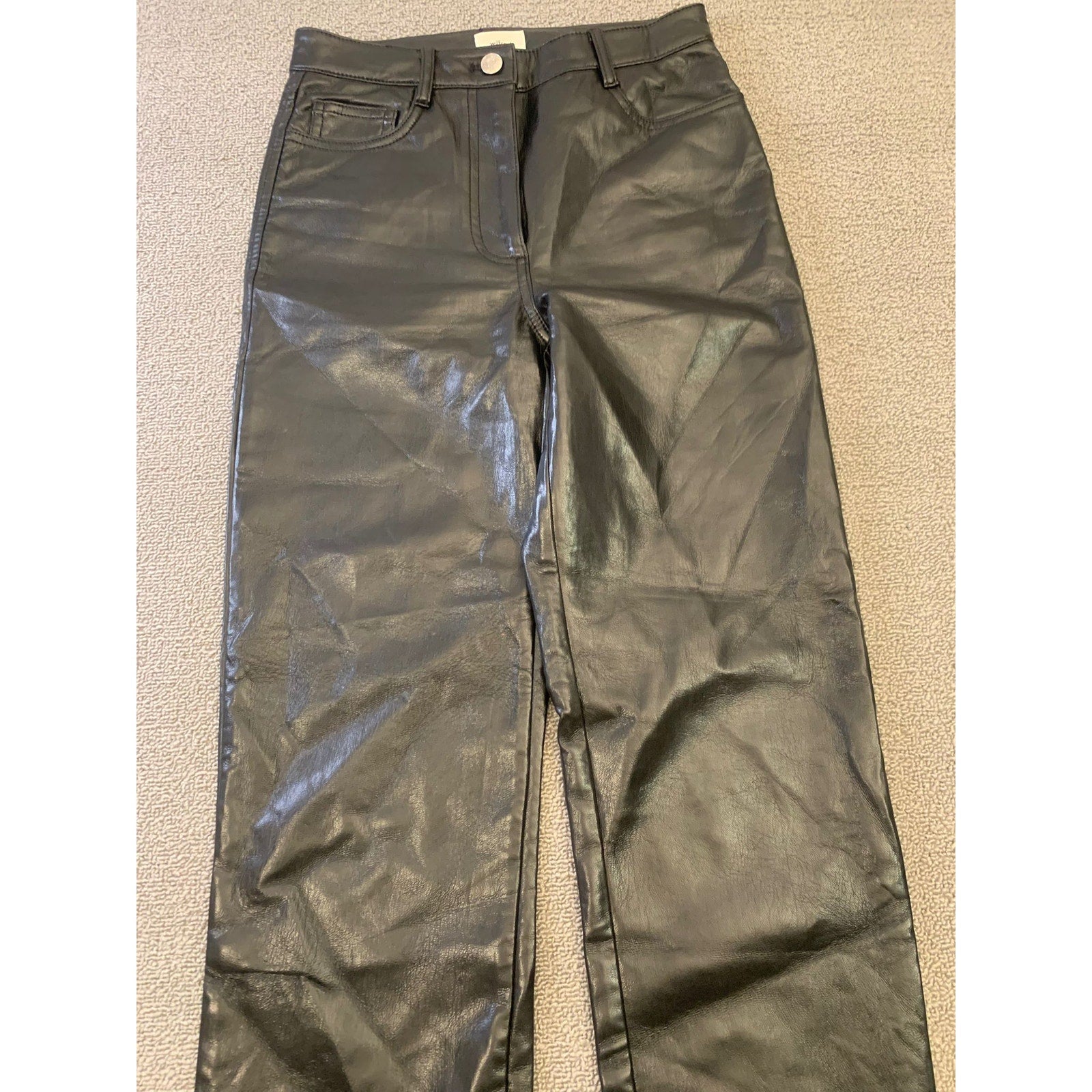 A chic pair of Wilfred faux leather pants in a wide‑leg, straight silhouette with a high rise and button‑zip closure. The pants have a feature sleek matte black finish with smooth vegan-leather texture.