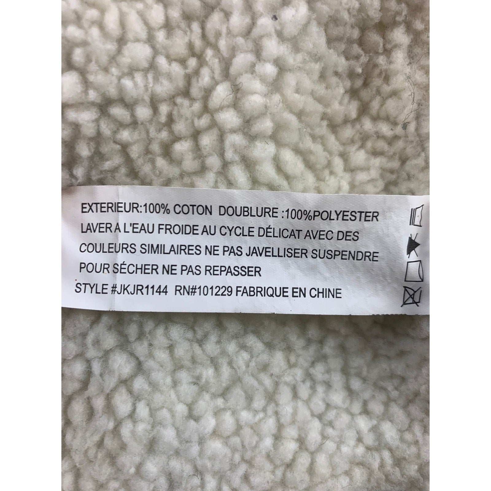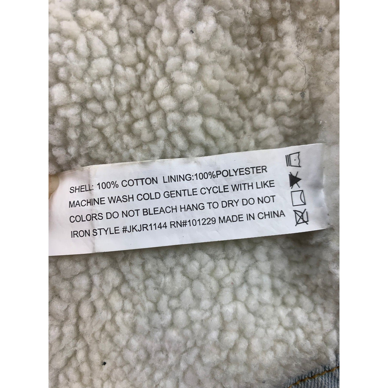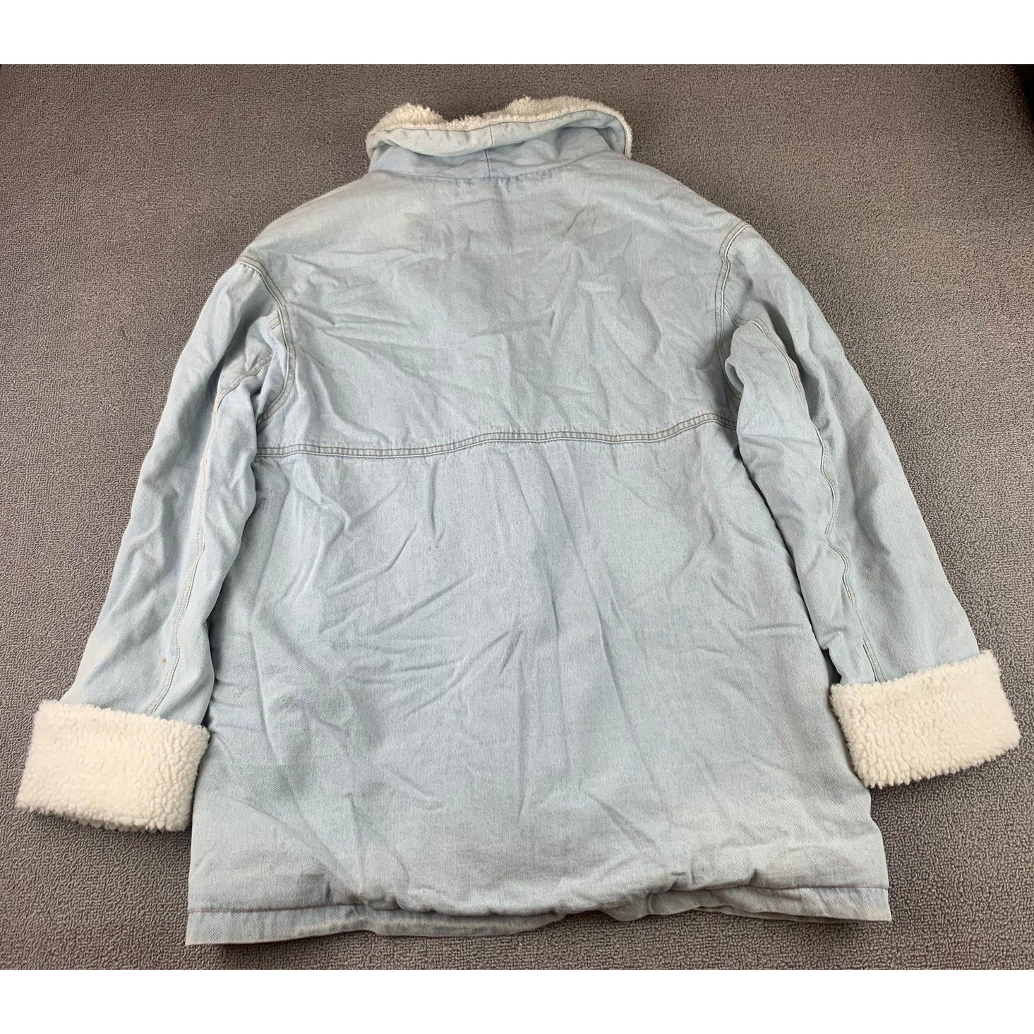 Cozy sherpa lined denim coat with a wide shawl collar and cuffable sherpa sleeves. Button front, two flap pockets and two lower patch pockets. Light wash with natural creasing and scattered marks from wear. Made in cotton and polyester, made in China.