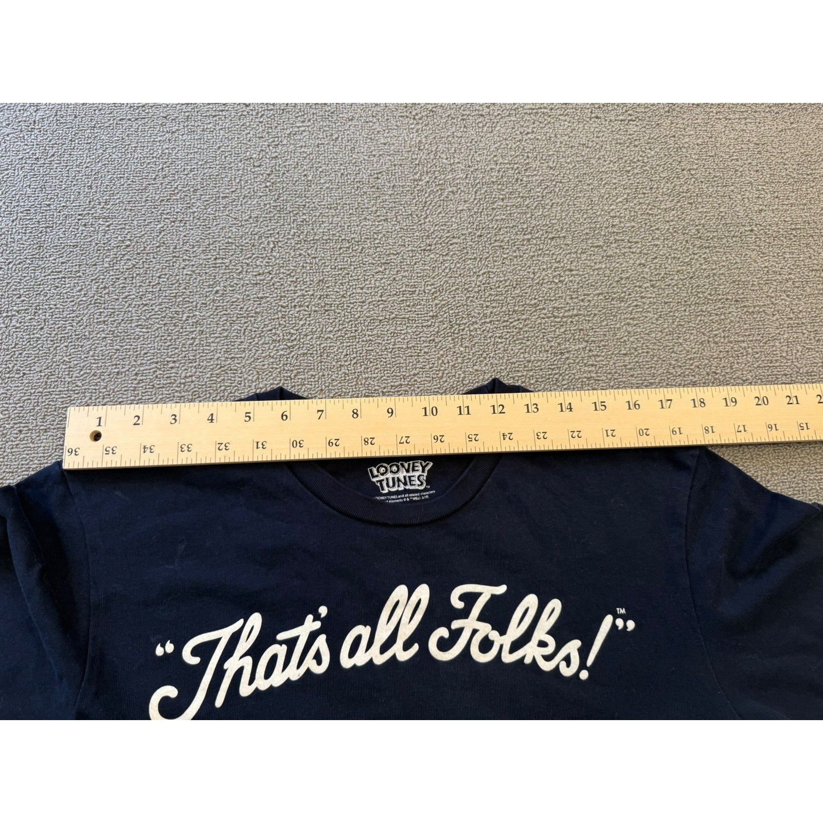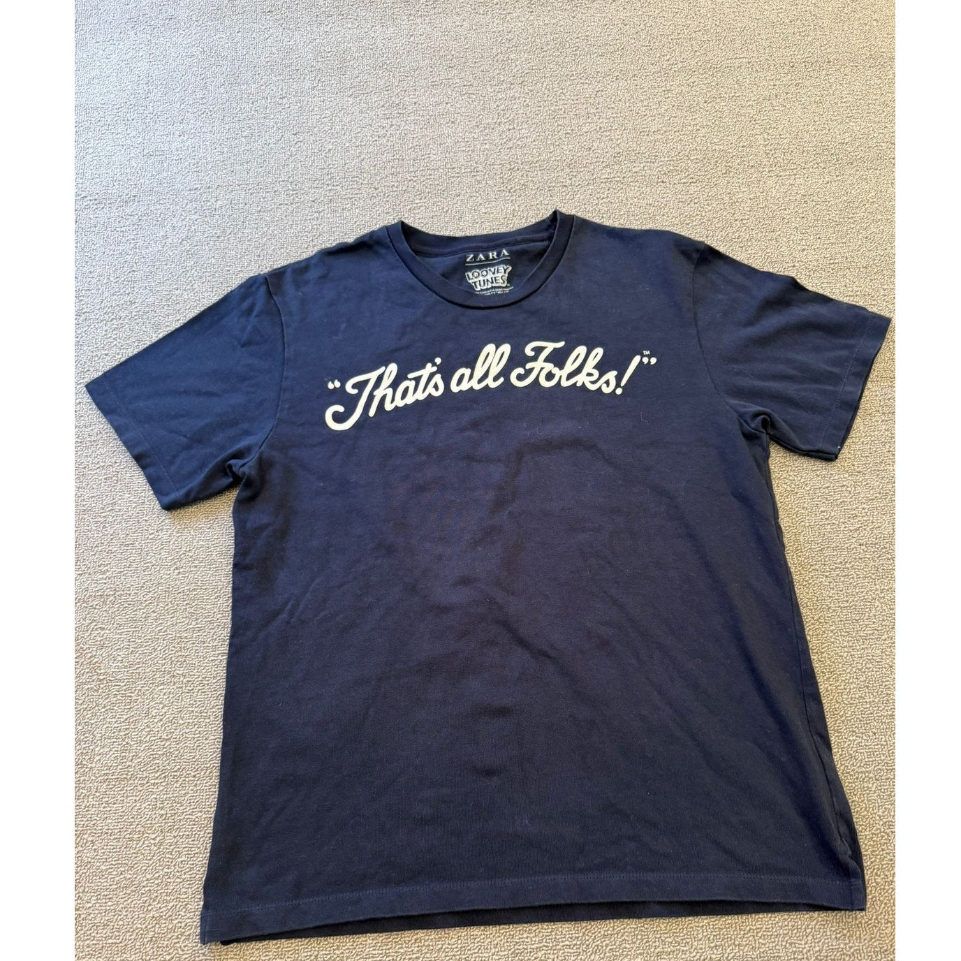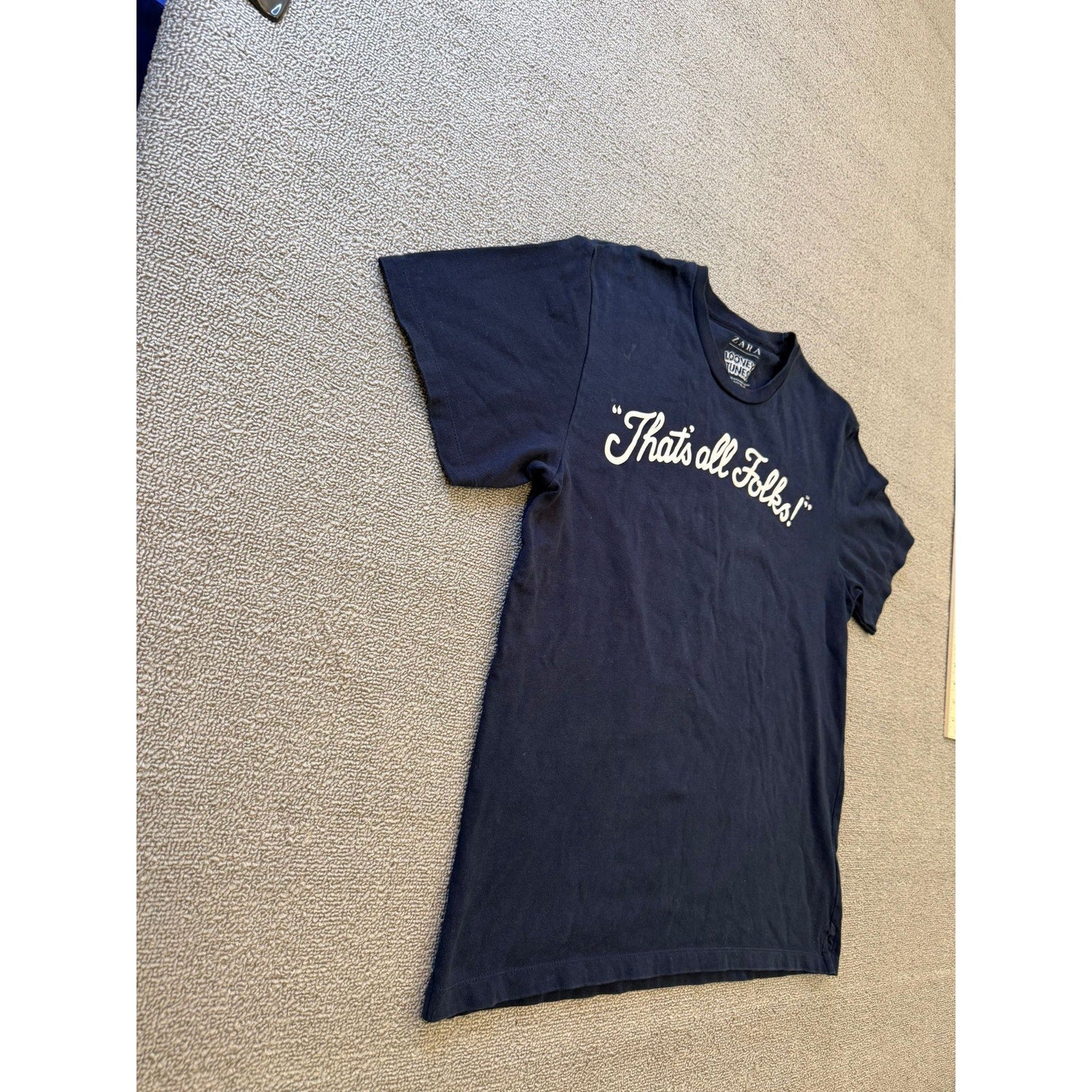 Casual Zara graphic tee featuring heavyweight cotton with white “That’s All Folks!” script—clean, minimalist retro Looney Tunes aesthetic. Fits true to size, classic boyfriend cut; primary color navy blue, lettering contrast white.