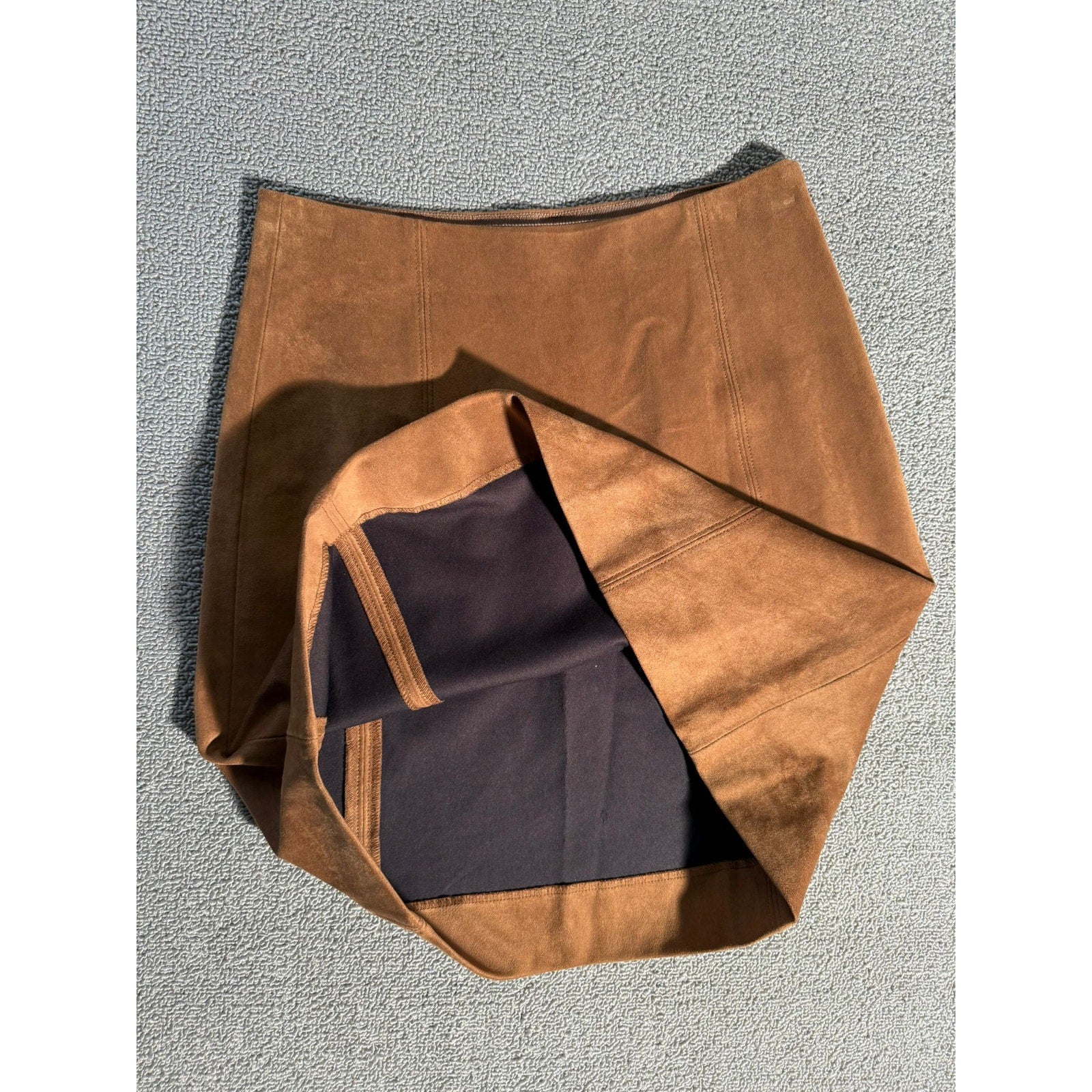 Brown suede (vegan or genuine) A-line mini skirt with clean panel seams—sleek and versatile, ideal for styling with chunky knits or fitted tops. Tailored fit with a subtle zipper closure for ease.
