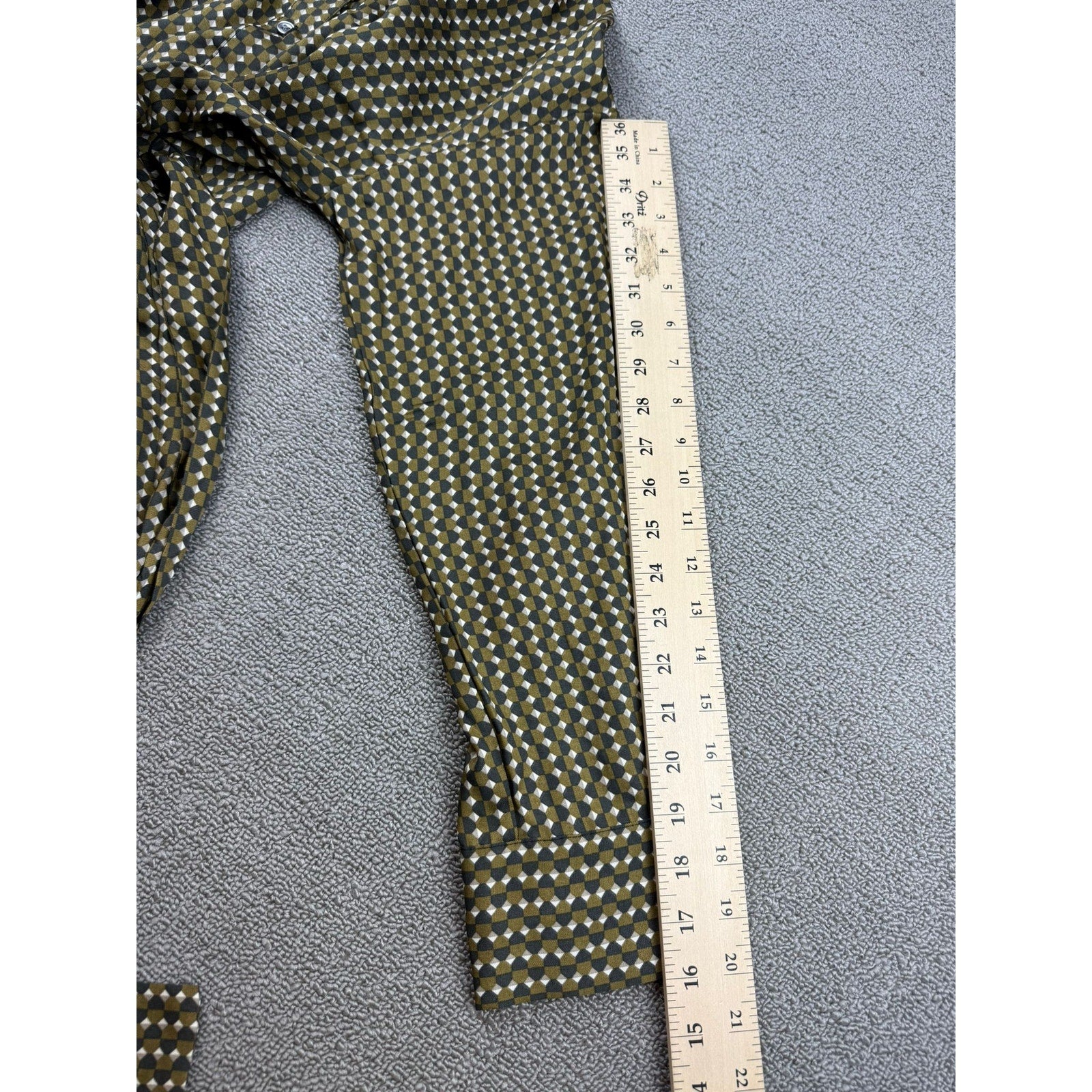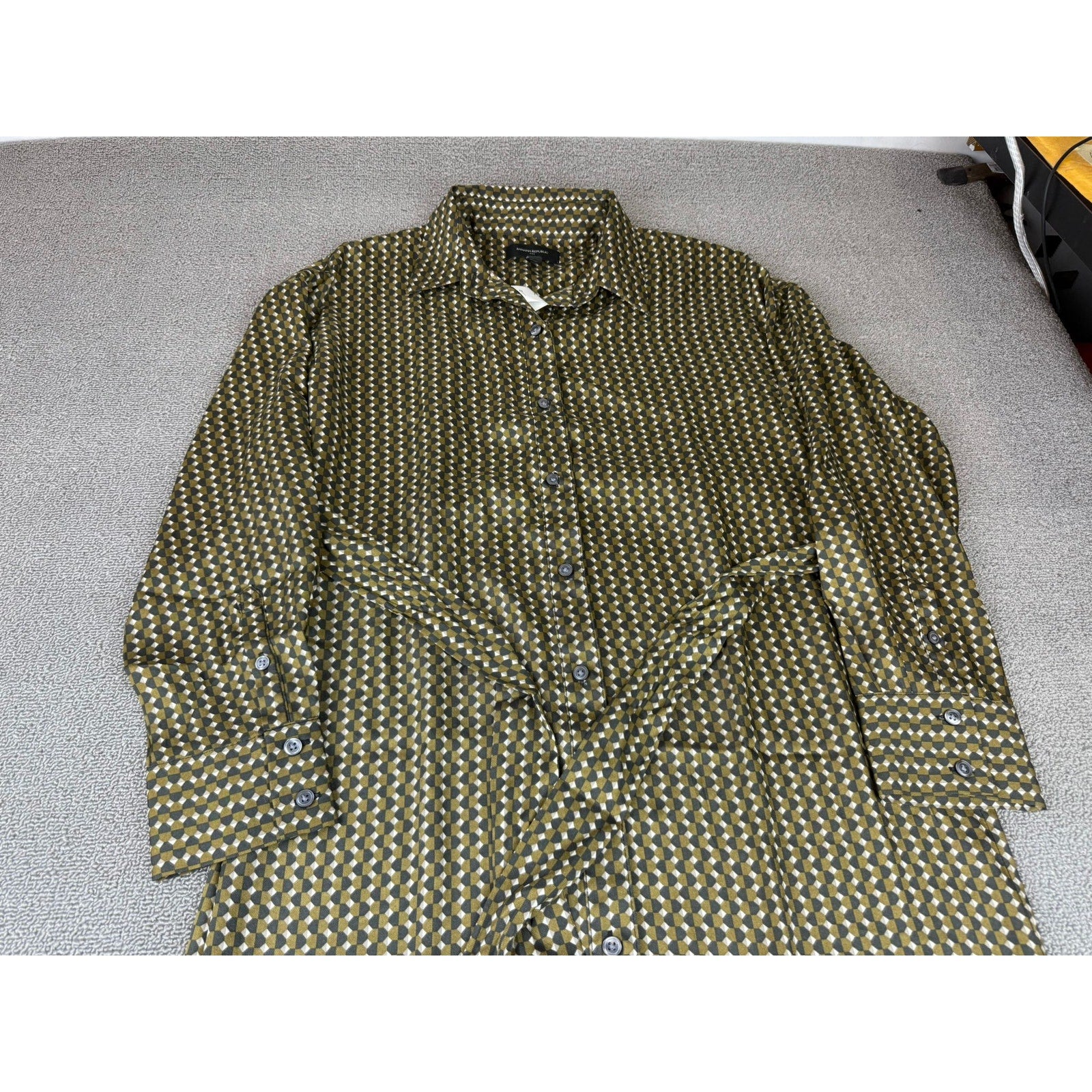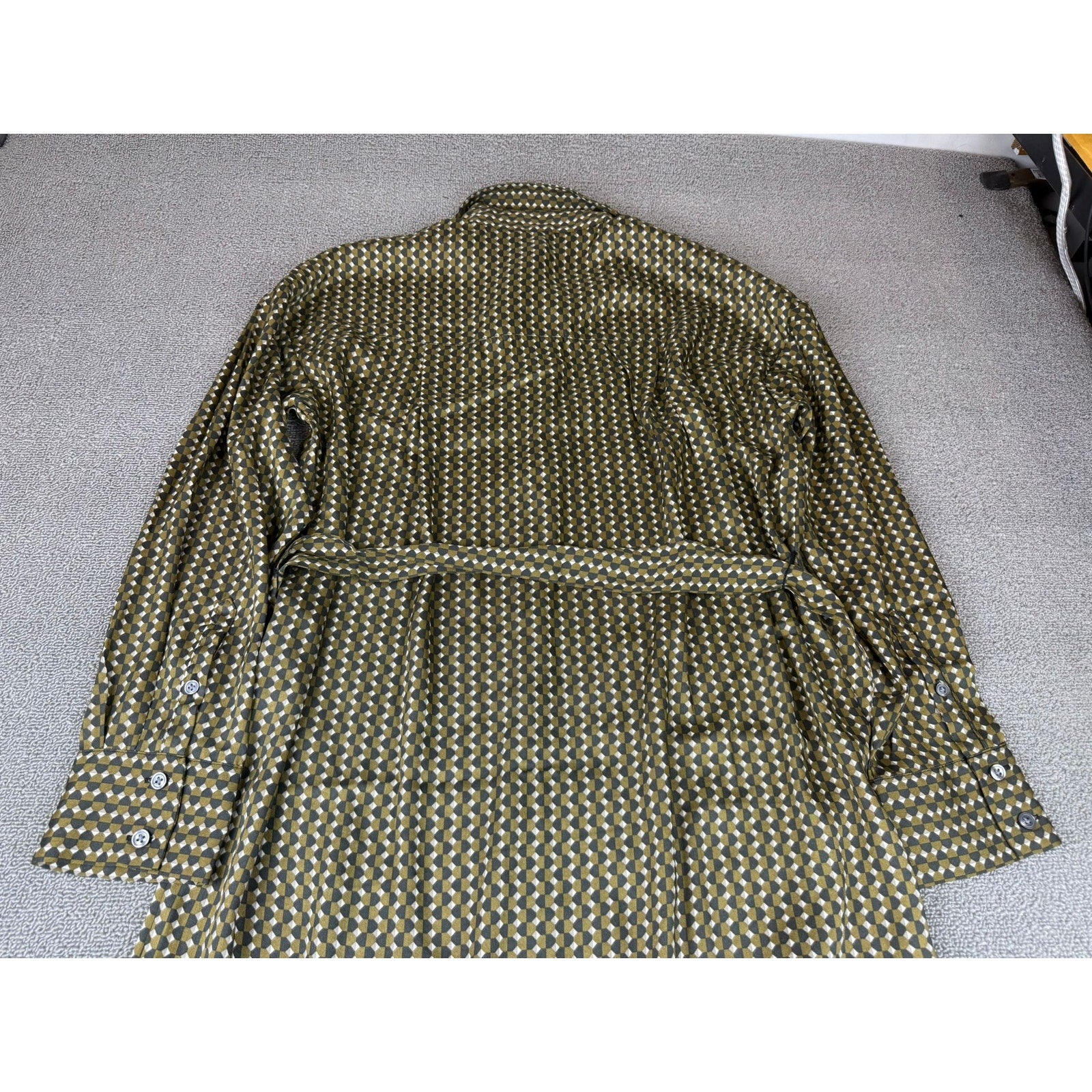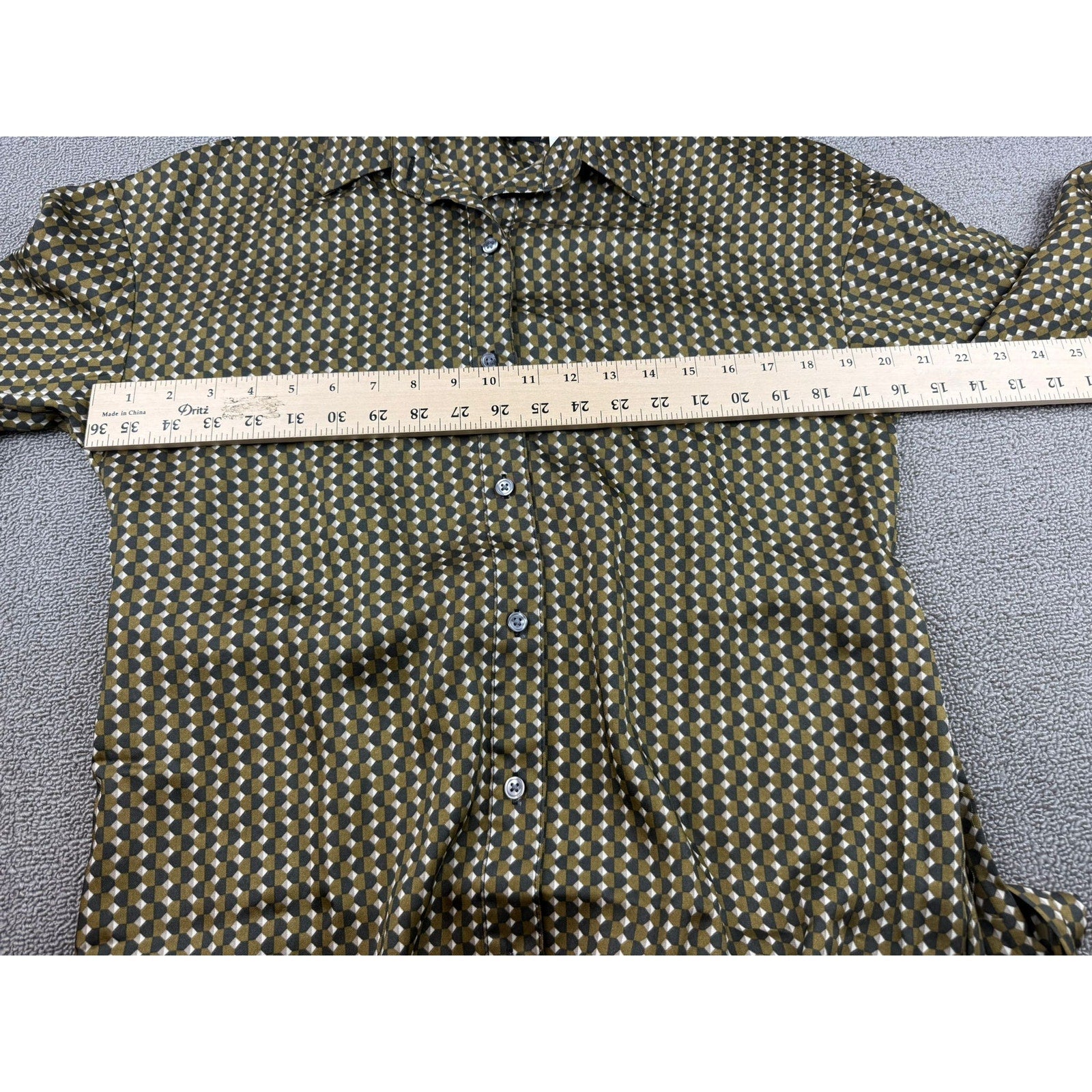 This Banana Republic shirt-dress features an eye-catching olive, black, and ivory geometric print. Its lightweight, button-down shirt silhouette includes a matching self-tie belt, three-quarter sleeves, and a curved hemline—versatile and effortlessly stylish for both casual and office looks.