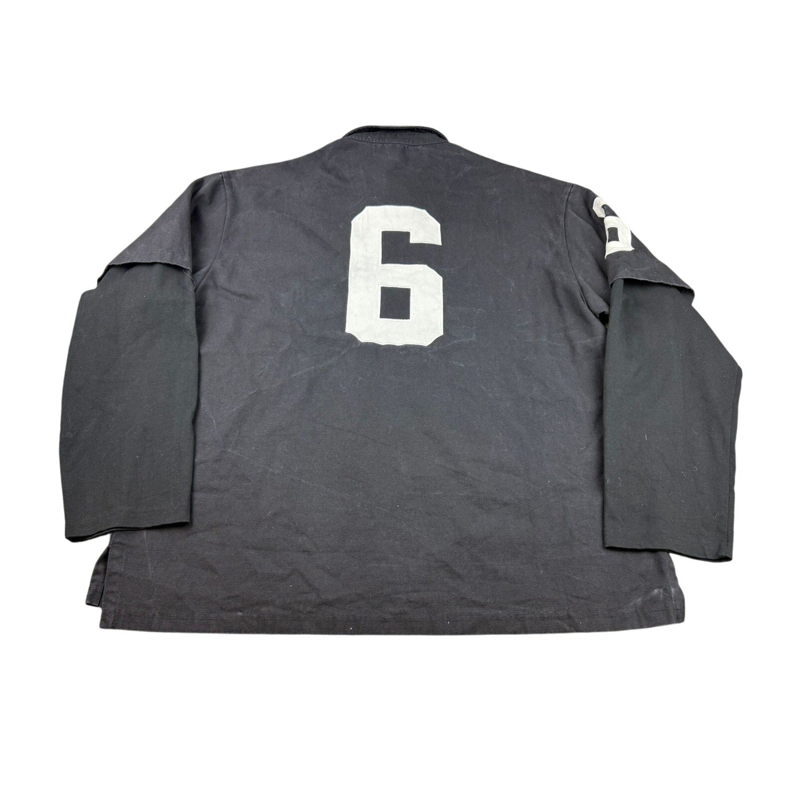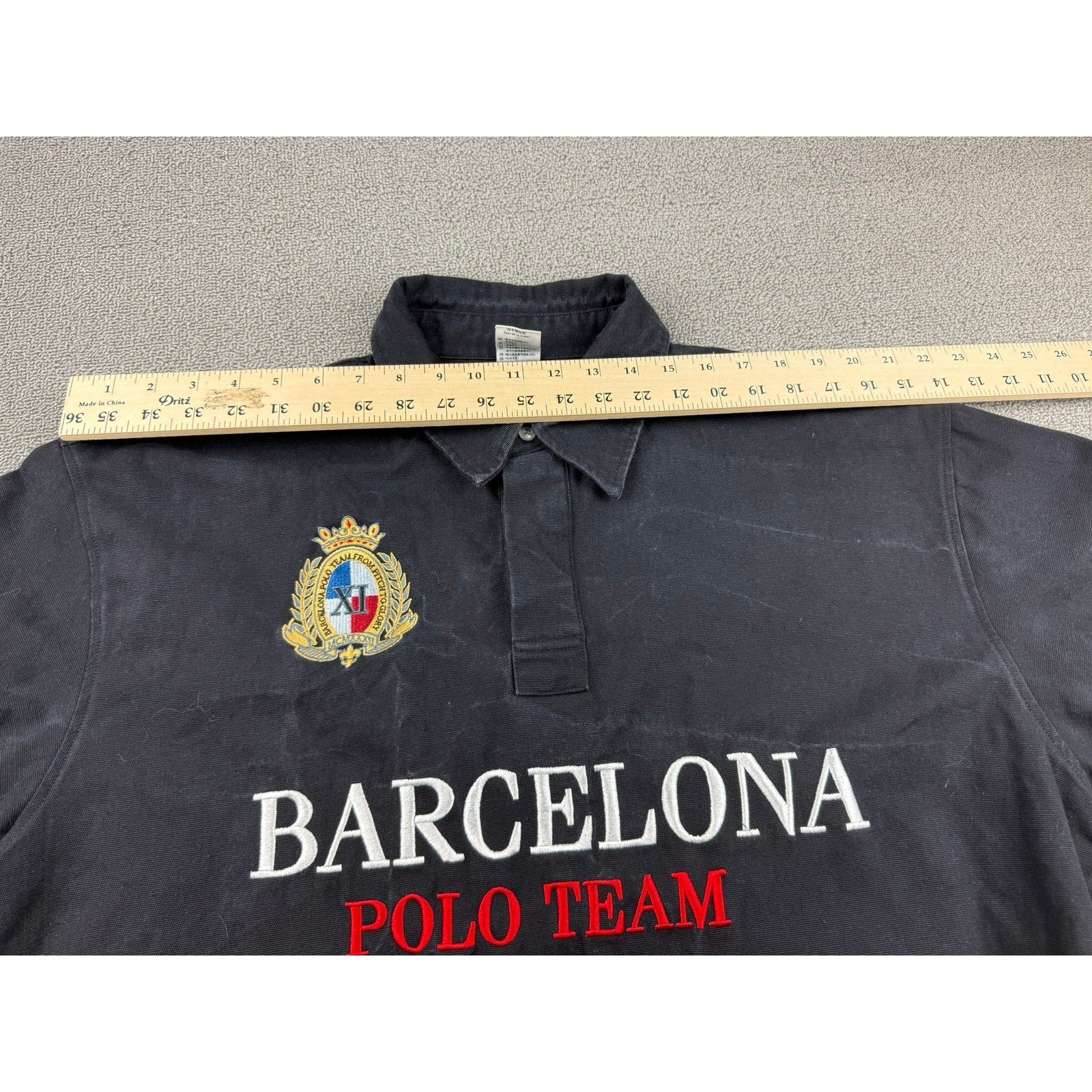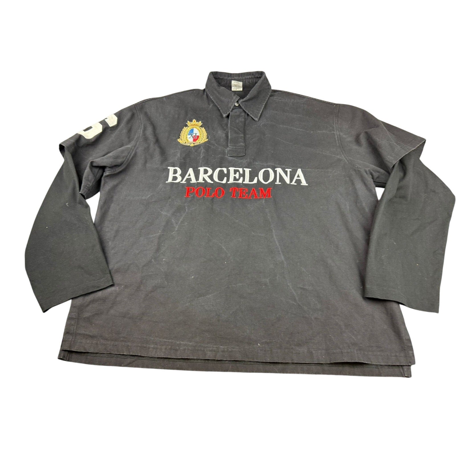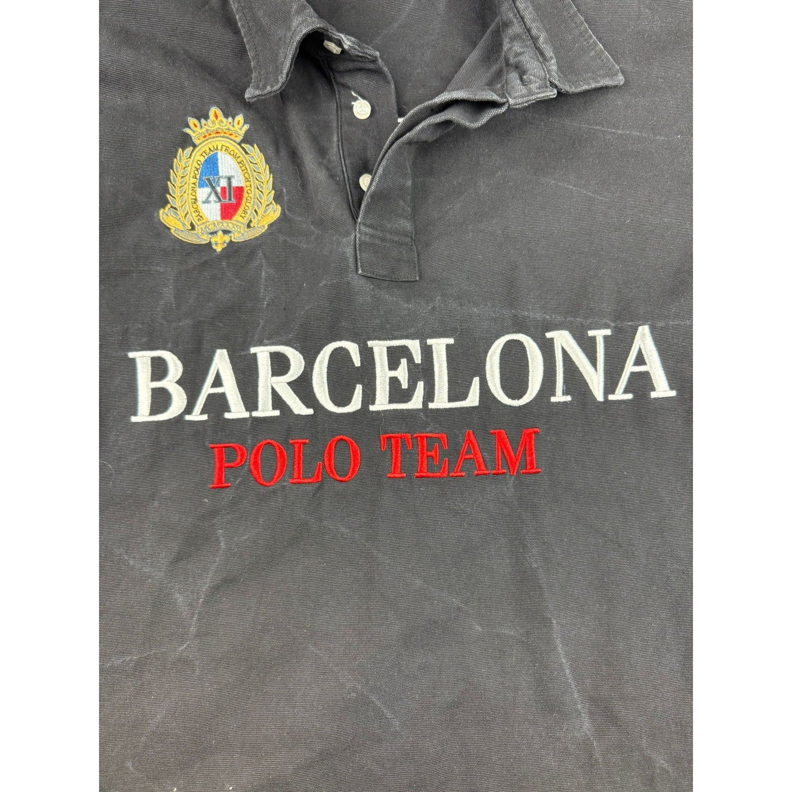 Vintage-inspired rugby polo shirt in black with bold “Barcelona Polo Team” embroidery across the chest, crest logo patch, and number detail on the sleeve. Classic collared design with long sleeves and comfort fit construction.