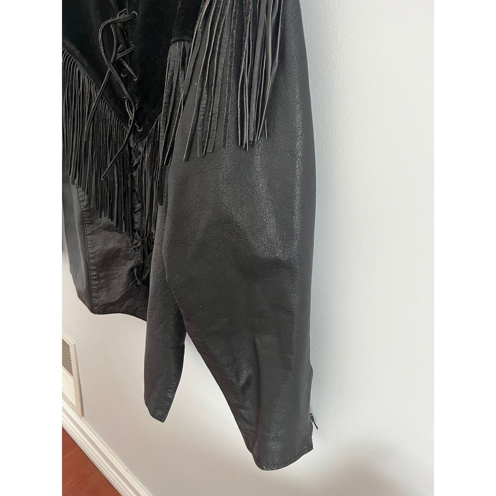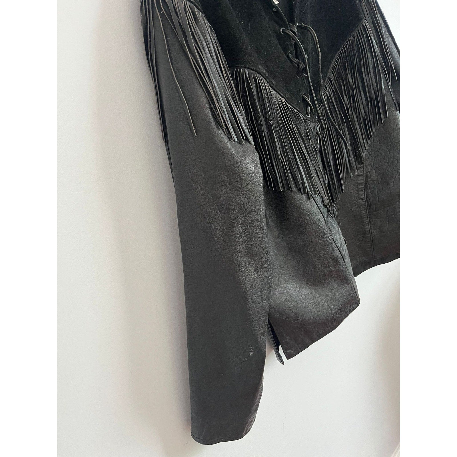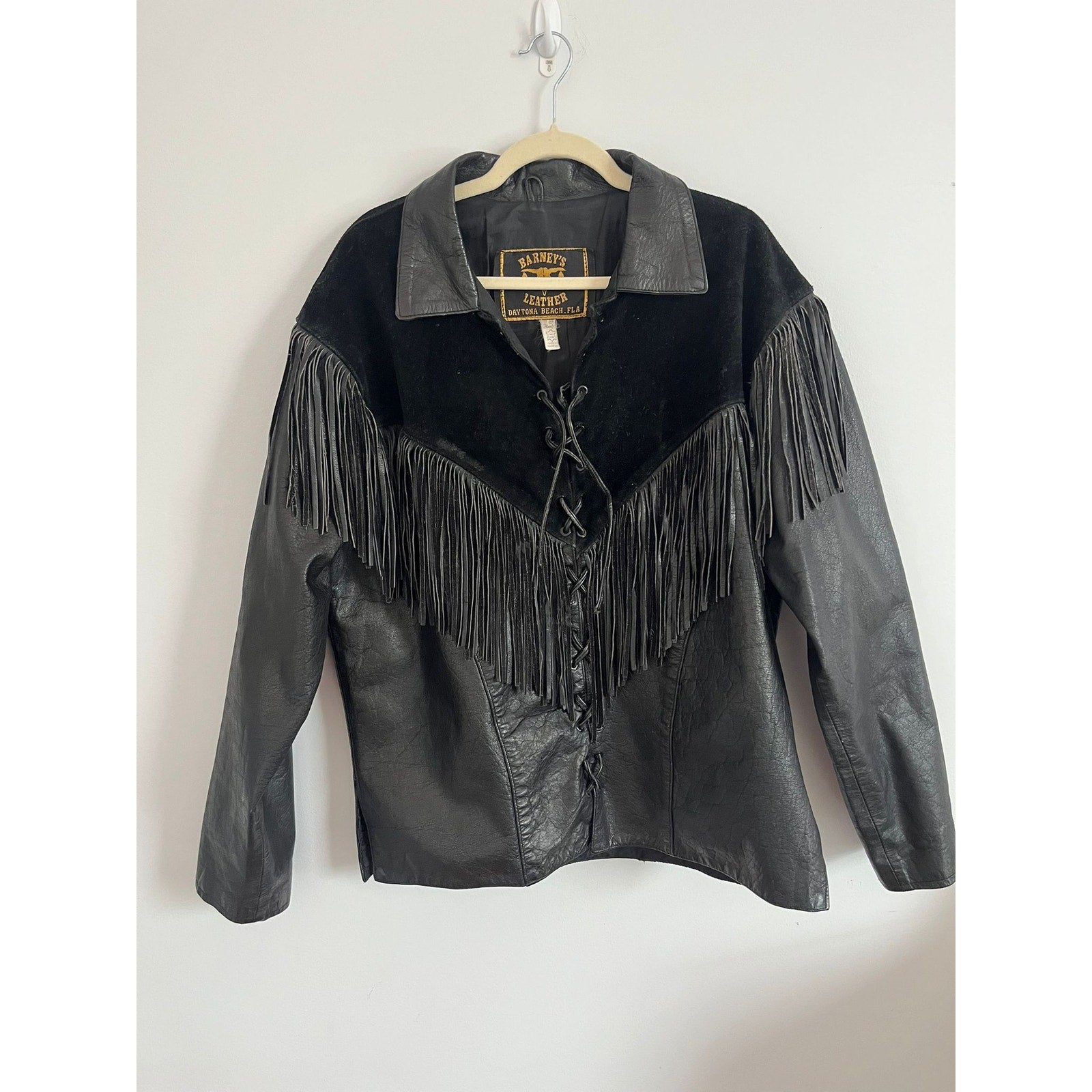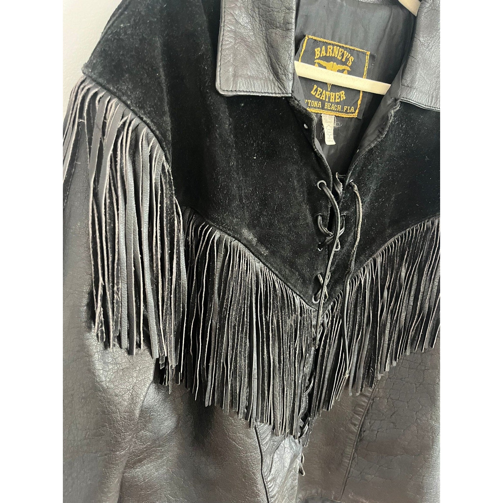 Barney’s Leather Jacket Women Large Black Fringe Western Lace Up USA Made Suede