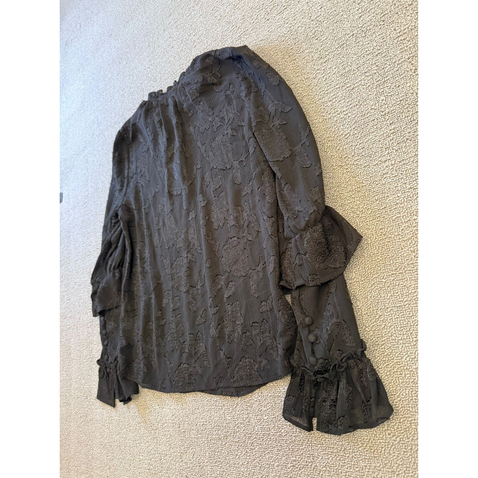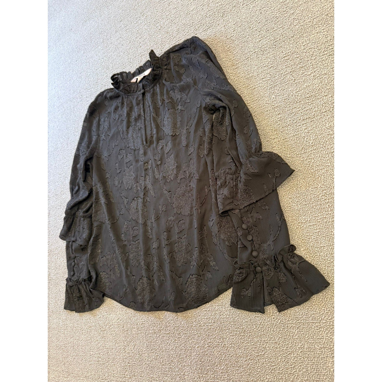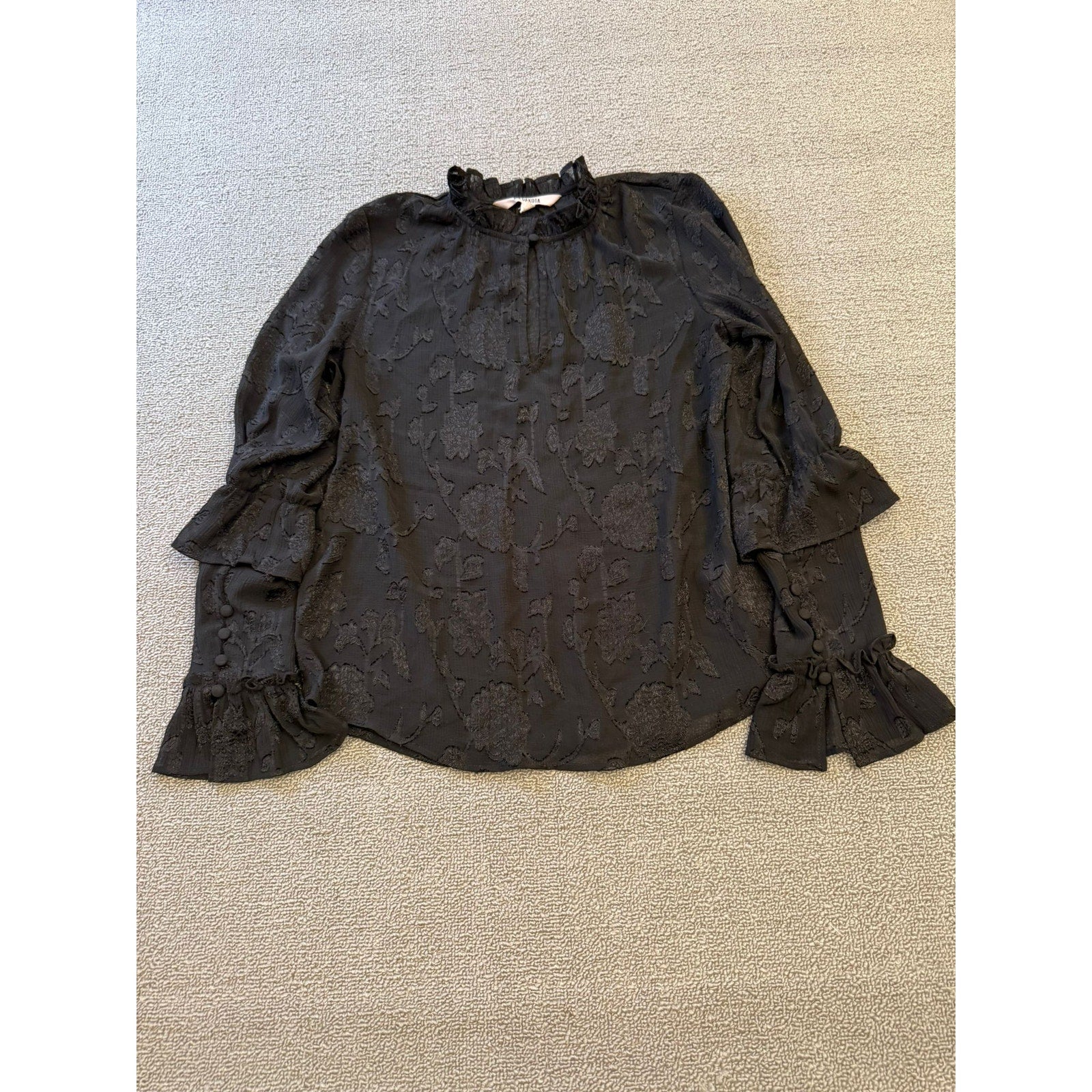 Chic black blouse by BB Dakota featuring a textured floral jacquard pattern, ruffled high neckline, and bell sleeves with fabric-covered buttons and flared cuffs—romantic and runway-ready.