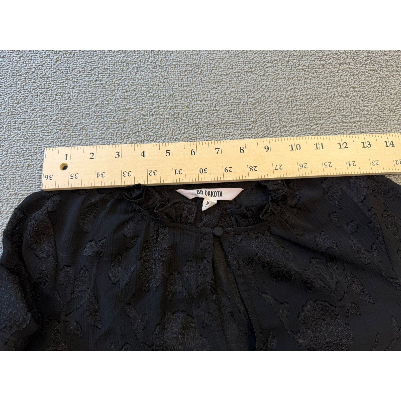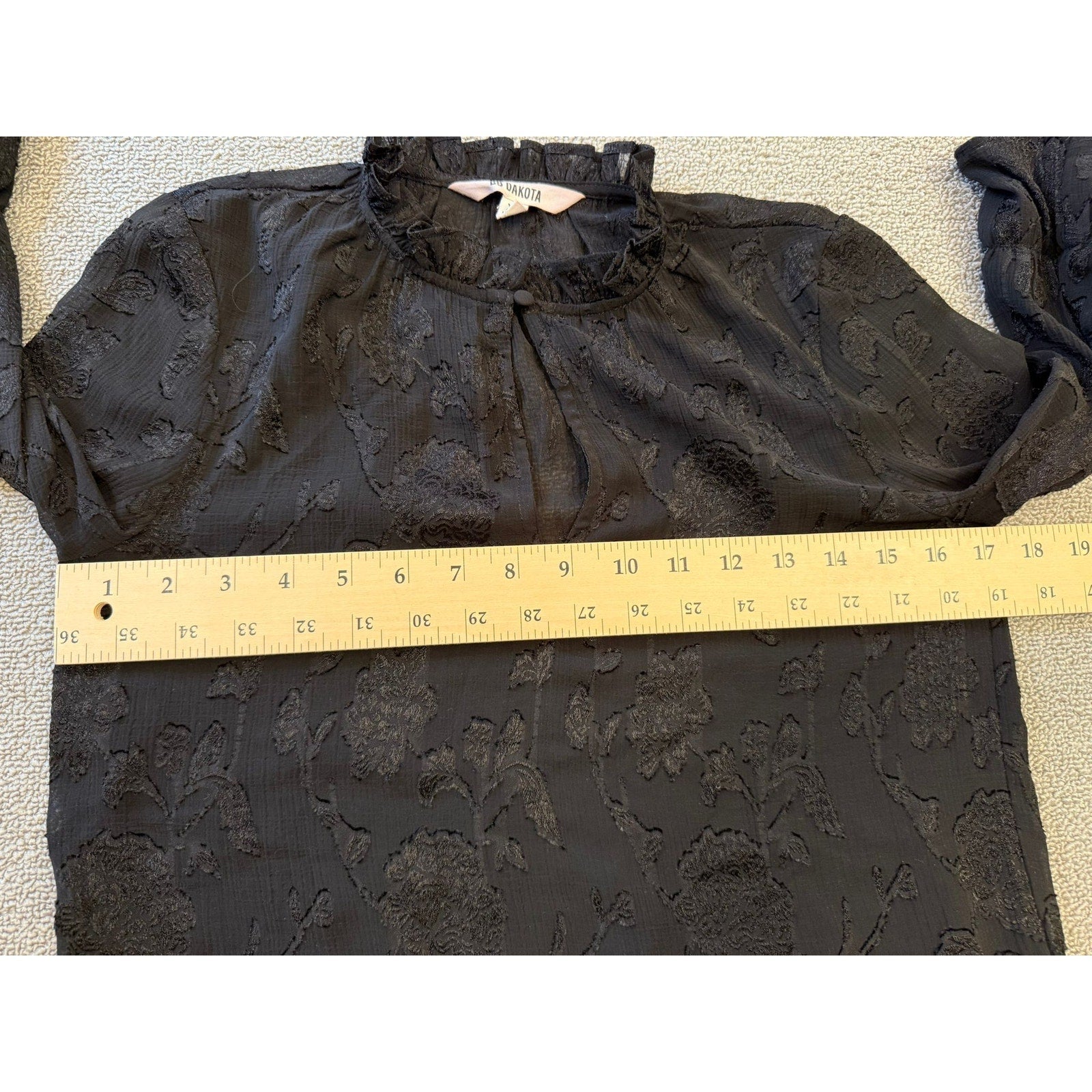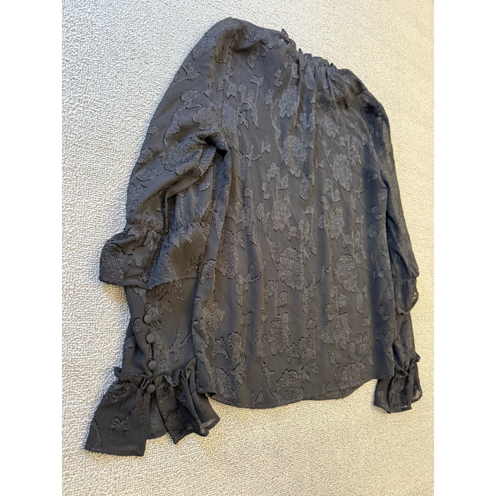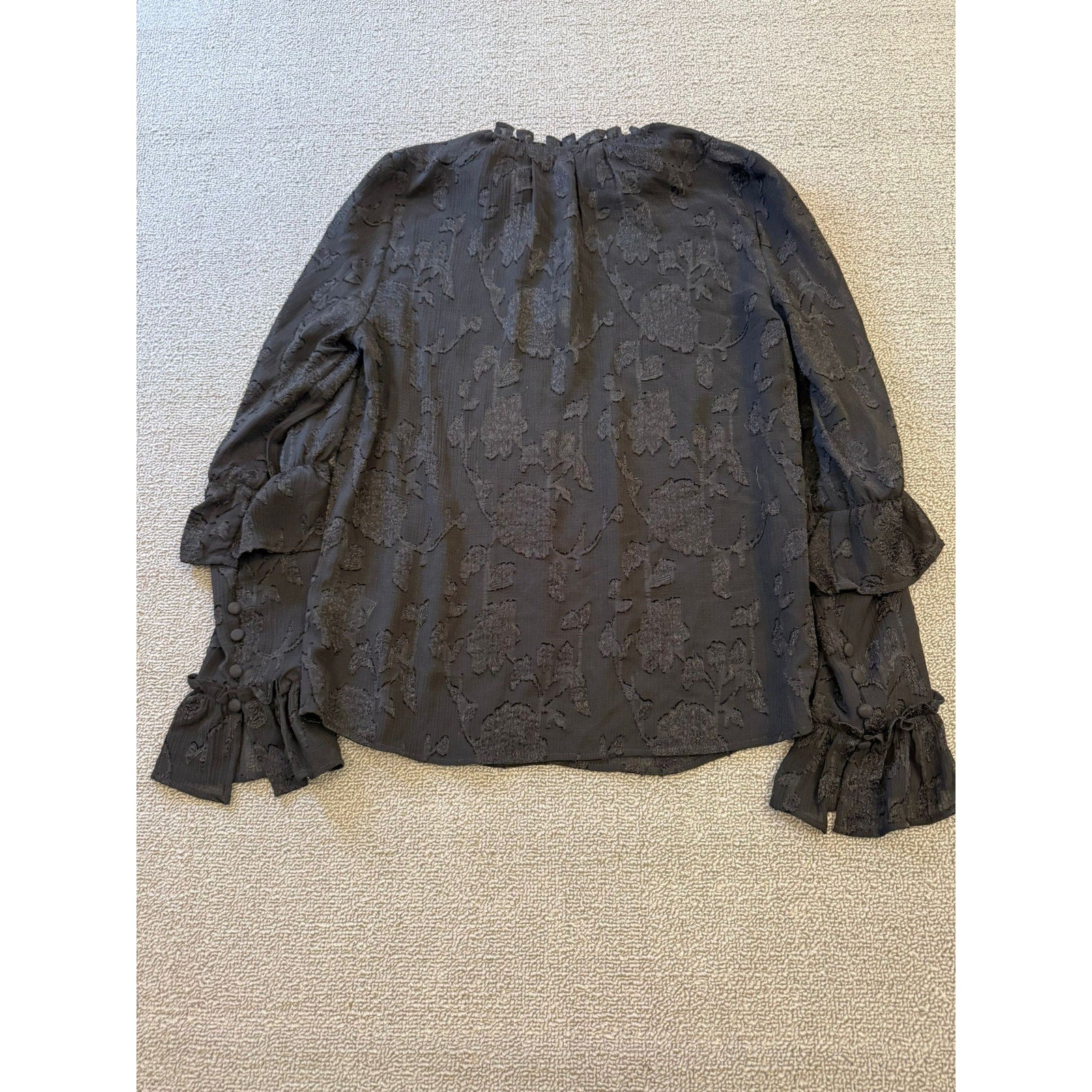 Chic black blouse by BB Dakota featuring a textured floral jacquard pattern, ruffled high neckline, and bell sleeves with fabric-covered buttons and flared cuffs—romantic and runway-ready.