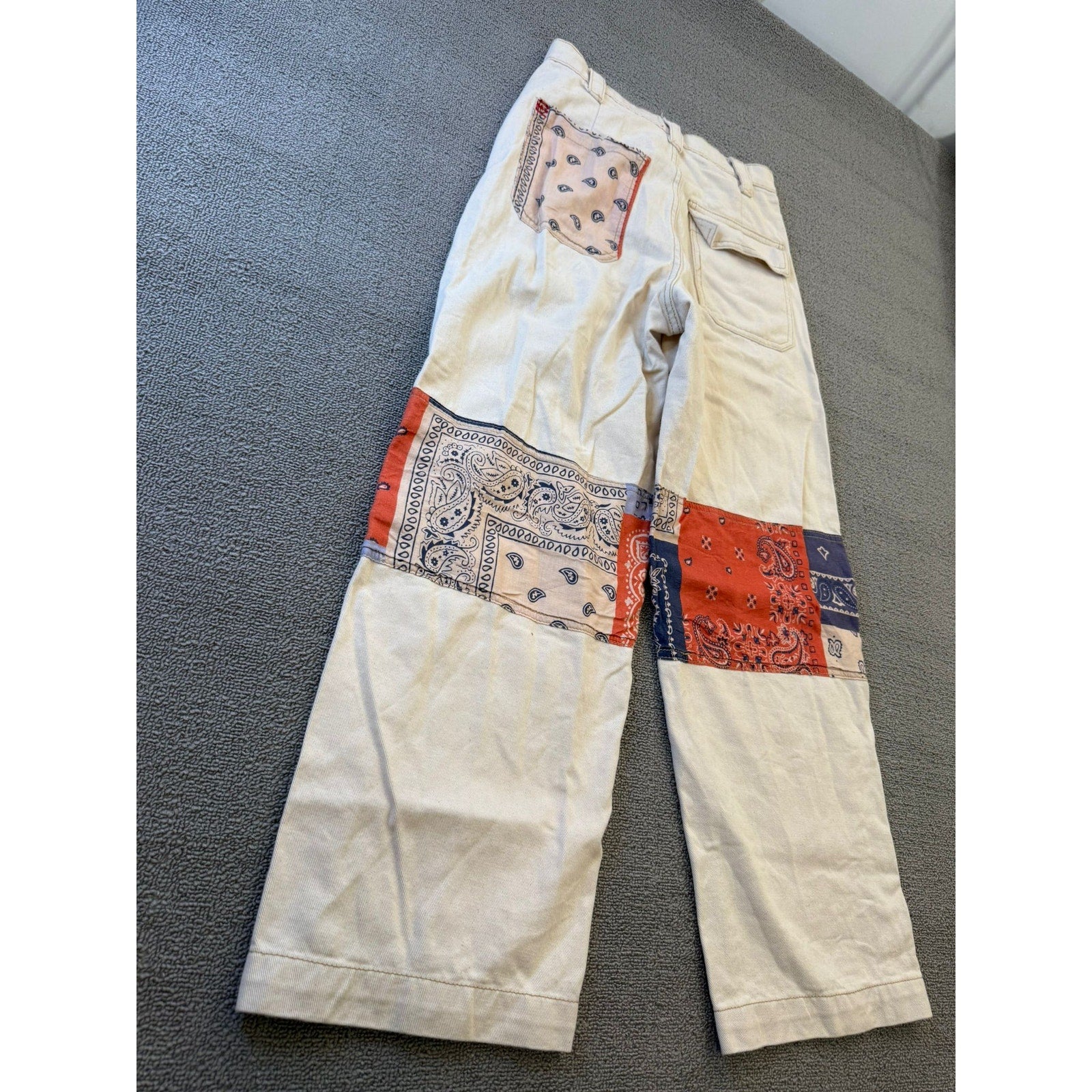 A cool, wide-leg patchwork pant by BDG via Urban Outfitters in beige, adorned with multicolor bandana-style patches across the thighs. Features include classic utility-style pockets and contrast stitching for an eclectic streetwear vibe.
