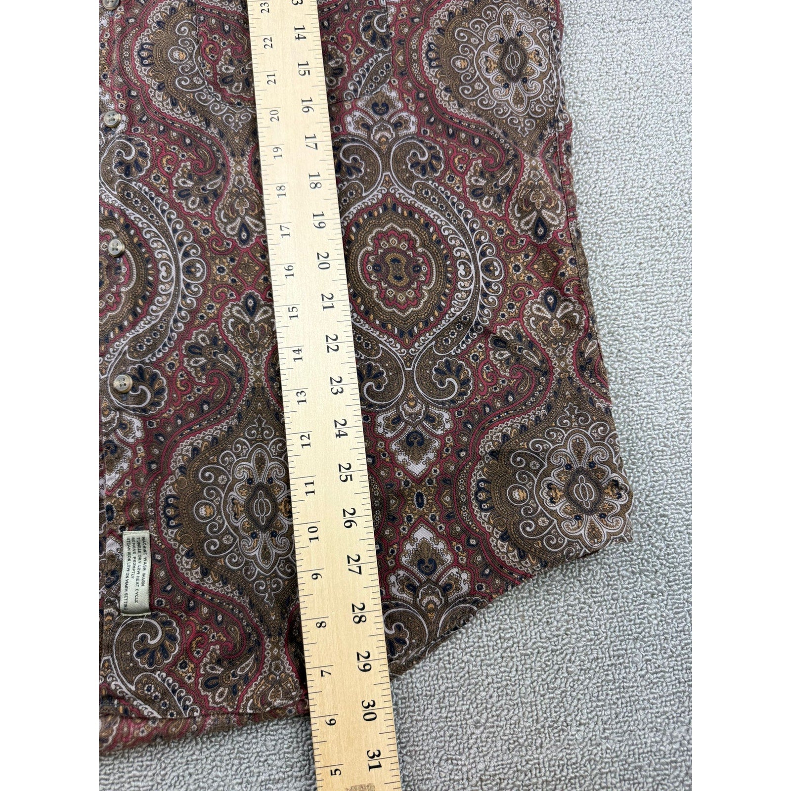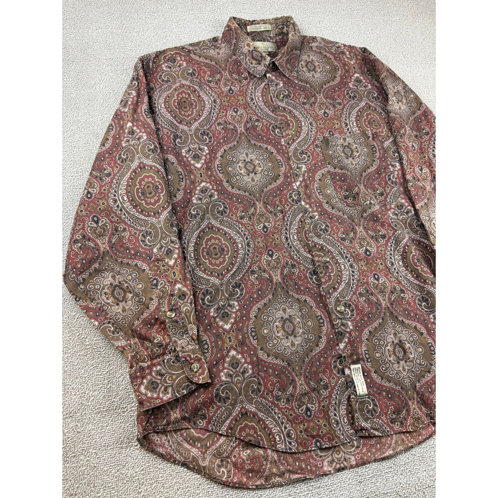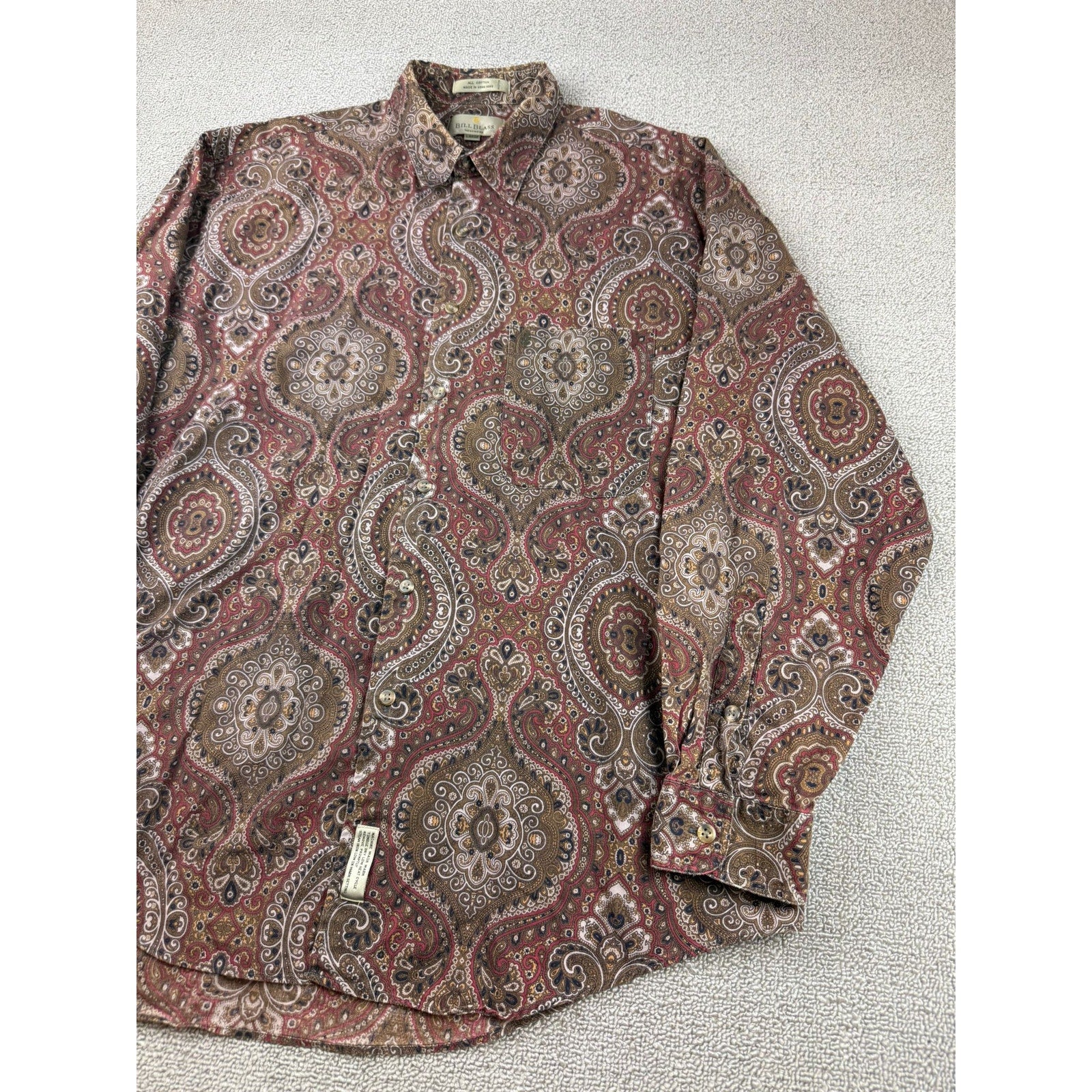 Classic vintage Bill Blass Menswear button-up shirt featuring a bold paisley print in shades of brown, red, and beige. This piece offers timeless retro style with a soft and lightweight feel. A great statement shirt for collectors or casual wear.