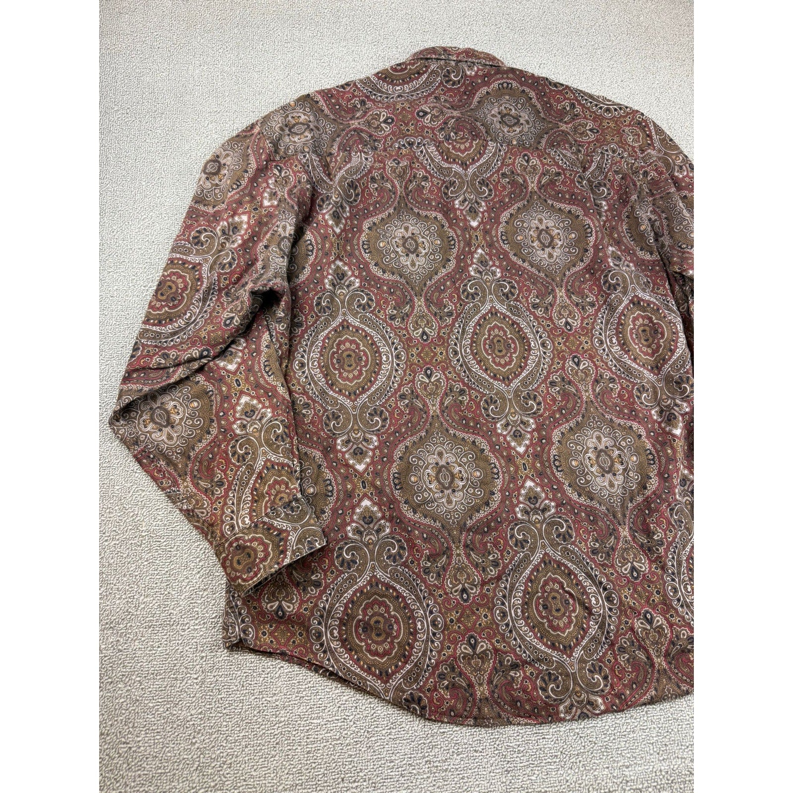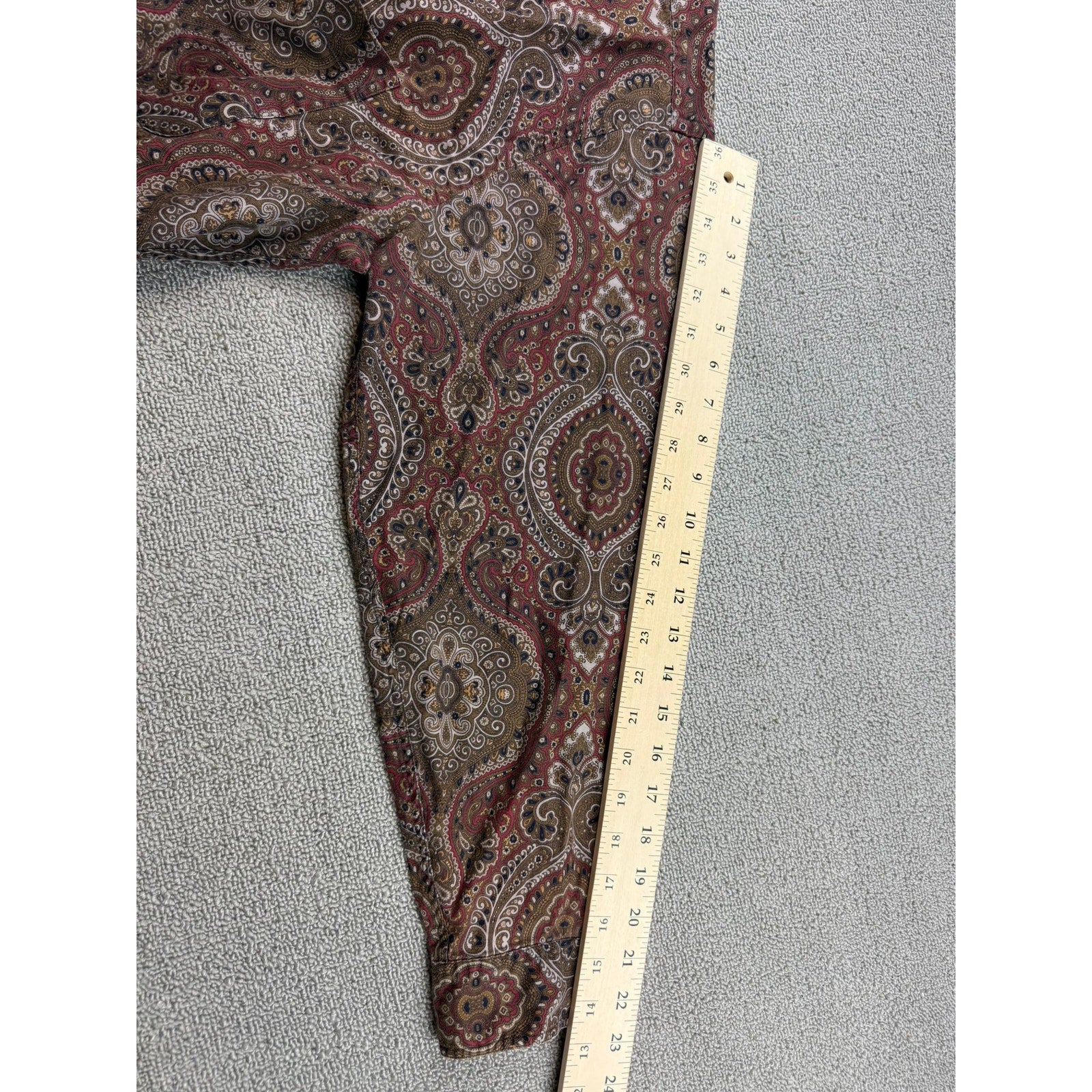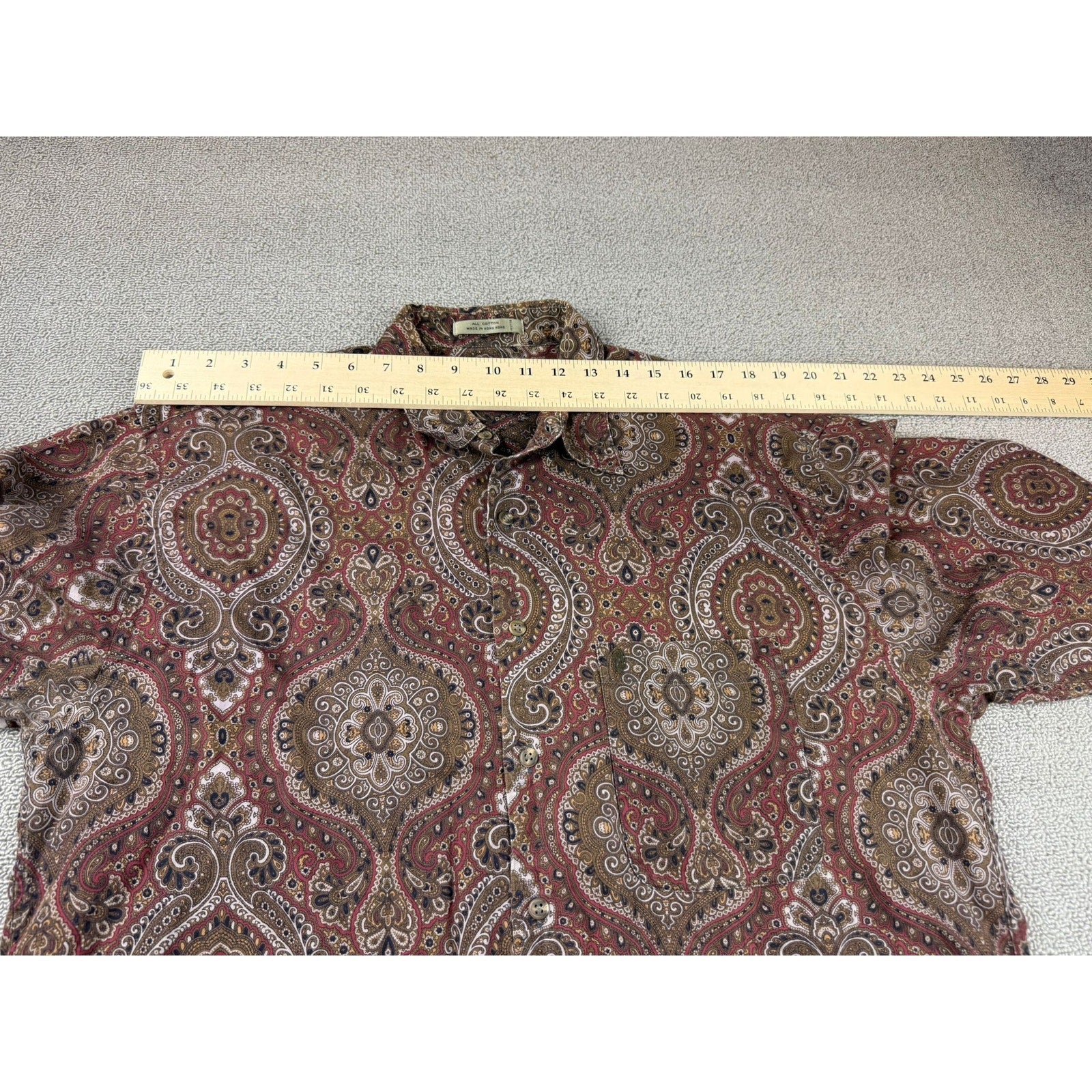 Classic vintage Bill Blass Menswear button-up shirt featuring a bold paisley print in shades of brown, red, and beige. This piece offers timeless retro style with a soft and lightweight feel. A great statement shirt for collectors or casual wear.