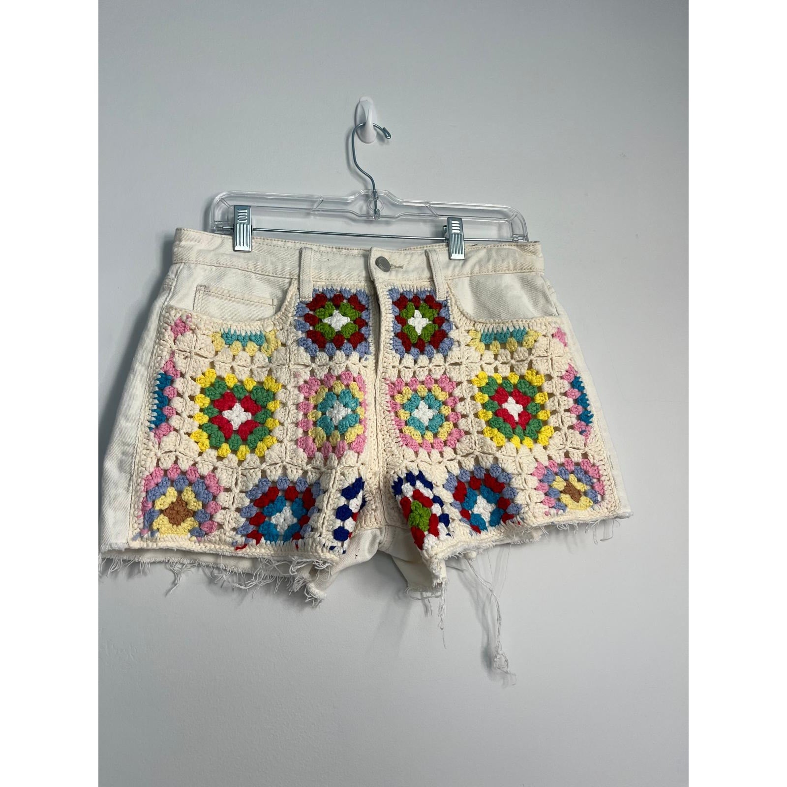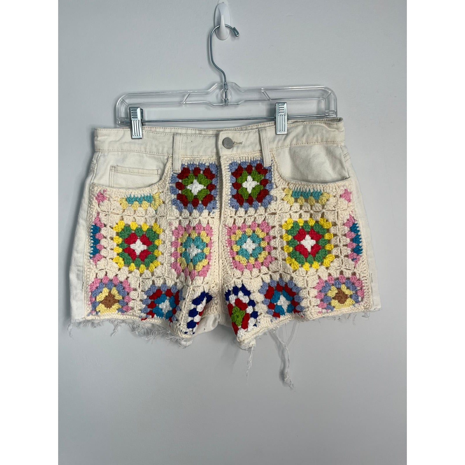 Unique and playful denim shorts with colorful hand-knit crochet patches on the front. Frayed raw hem and high-rise fit make these perfect for festivals or summer styling.