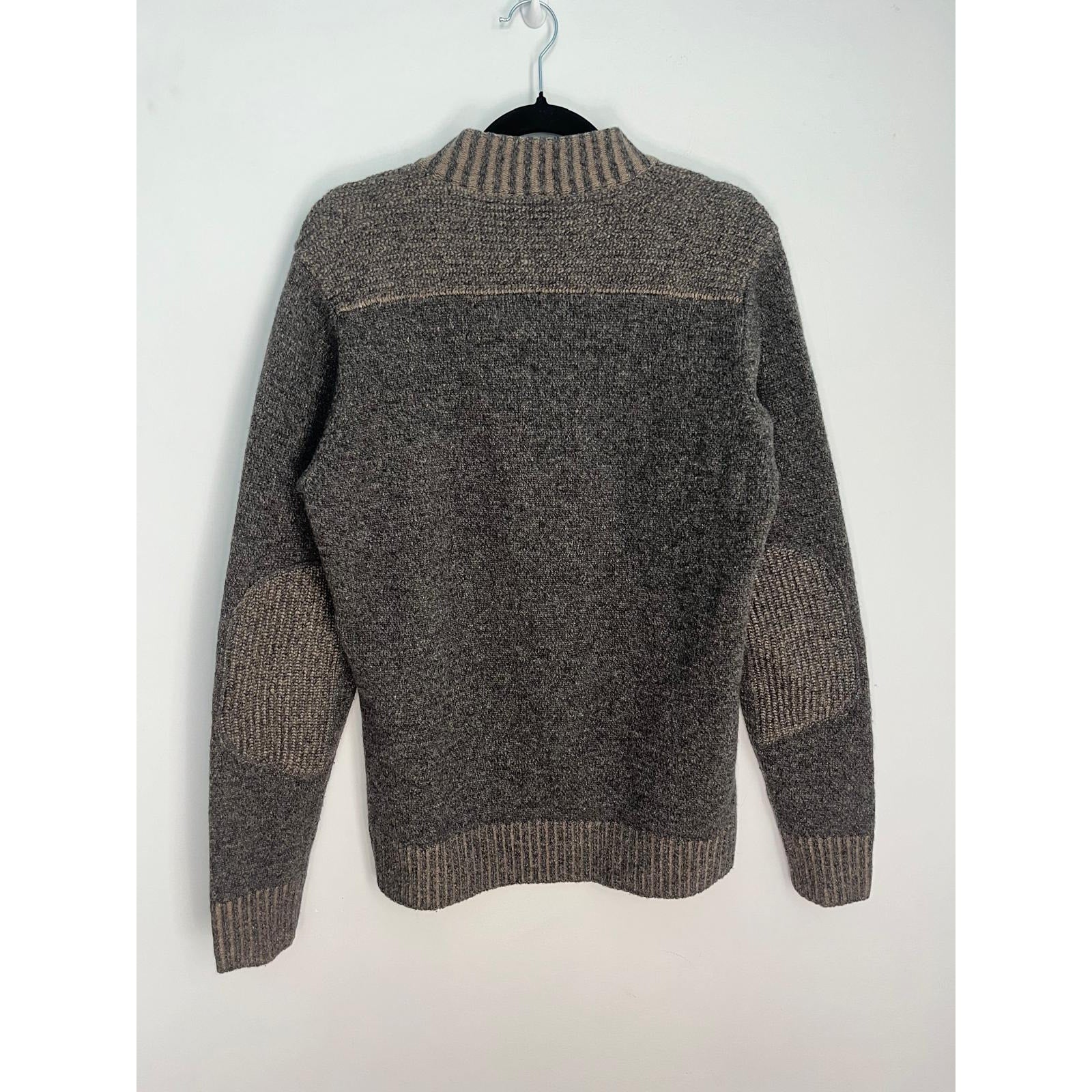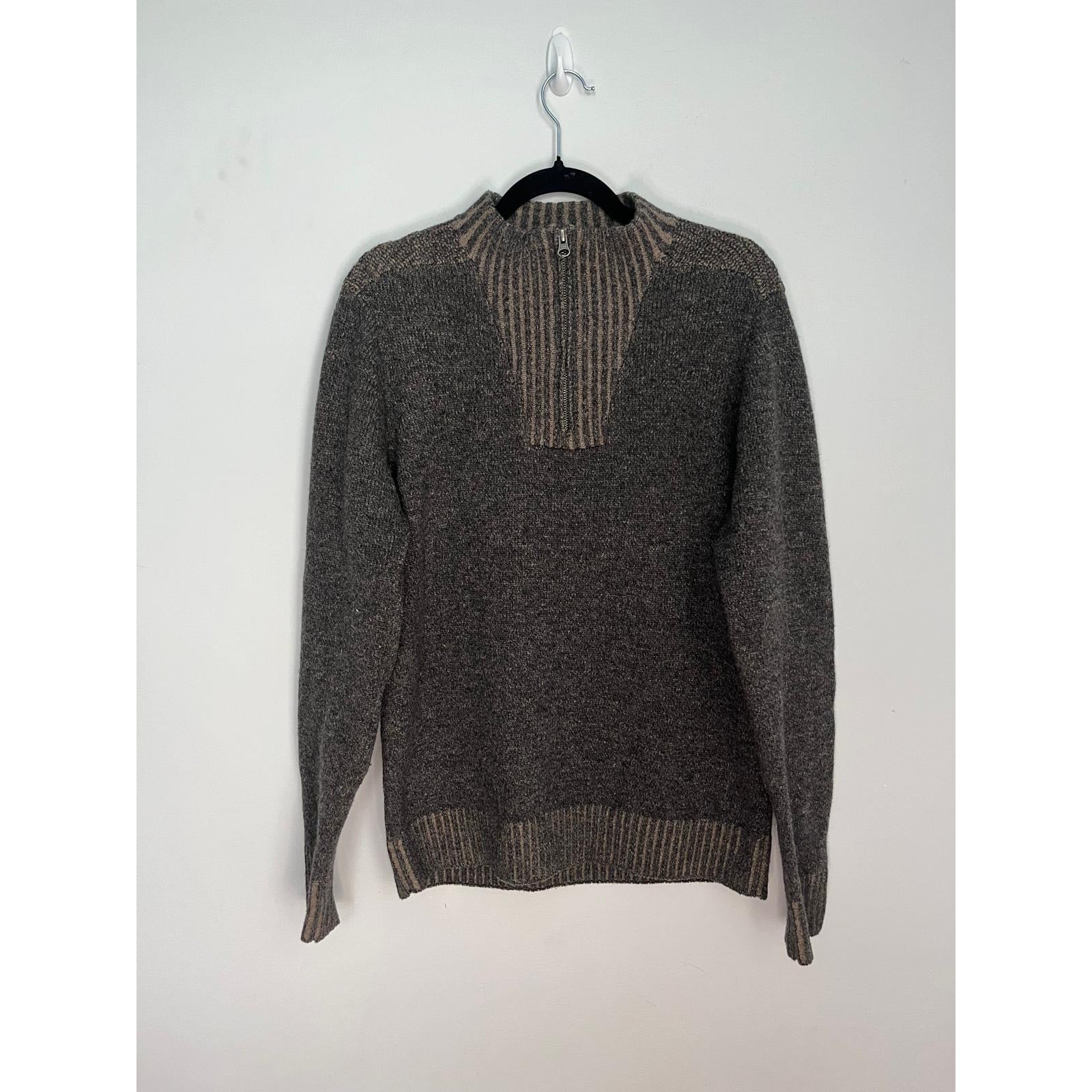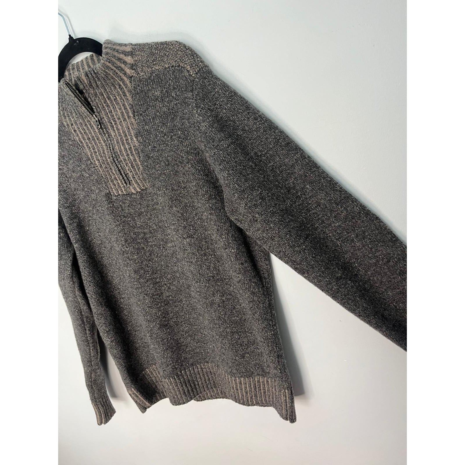 Midweight gray wool pullover sweater with contrast ribbed knit trim and zip-up mock neck. Classic cold-weather essential with natural texture and warm construction.