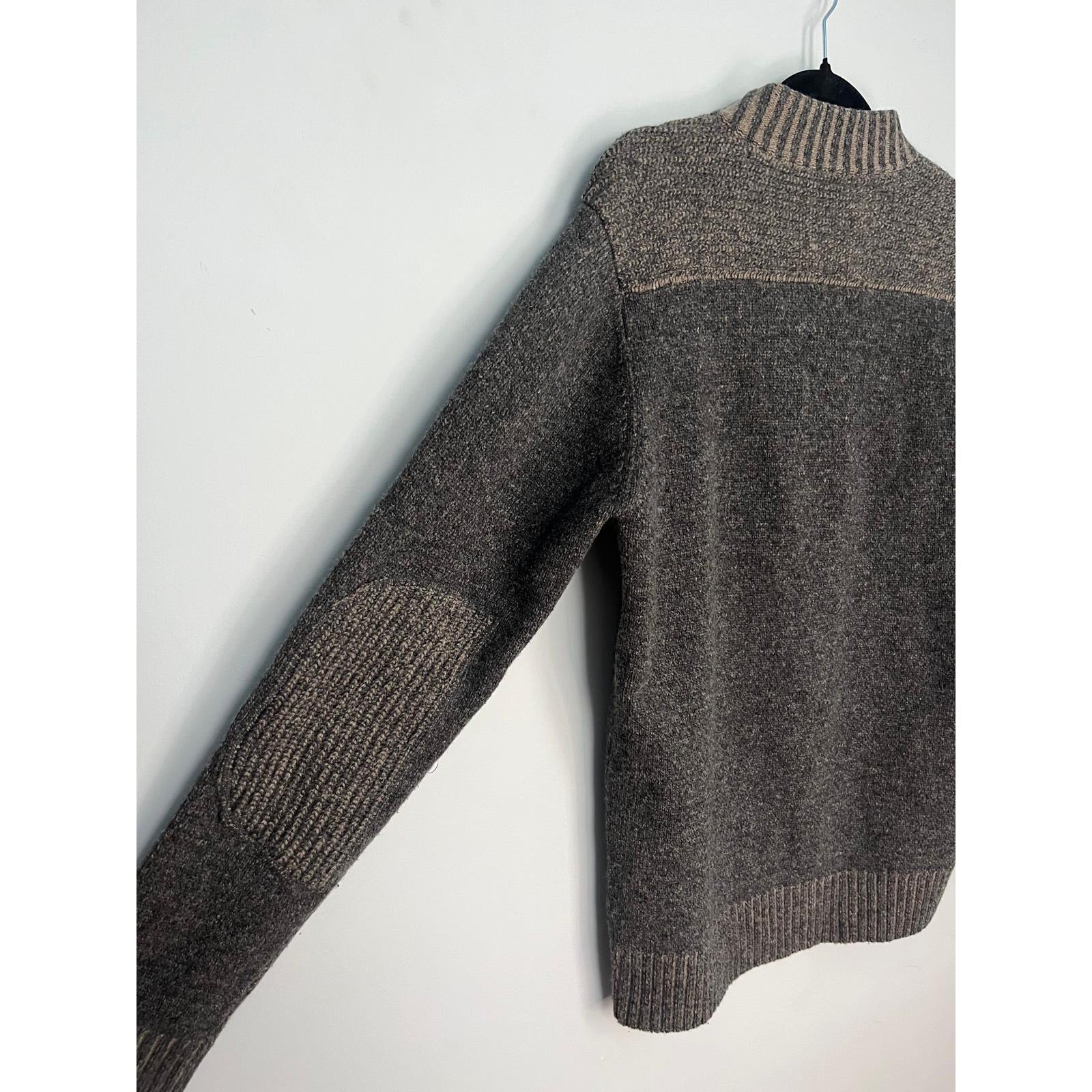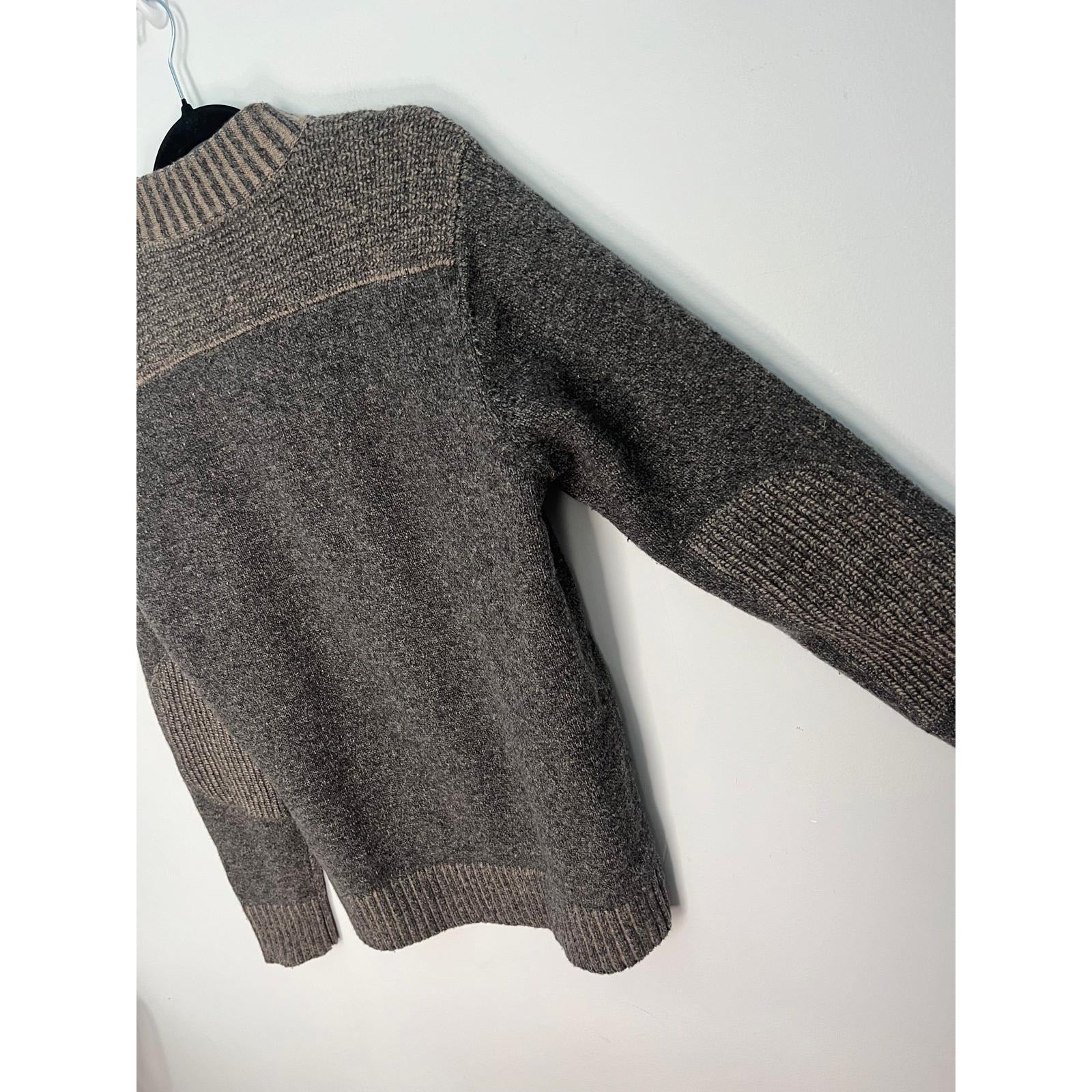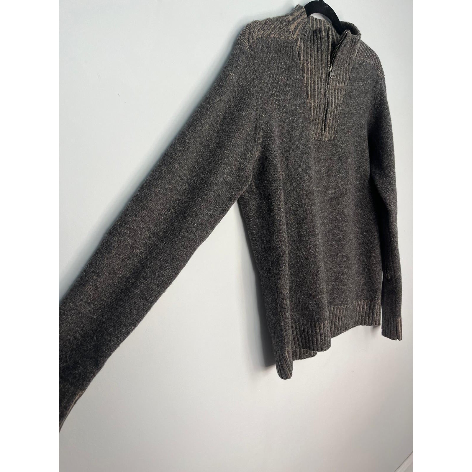 Midweight gray wool pullover sweater with contrast ribbed knit trim and zip-up mock neck. Classic cold-weather essential with natural texture and warm construction.