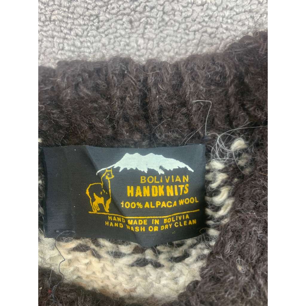 Bolivian Handknits sweater in beige Women M. Made of 100% alpaca wool. Crewneck pullover with hand-knit yoke pattern—great for cold-weather layering and casual wear.