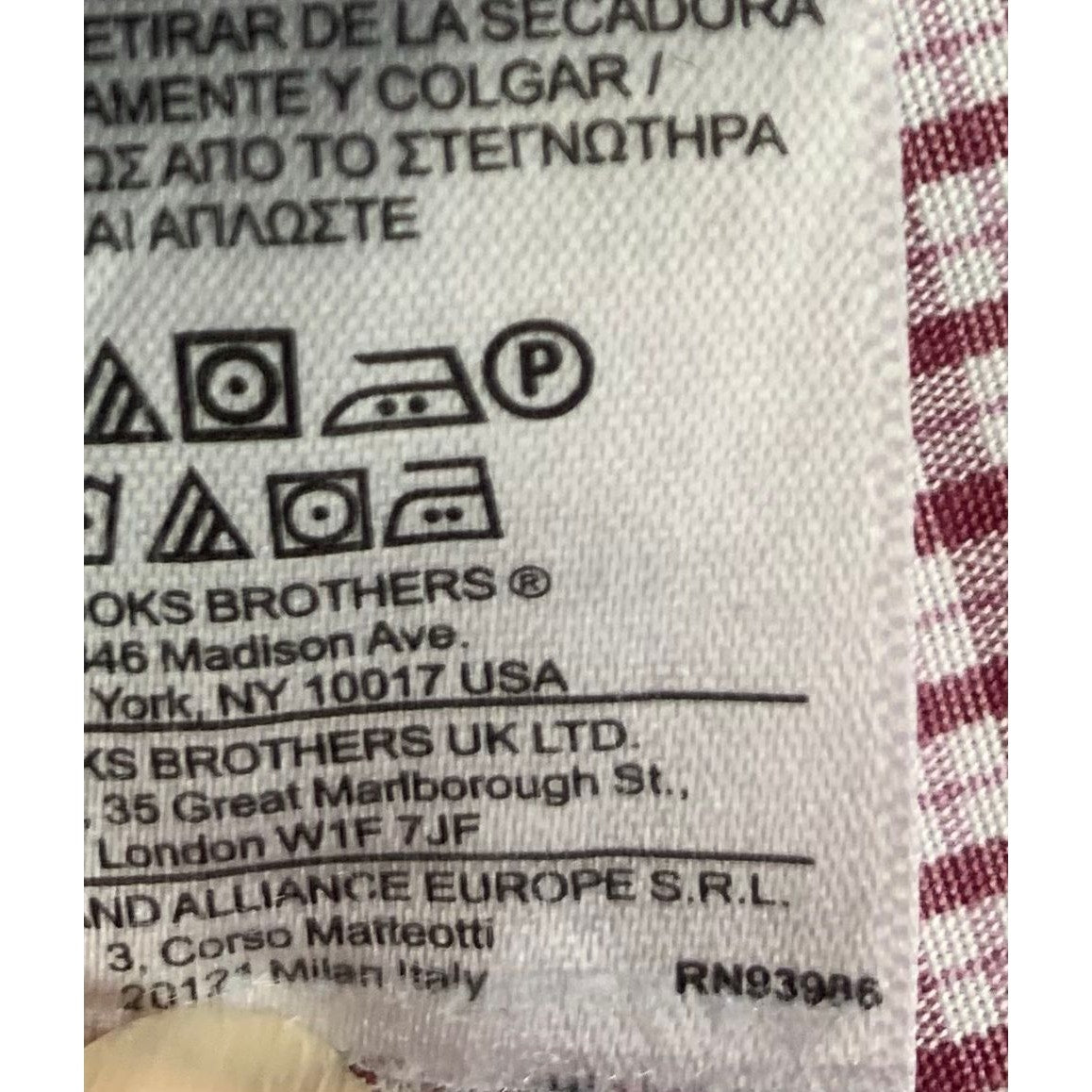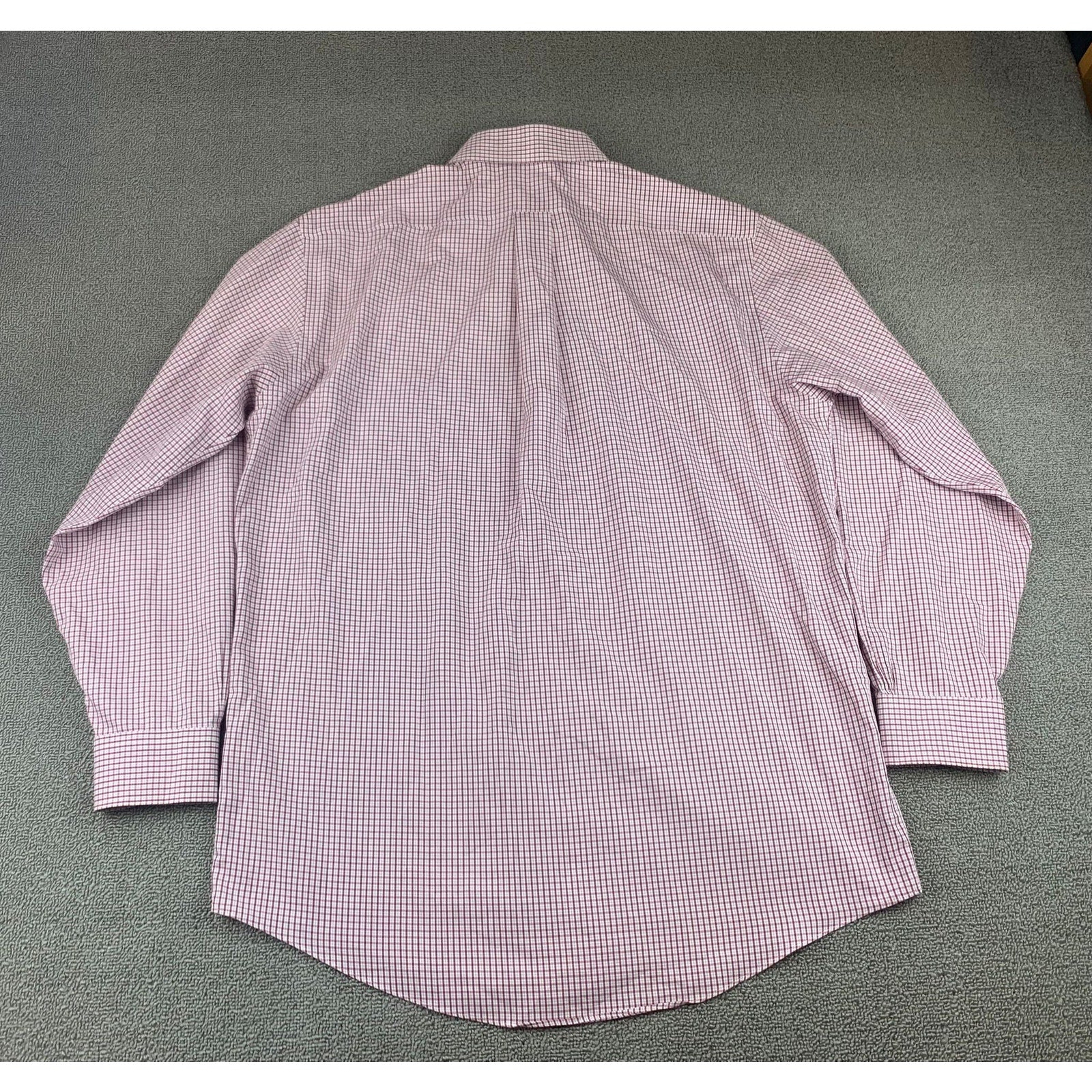 Classic Brooks Brothers non-iron dress shirt in red and white gingham. Point collar, long sleeves, chest pocket and curved hem; smooth Supima cotton with crisp, easy-care finish.
