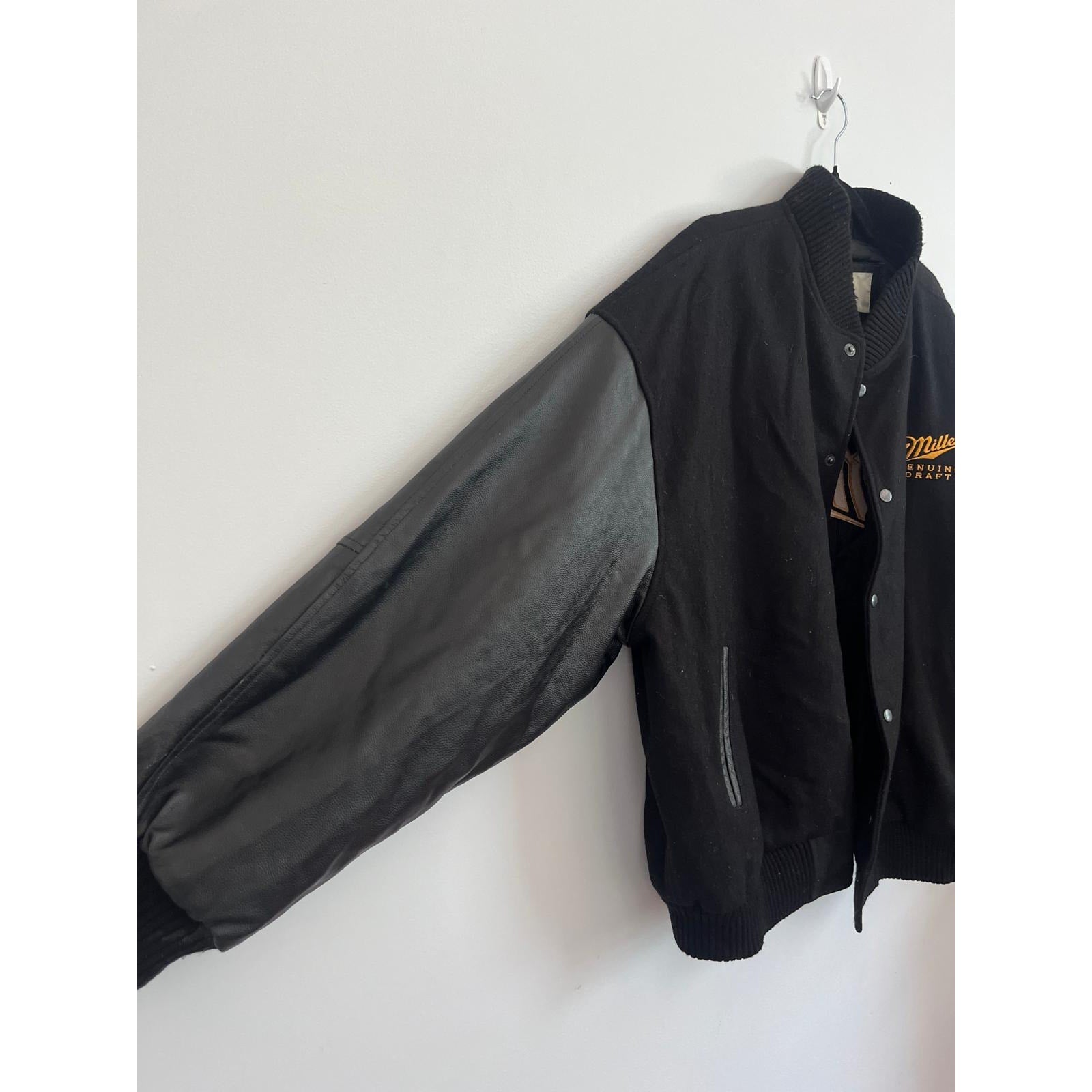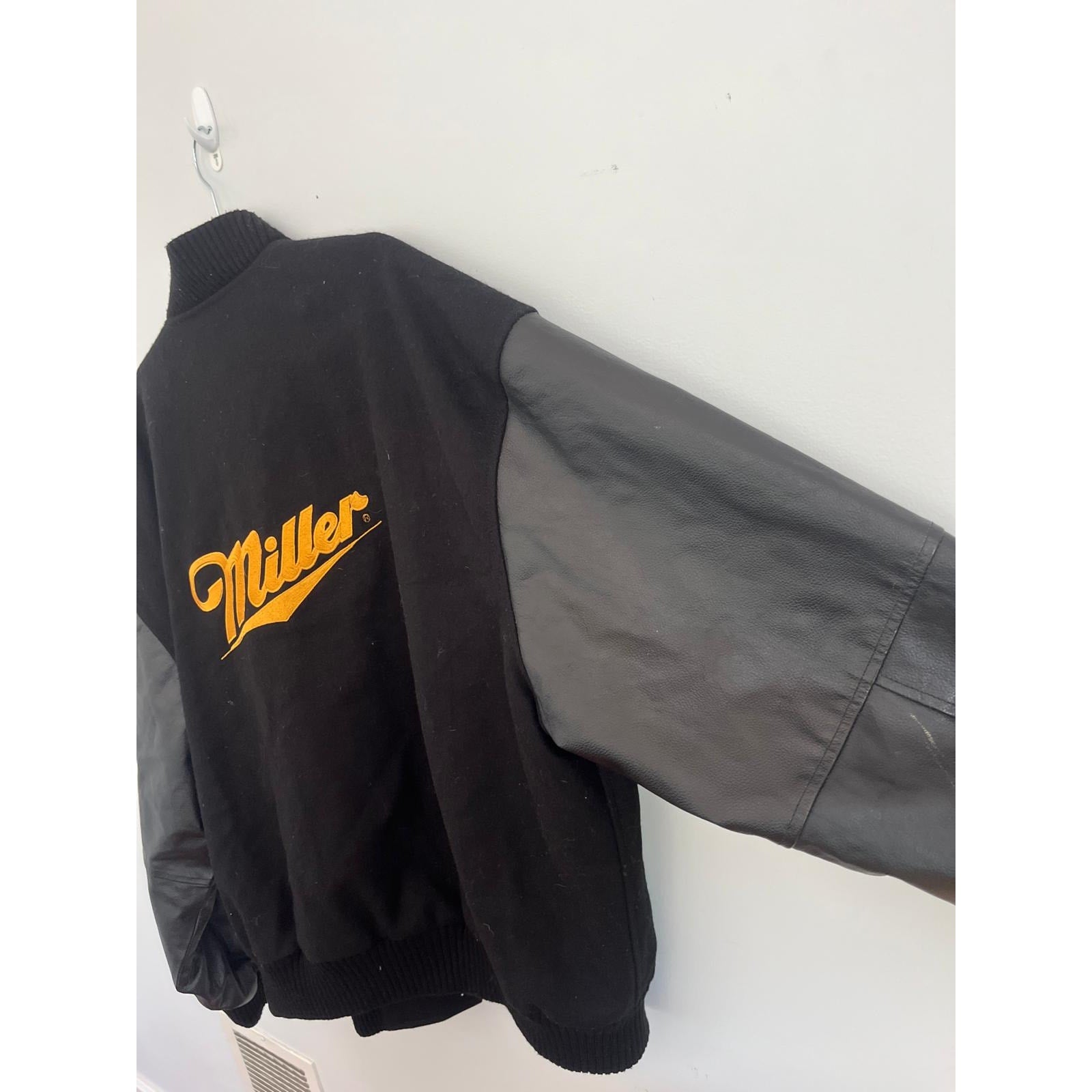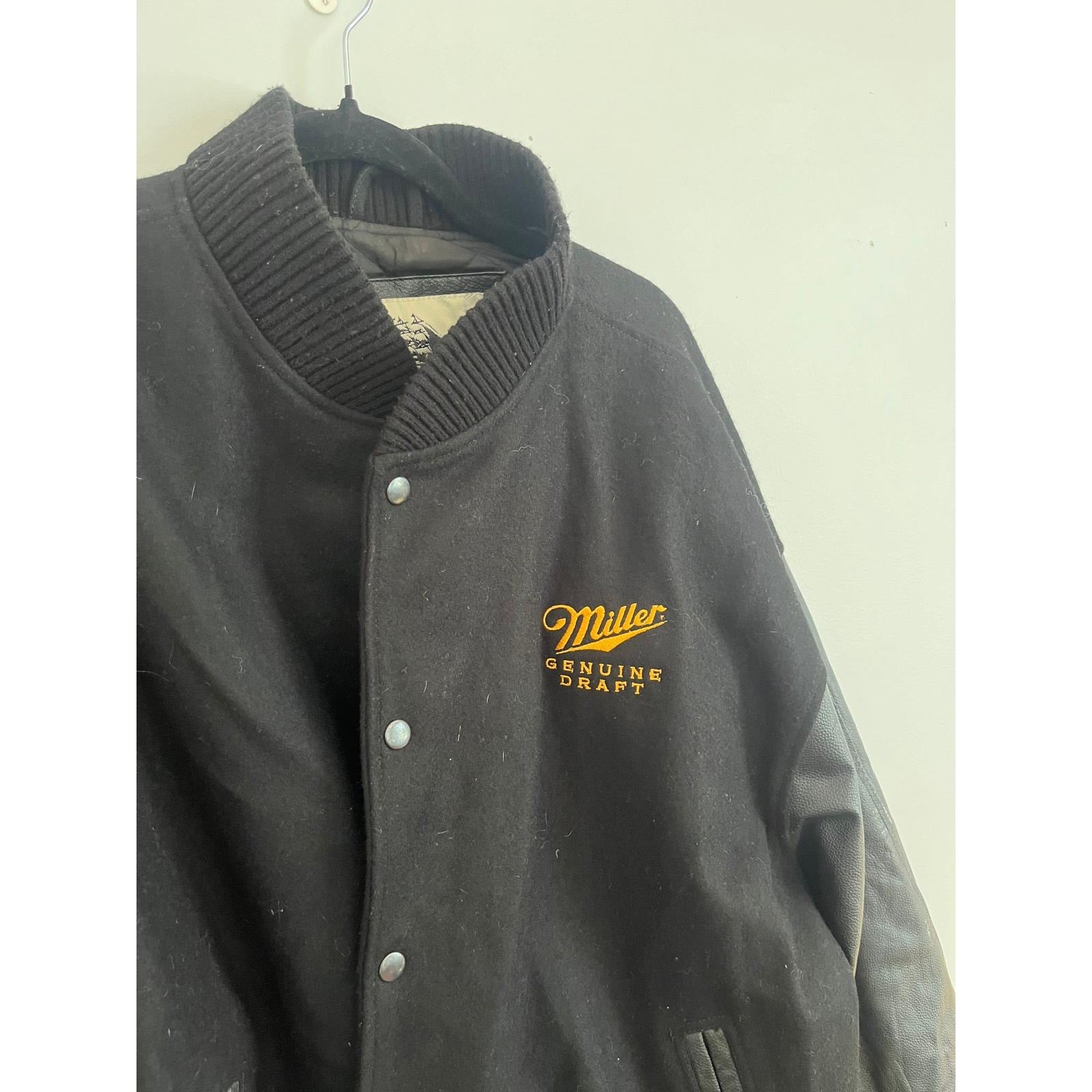 Vintage Burk's Bay varsity-style bomber jacket featuring Miller Genuine Draft embroidery on the front and sleeve. Constructed with a wool body and leather sleeves. Snap button closure, ribbed knit cuffs and hem, and two front pockets.