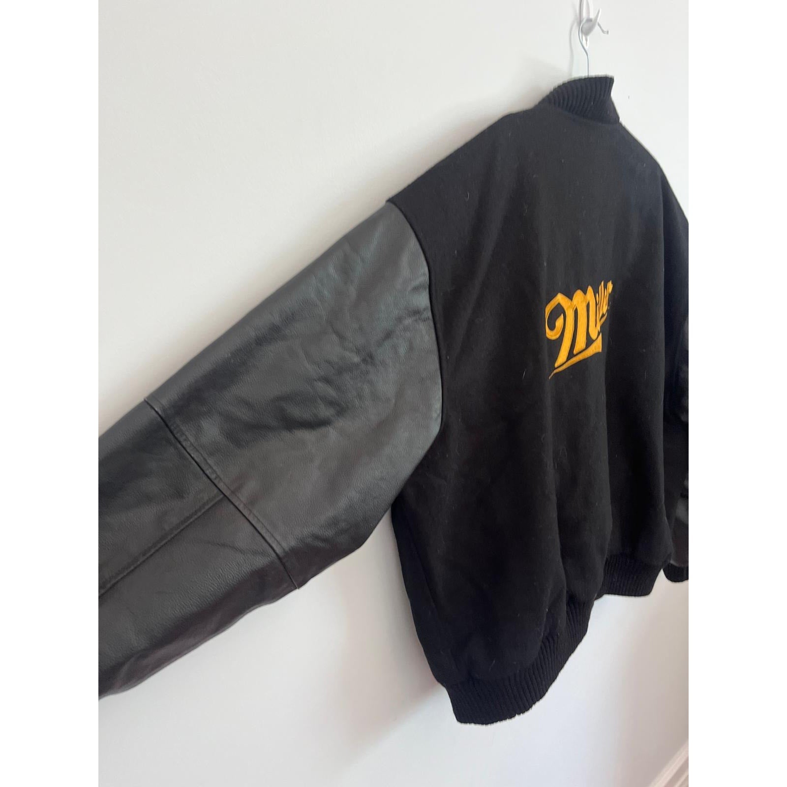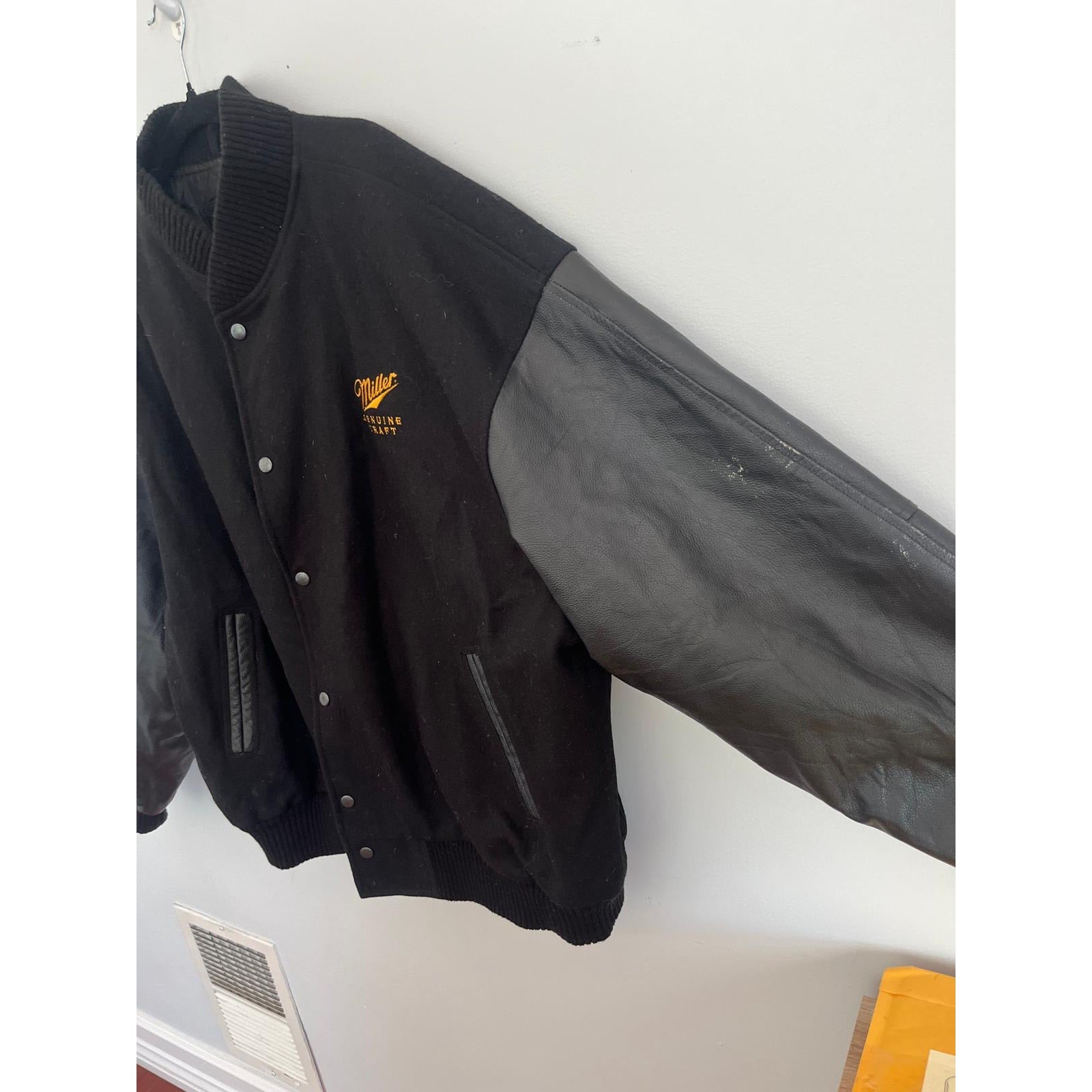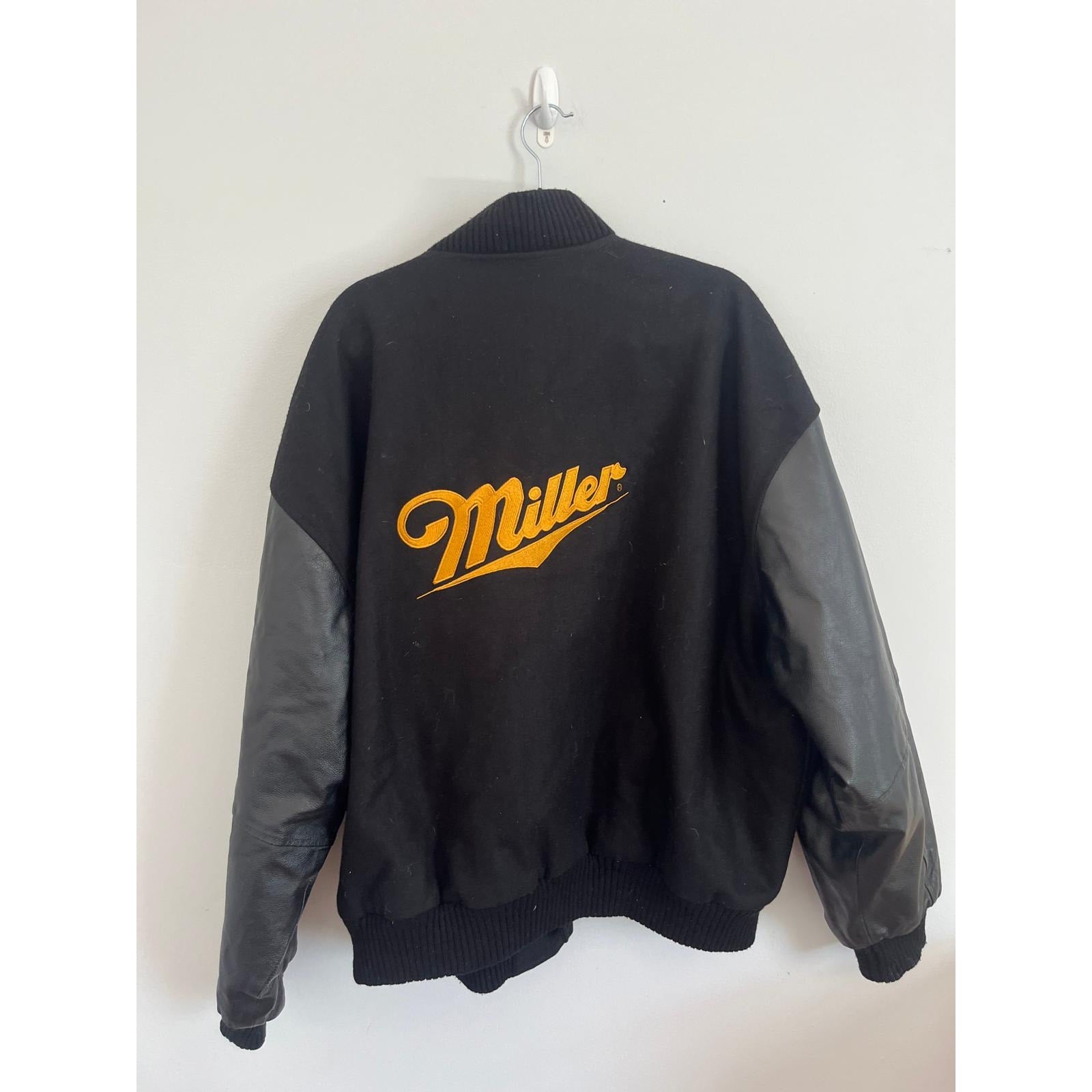 Vintage Burk's Bay varsity-style bomber jacket featuring Miller Genuine Draft embroidery on the front and sleeve. Constructed with a wool body and leather sleeves. Snap button closure, ribbed knit cuffs and hem, and two front pockets.