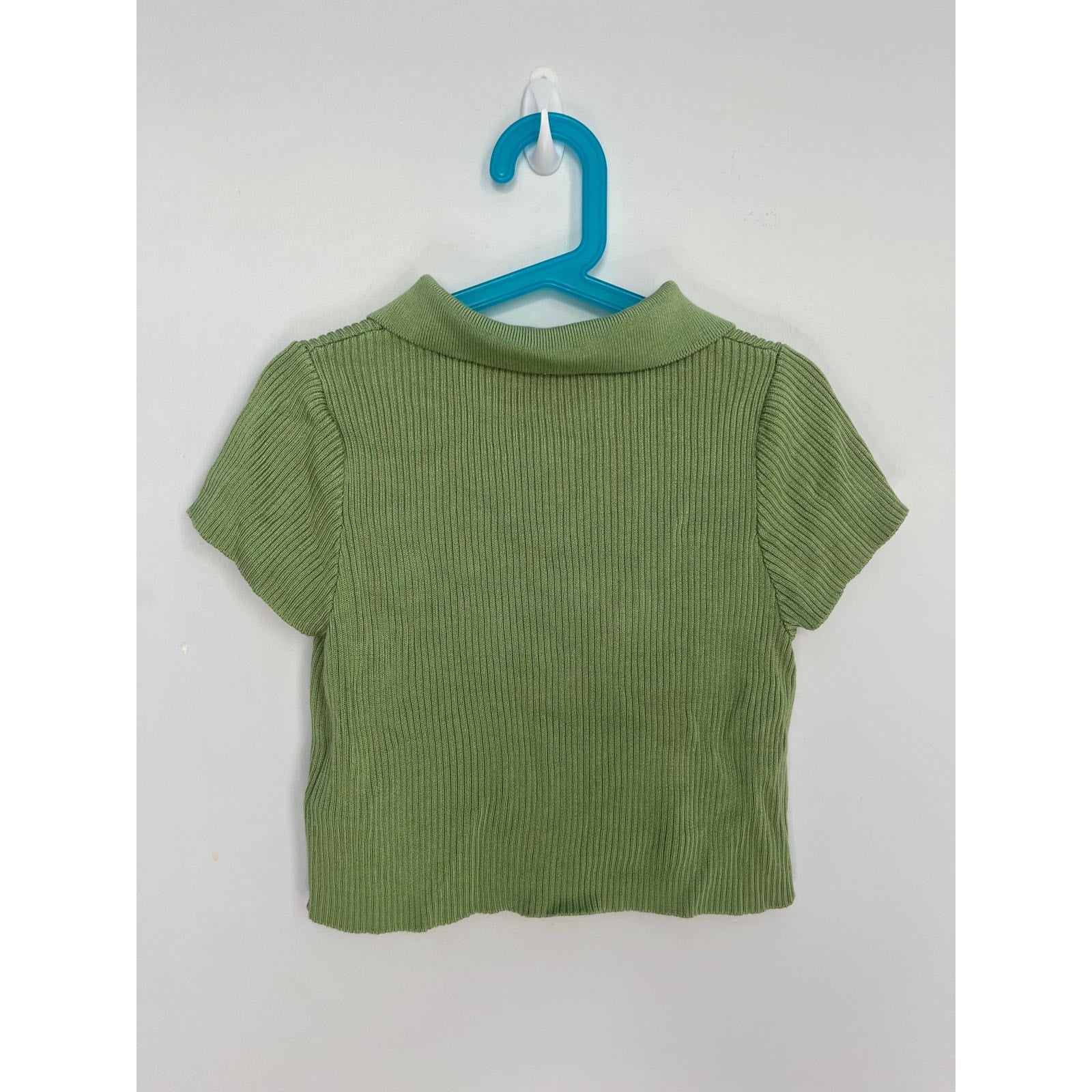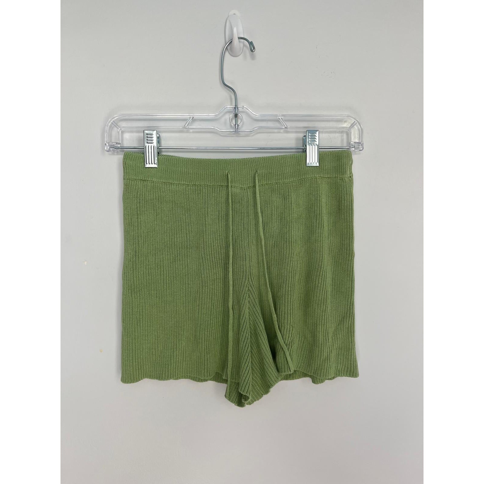 Ribbed knit two piece set featuring a cropped short sleeve button-down top and matching high waist knit shorts. Soft sage green with stretch and a casual lounge style.