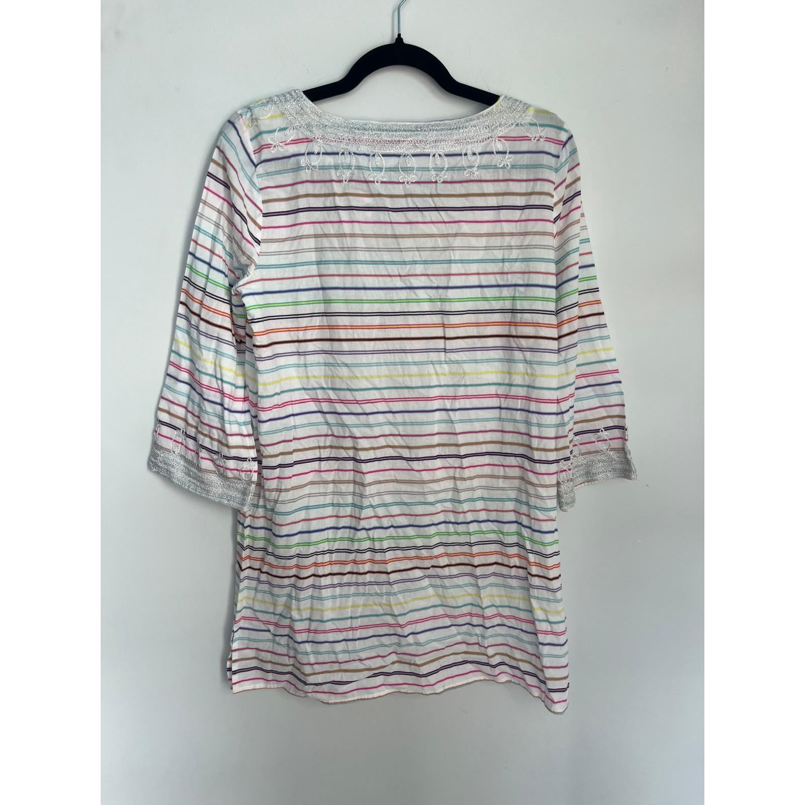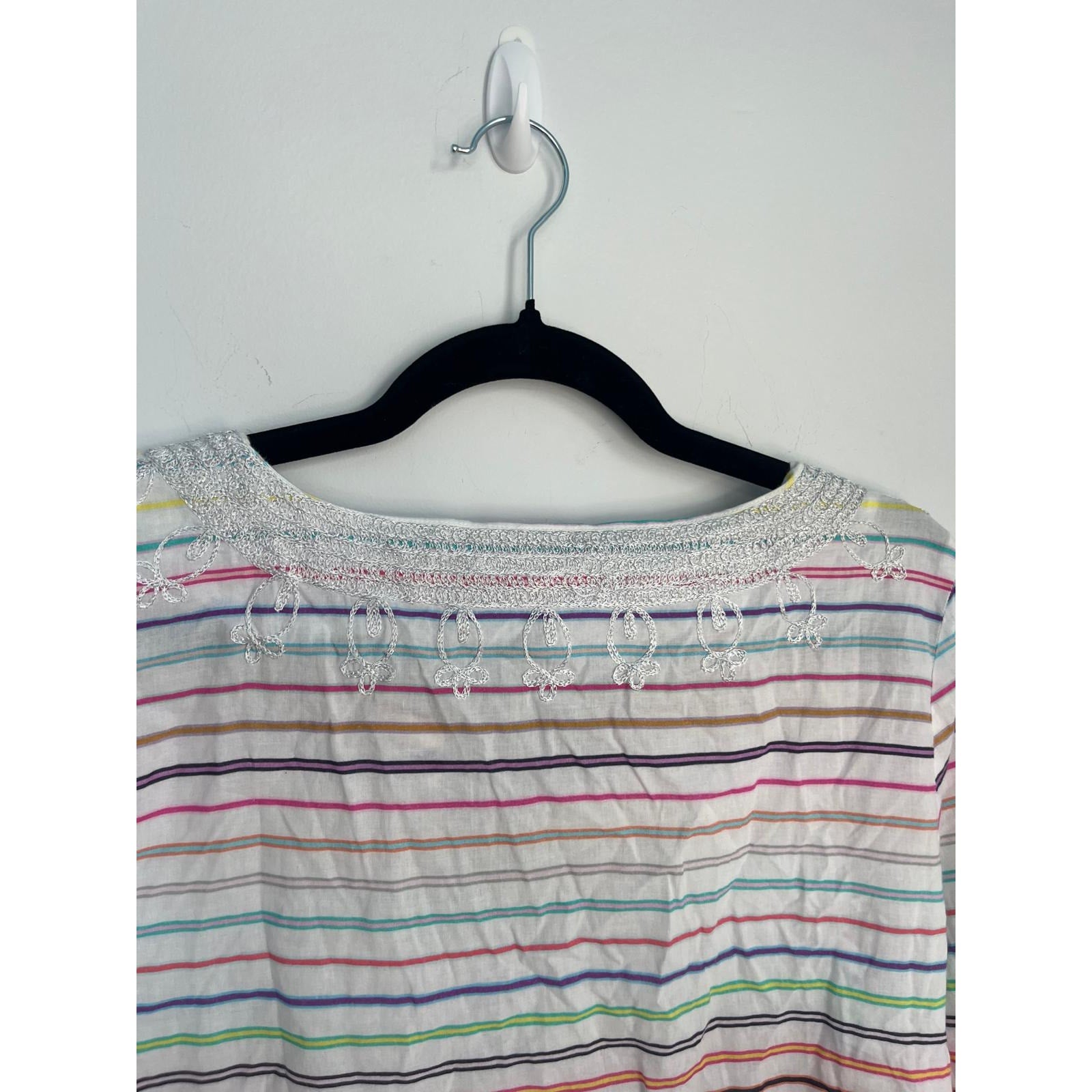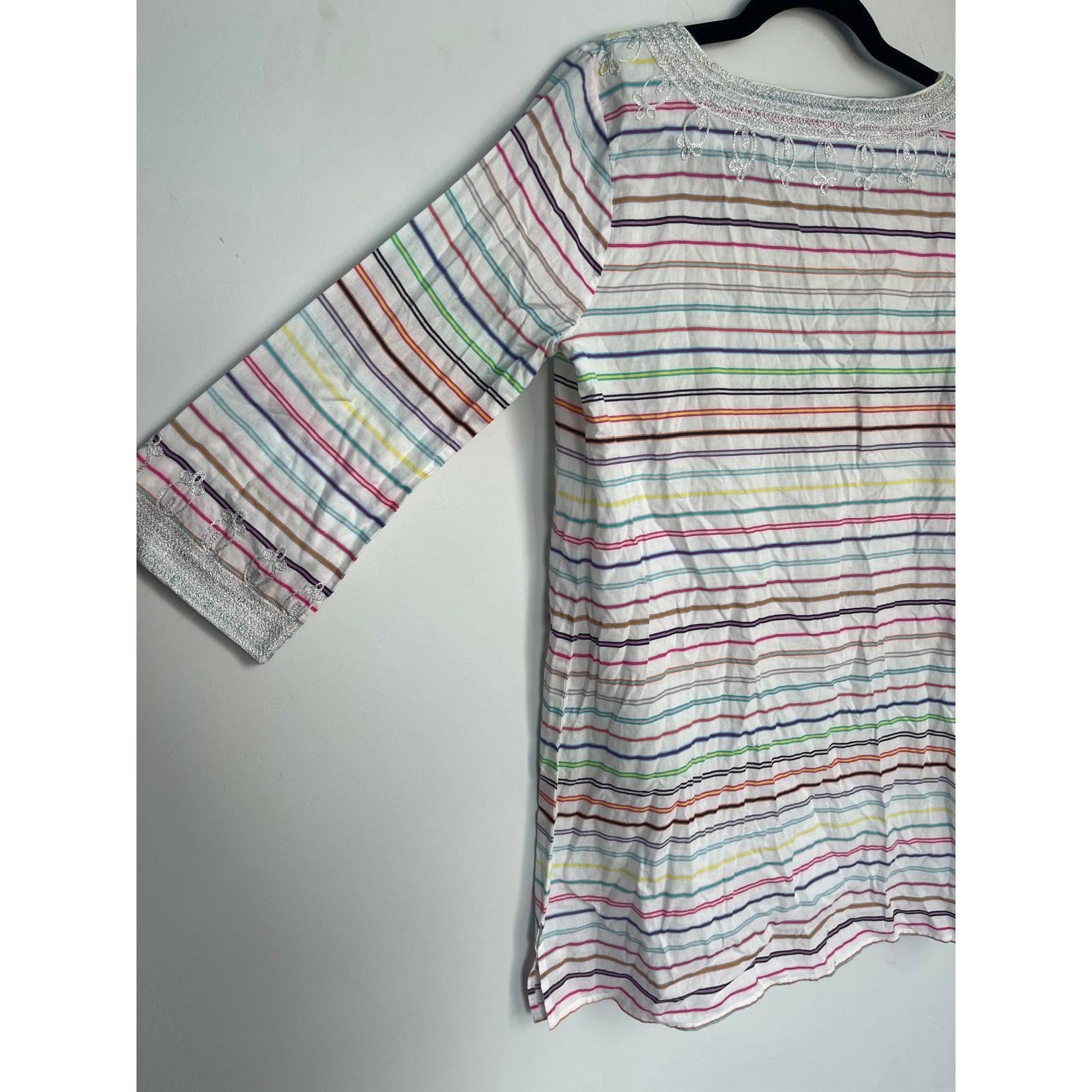 Lightweight boho-style tunic featuring colorful horizontal stripes and silver metallic embroidery at the neckline and cuffs. Relaxed fit with 3/4 sleeves and subtle slits at the hem.
