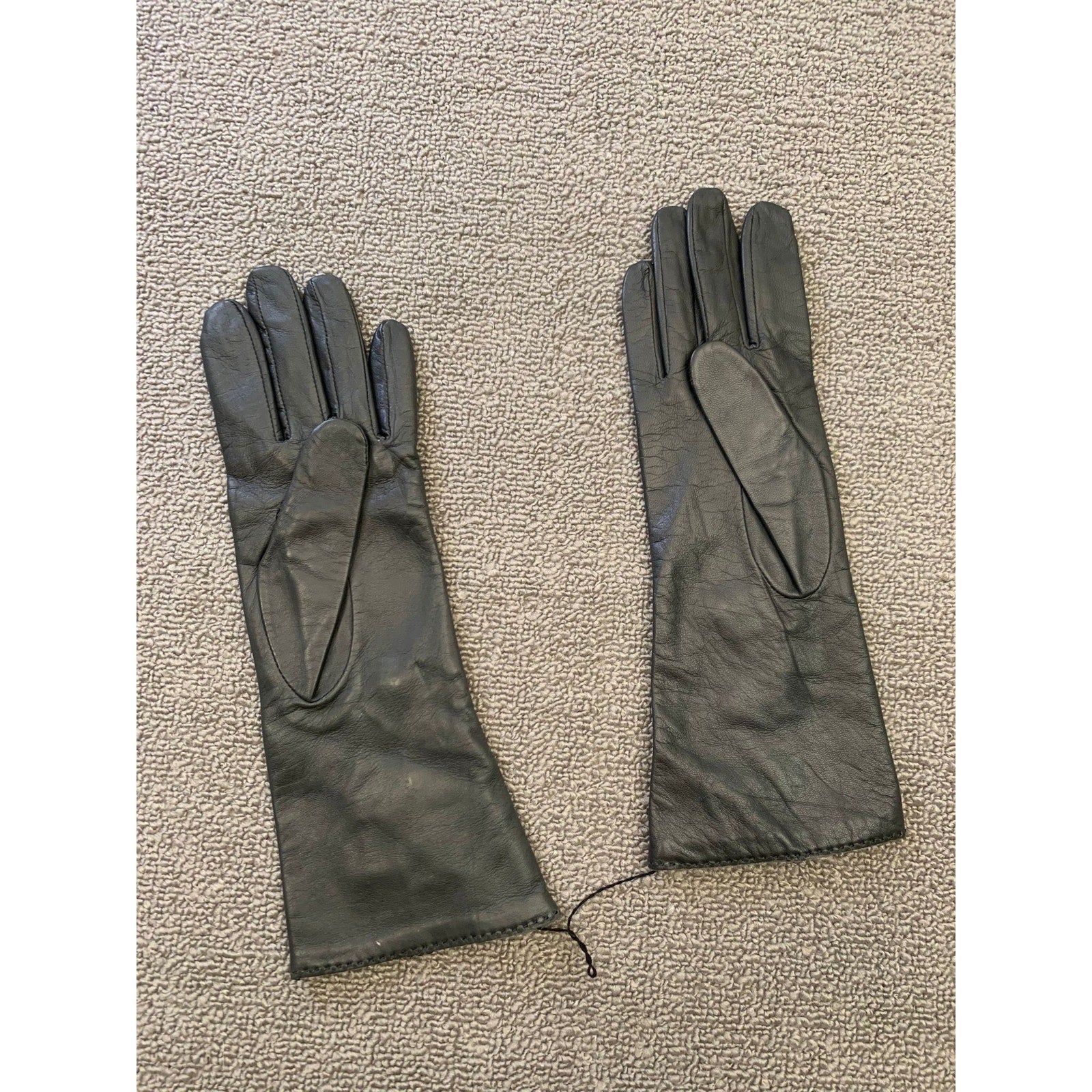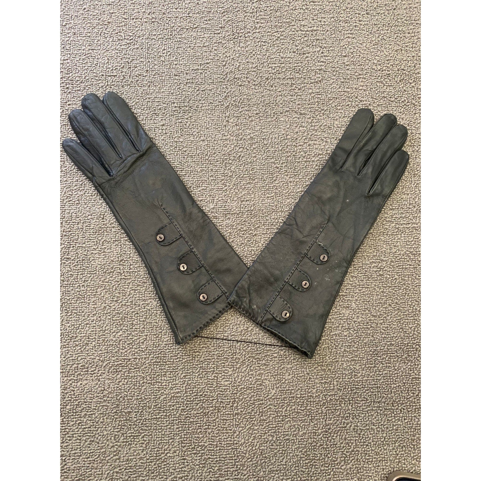Sophisticated and dramatic, these Carolina Amato New York opera-length gloves are crafted from smooth black leather and lined with printed silk for luxurious comfort. Featuring decorative button accents along the wrist and forearm, they’re the perfect finishing touch for formal and evening wear.