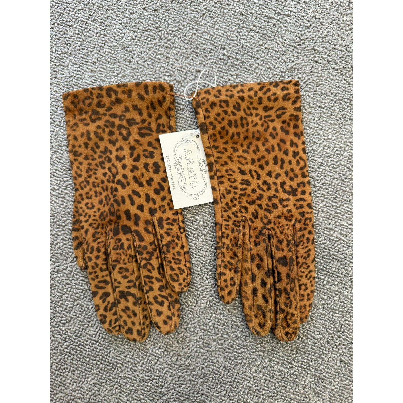 Amato New York women’s gloves crafted in genuine suede leather with an all-over leopard print pattern. Soft lining provides warmth and comfort. Marked size 7.