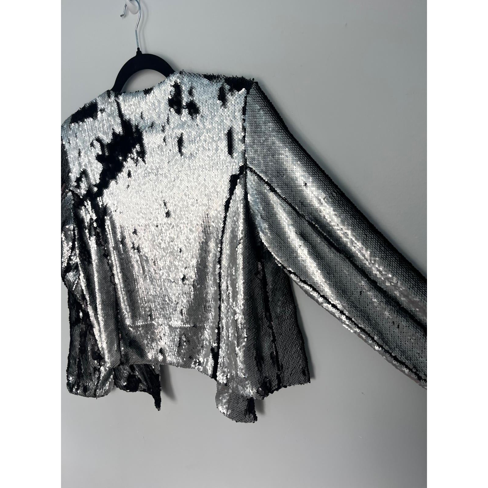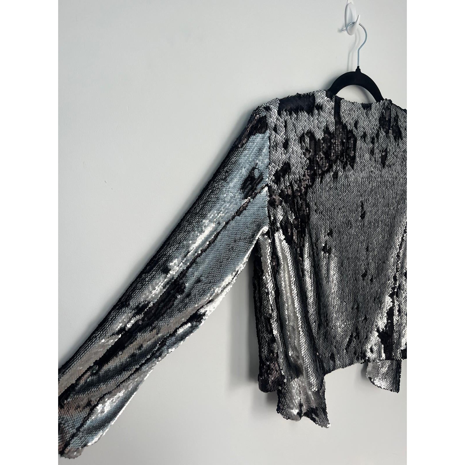 Dazzling sequin-covered open front blazer in a silver and black reversible pattern. Lightweight with full lining and draped fit—perfect for parties, concerts, or night outs.