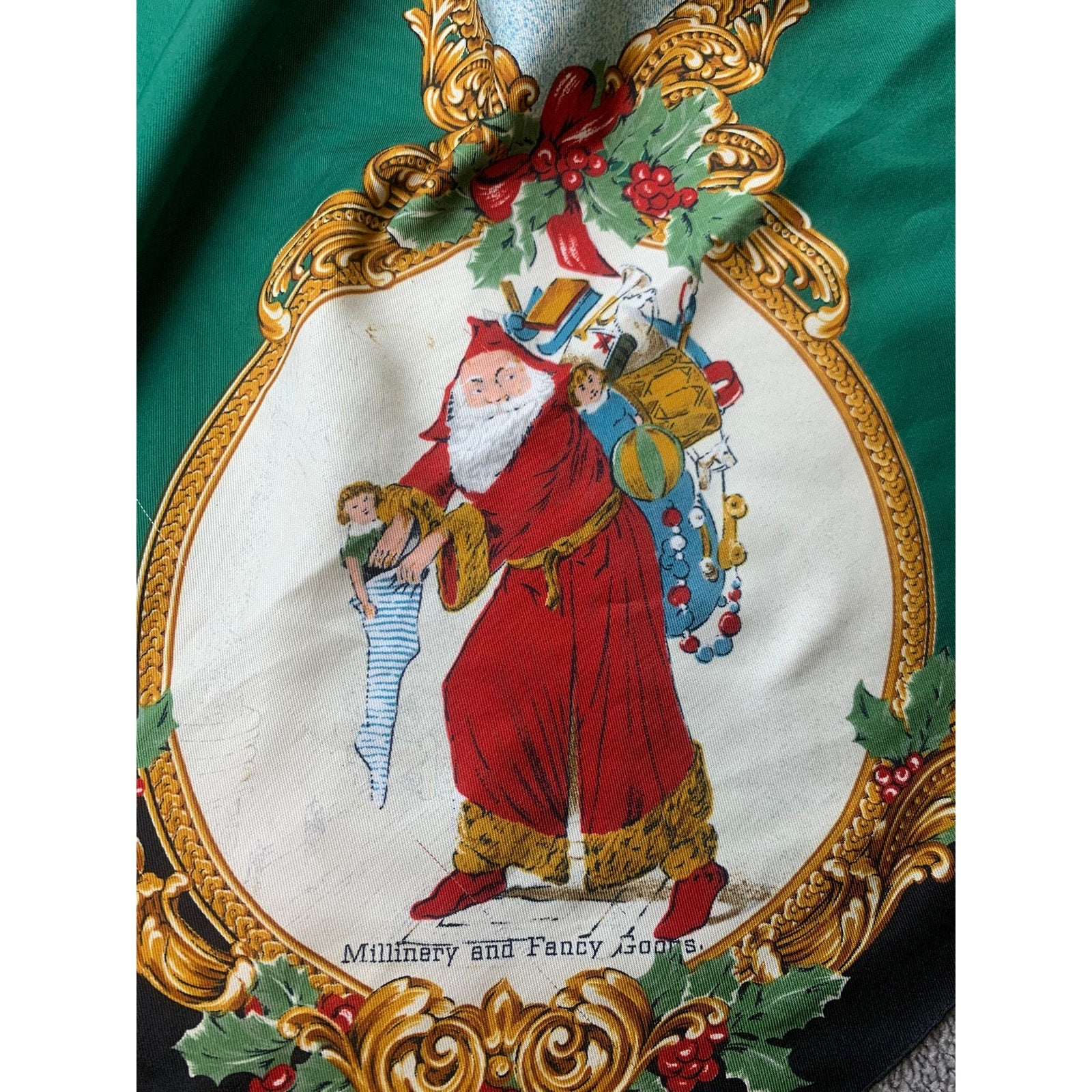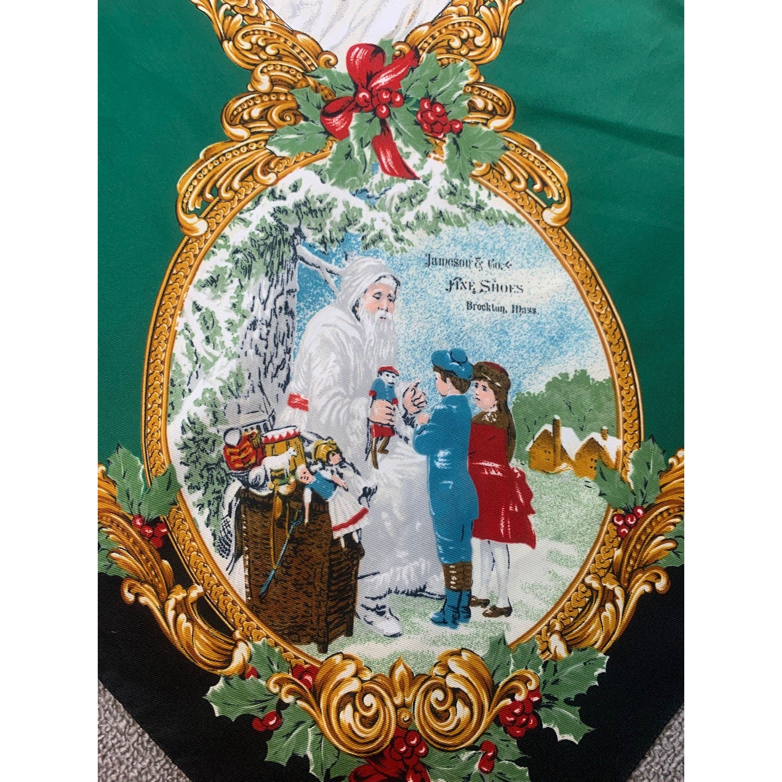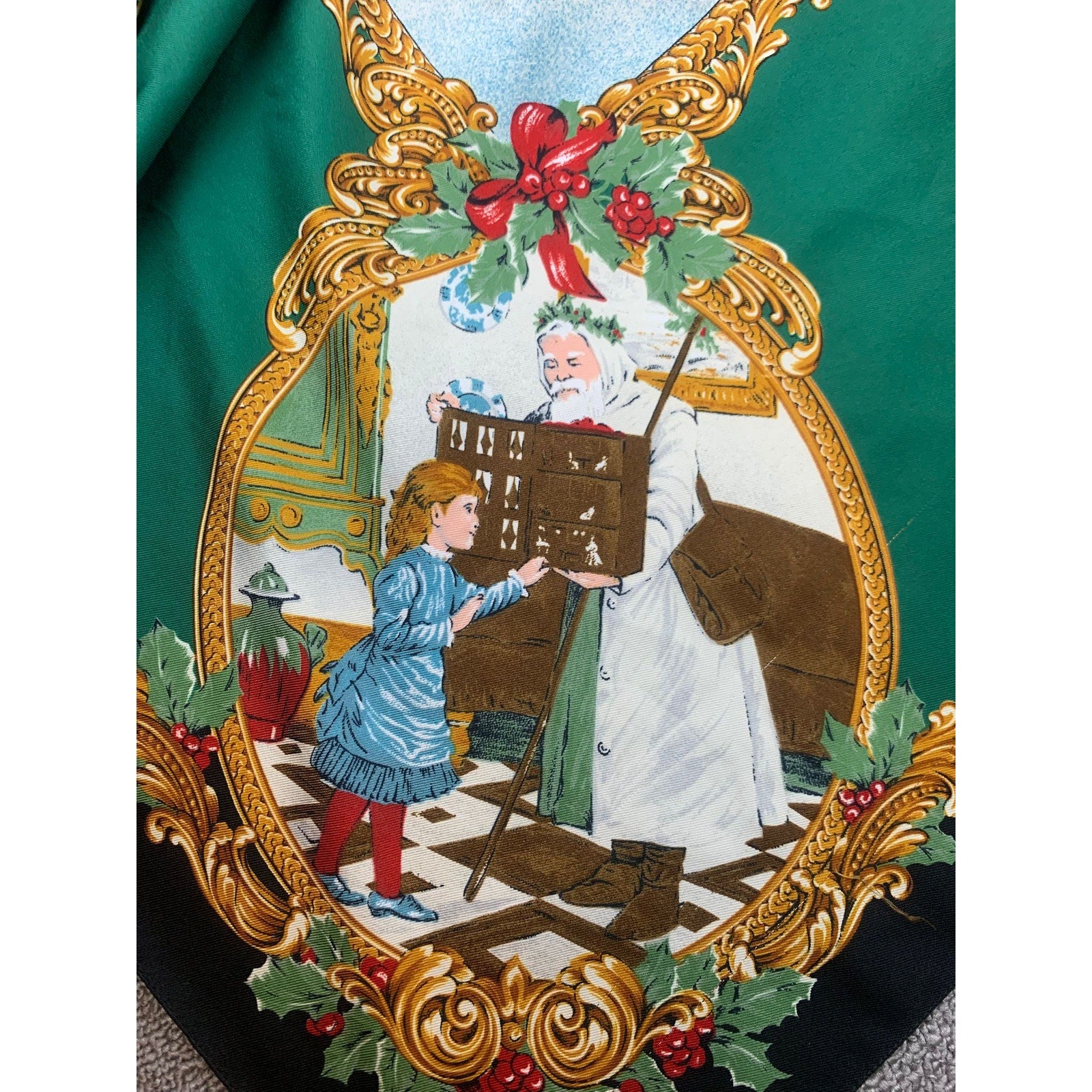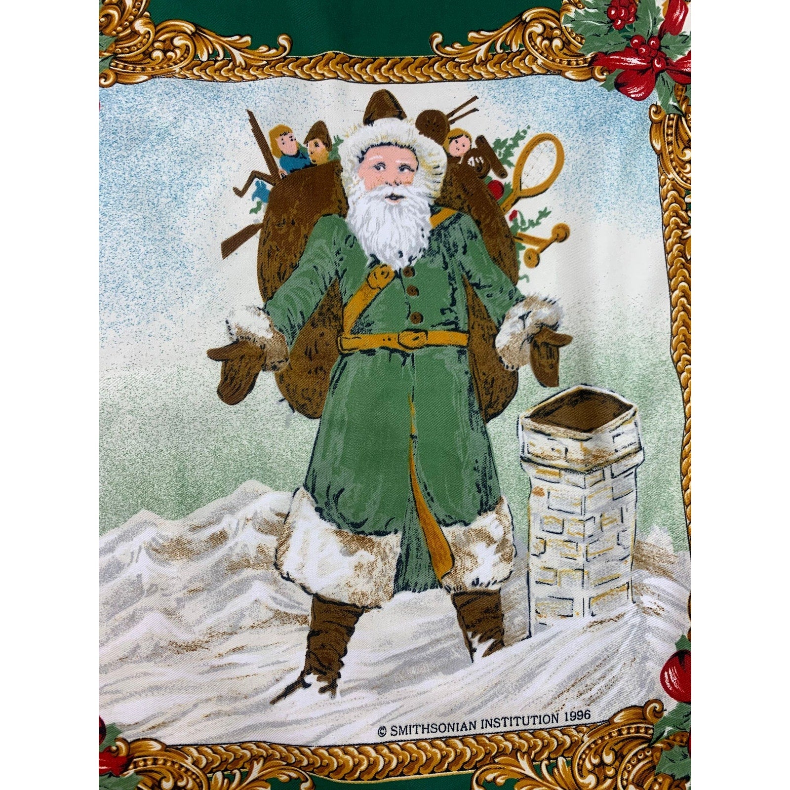 A festive 1996 Smithsonian Institution holiday scarf depicting Santa Claus in ornate gold-framed vignettes on a rich dark green field; made of lightweight luxurious (manufactured in Italy), ideal both as wear and decorative display.