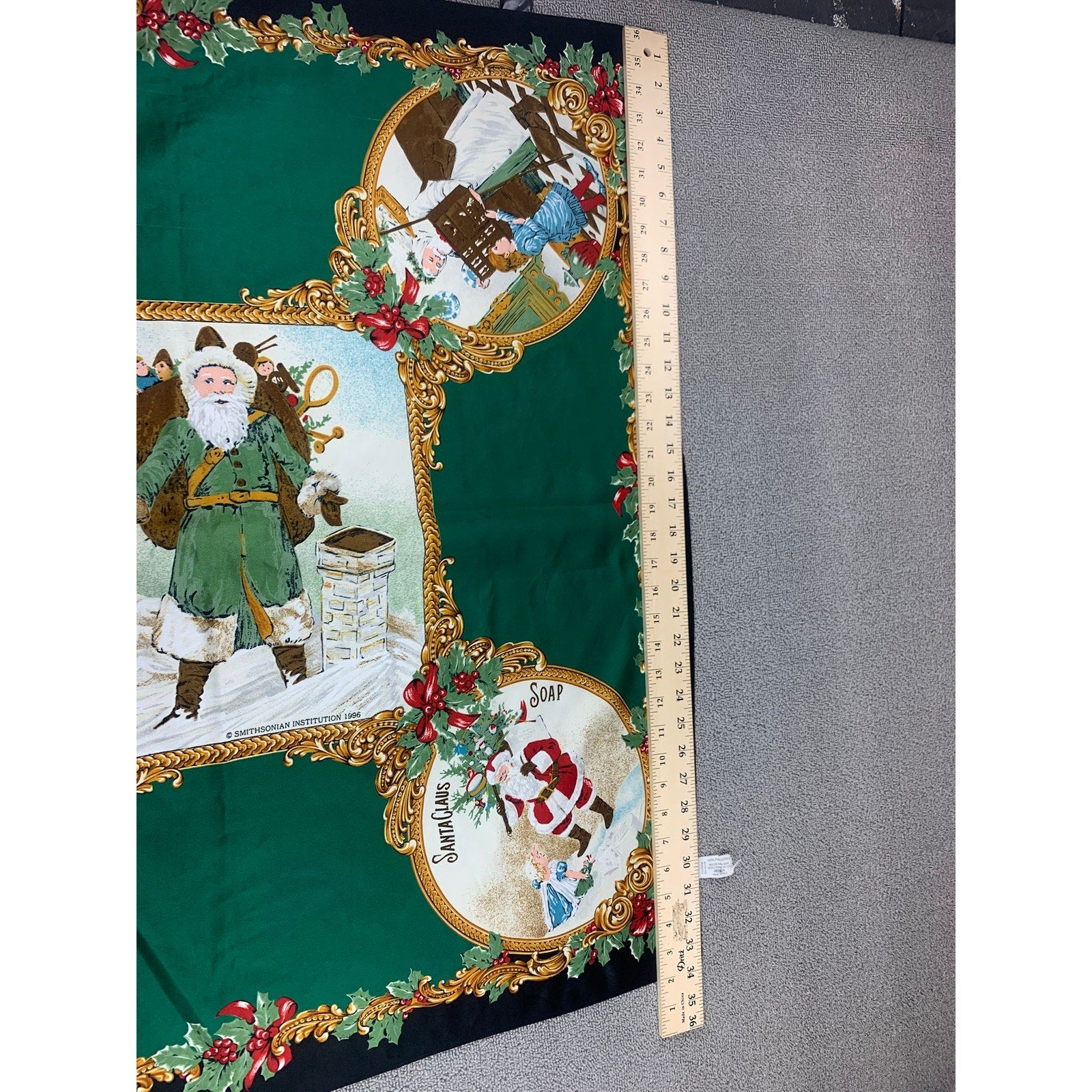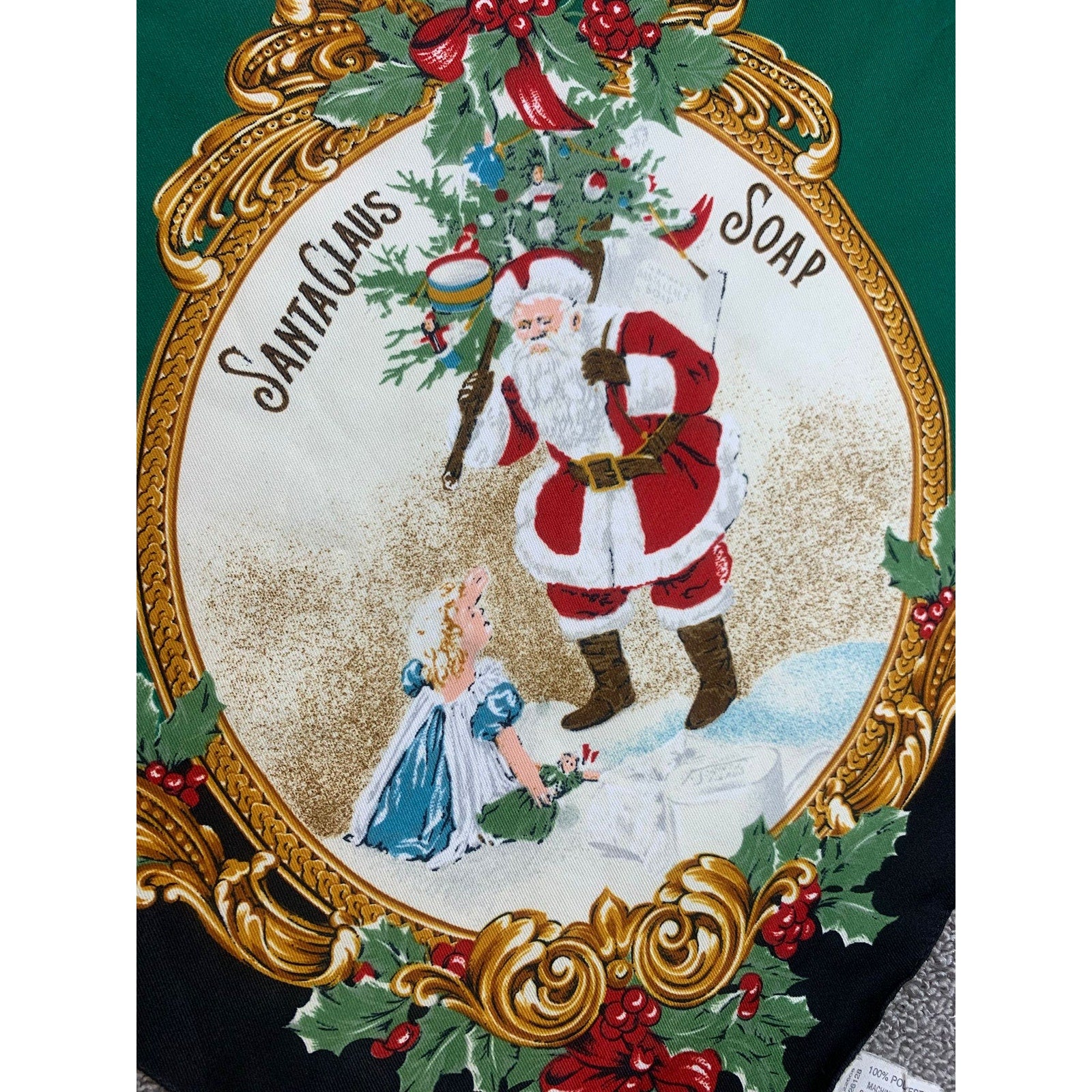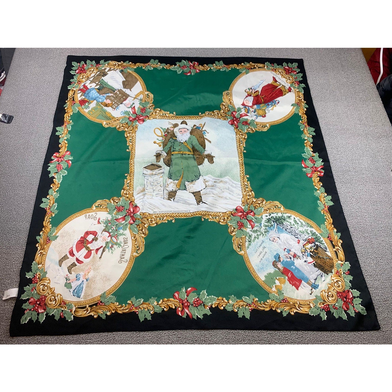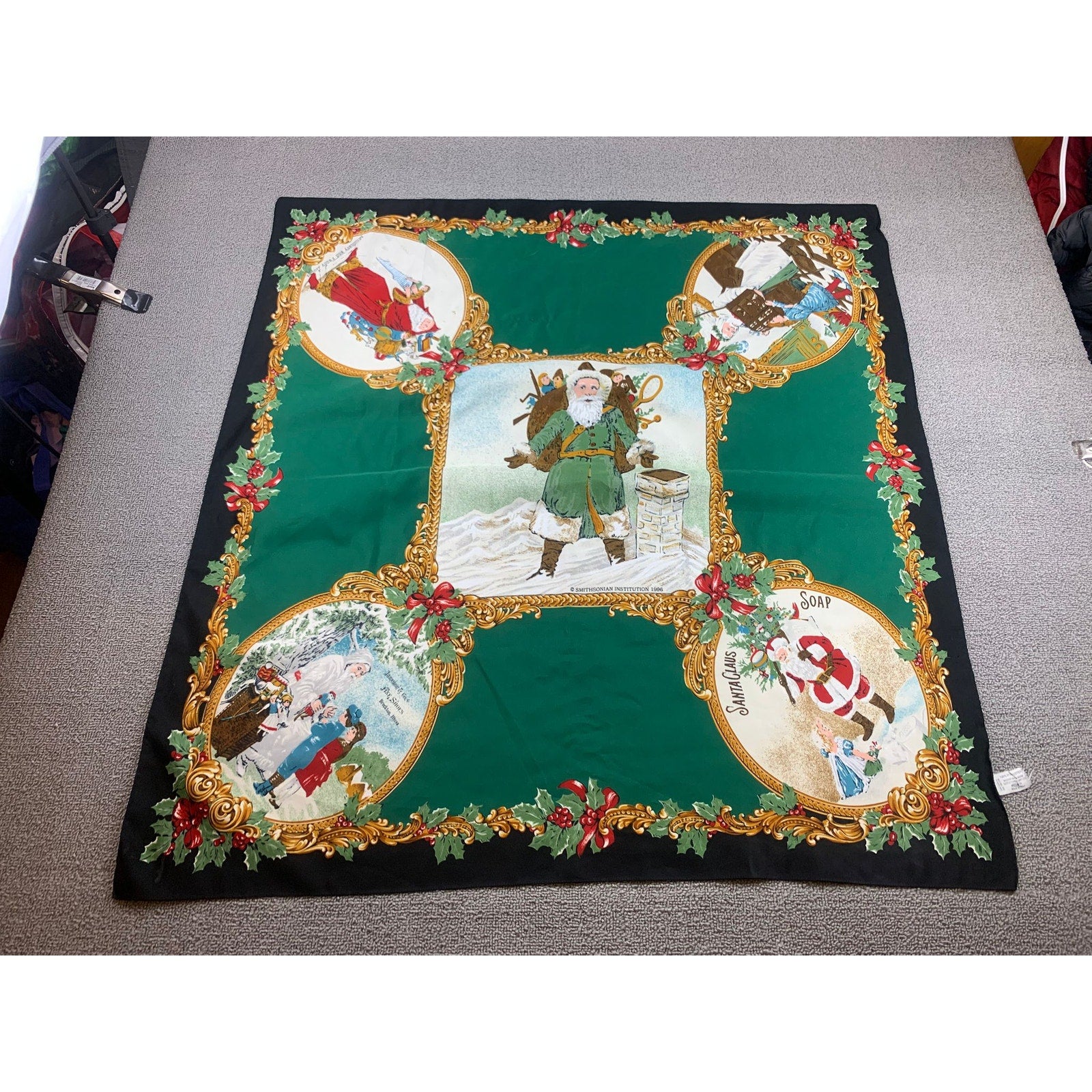 A festive 1996 Smithsonian Institution holiday scarf depicting Santa Claus in ornate gold-framed vignettes on a rich dark green field; made of lightweight luxurious (manufactured in Italy), ideal both as wear and decorative display.