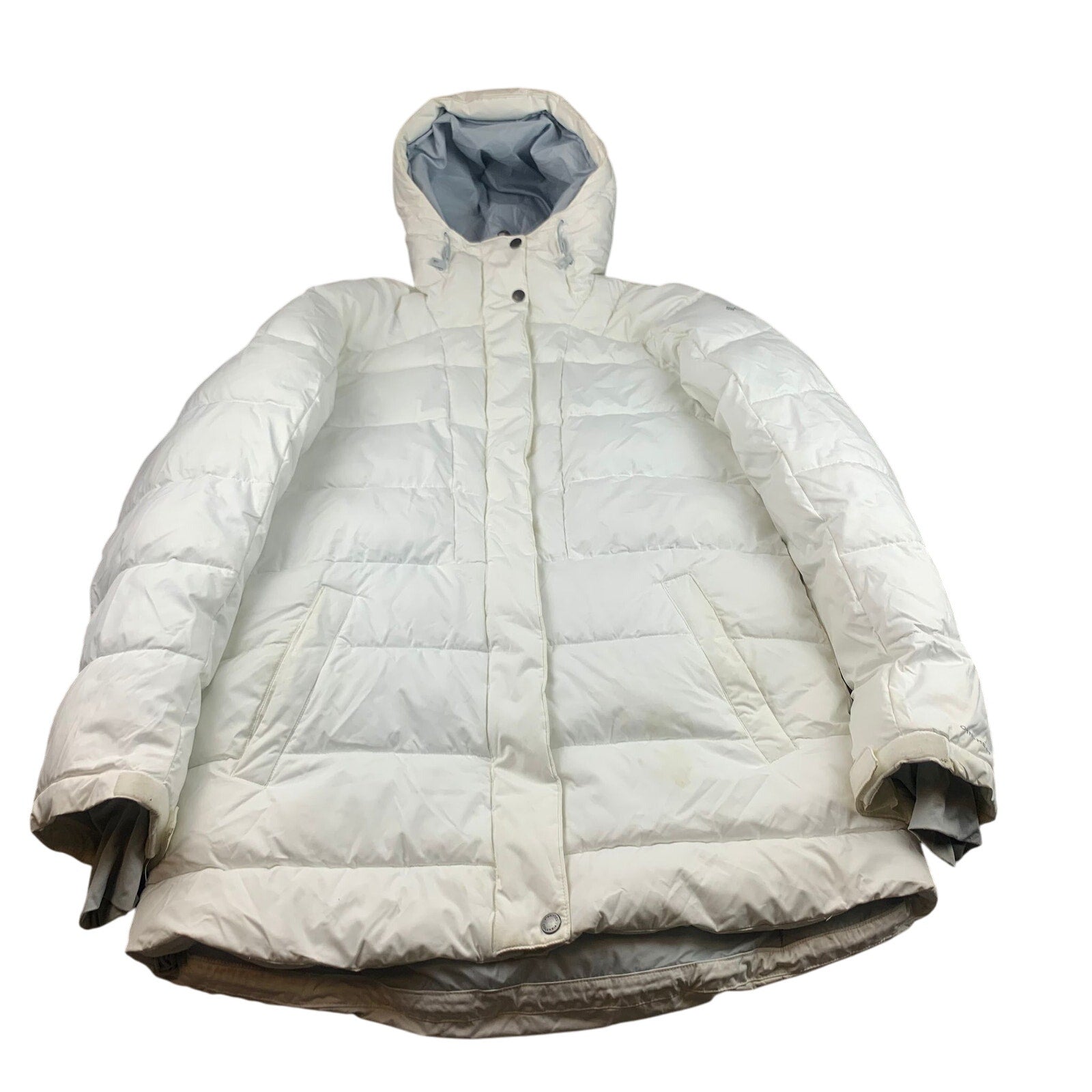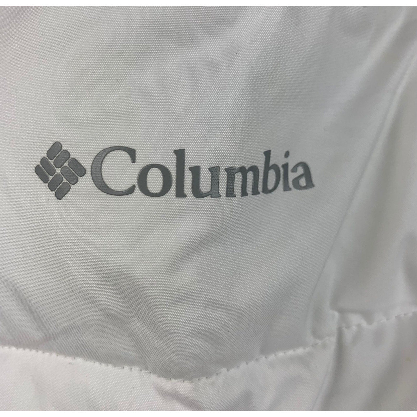 A crisp white hooded puffer jacket from Columbia Sportswear, with quilted insulation and extended hem for added coverage—ideal for cold-weather layering. Appears mid-length with a soft lining visible at sleeve cuffs and hood interior.