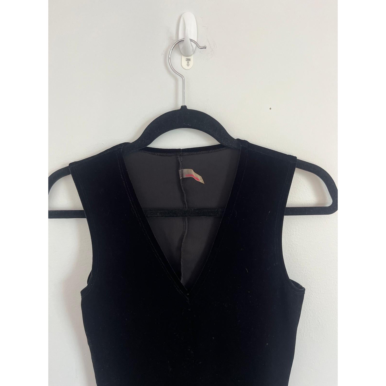 Stretch velvet sleeveless bodysuit with v-neckline and smooth nylon bottom. Fitted silhouette with minimalist design, ideal for layering or statement styling.