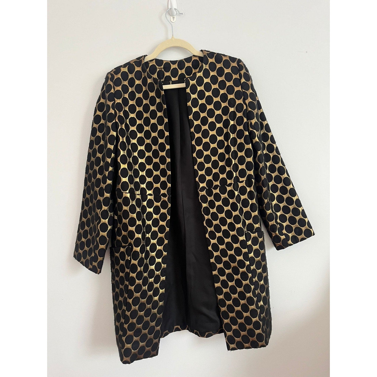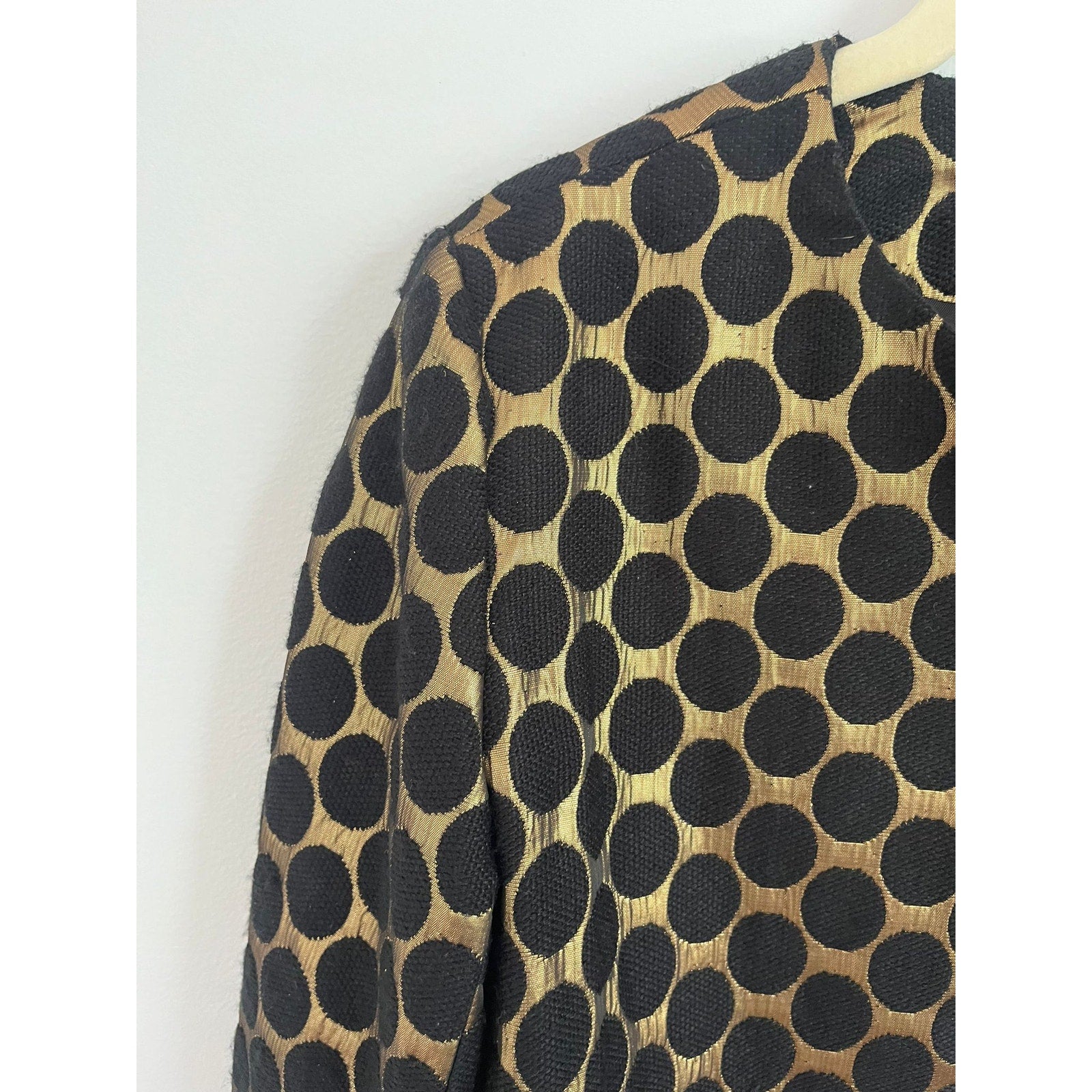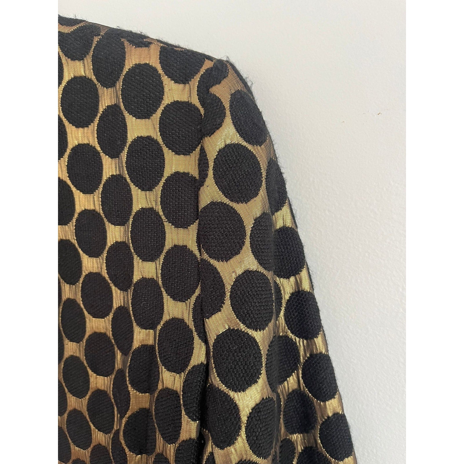 Stunning long jacket with black textured polka dot print over a gold satin finish.