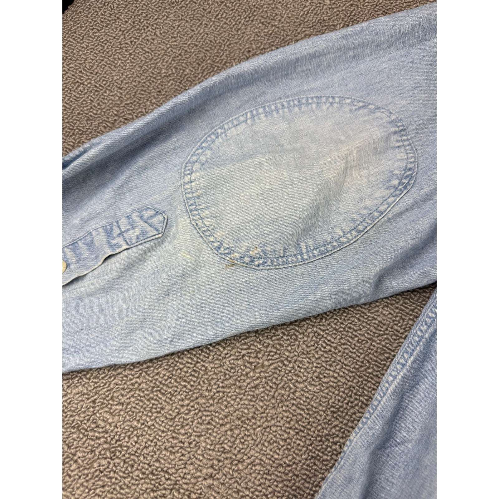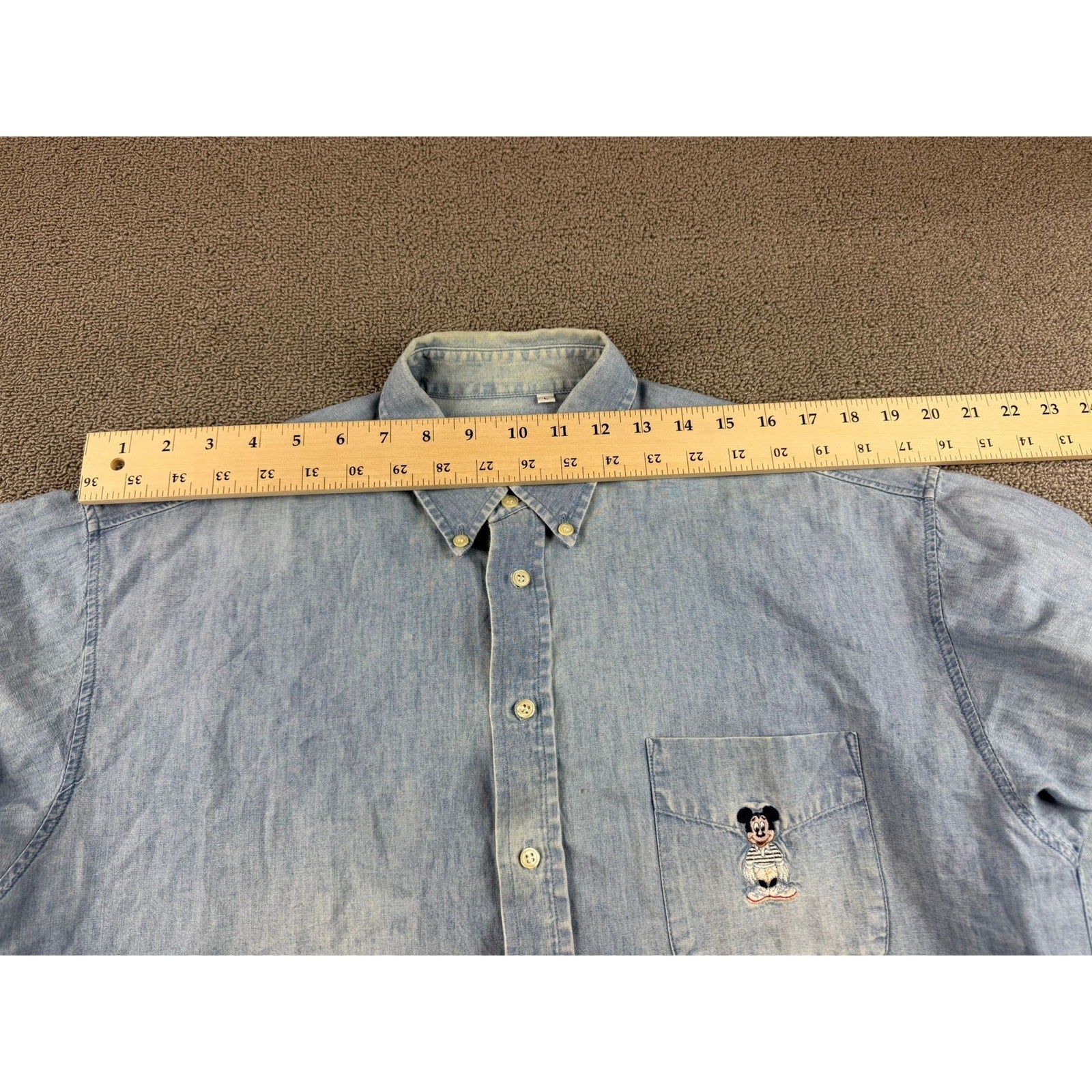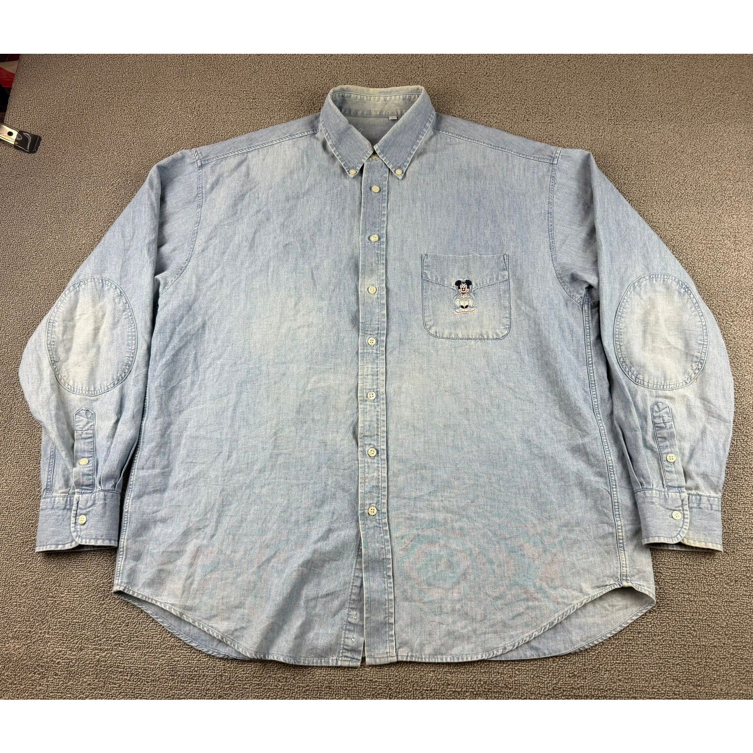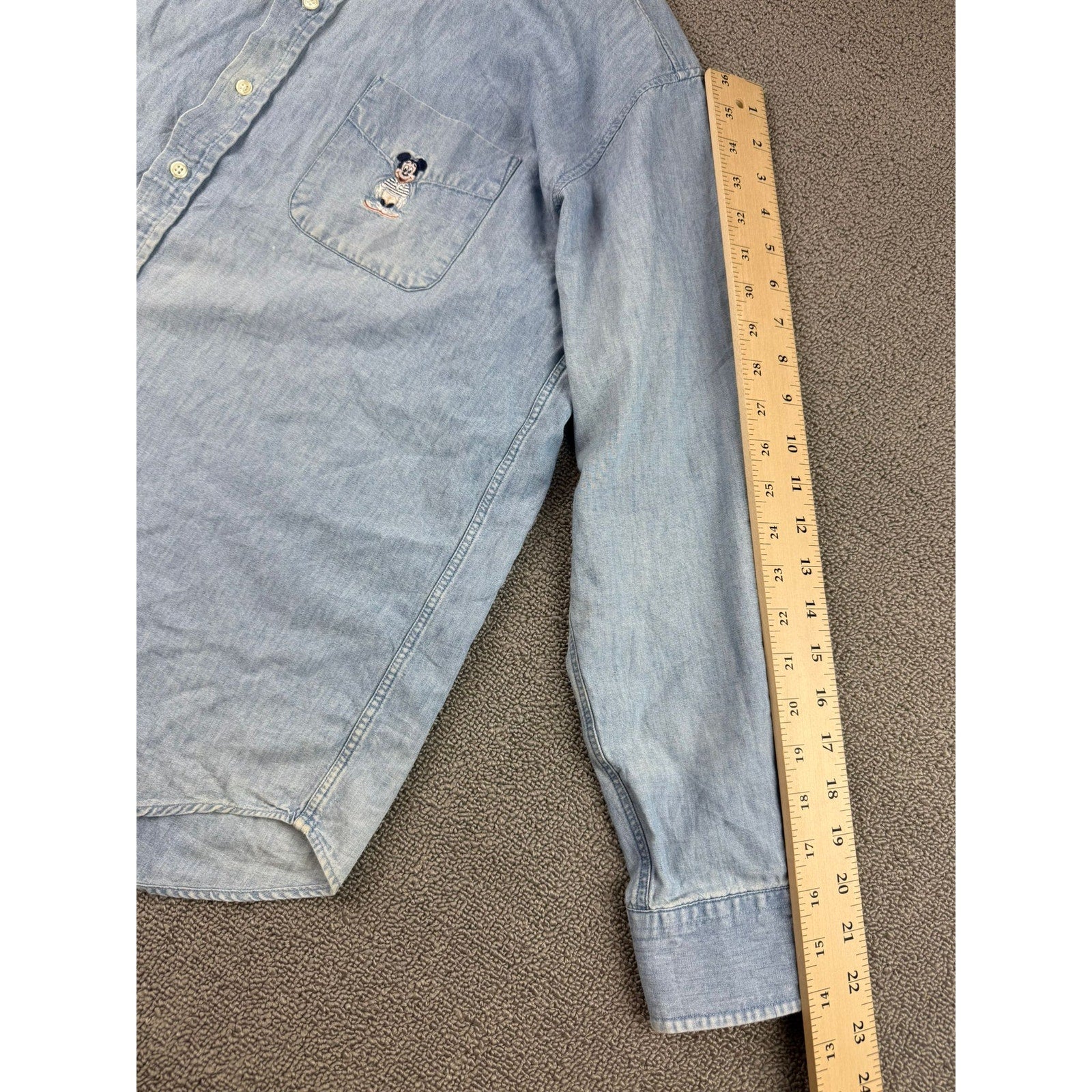 Lightwash button-down with button collar, chest pocket Mickey embroidery, and oval elbow patches. Classic fit with button cuffs and curved hem; likely 100% cotton chambray.
