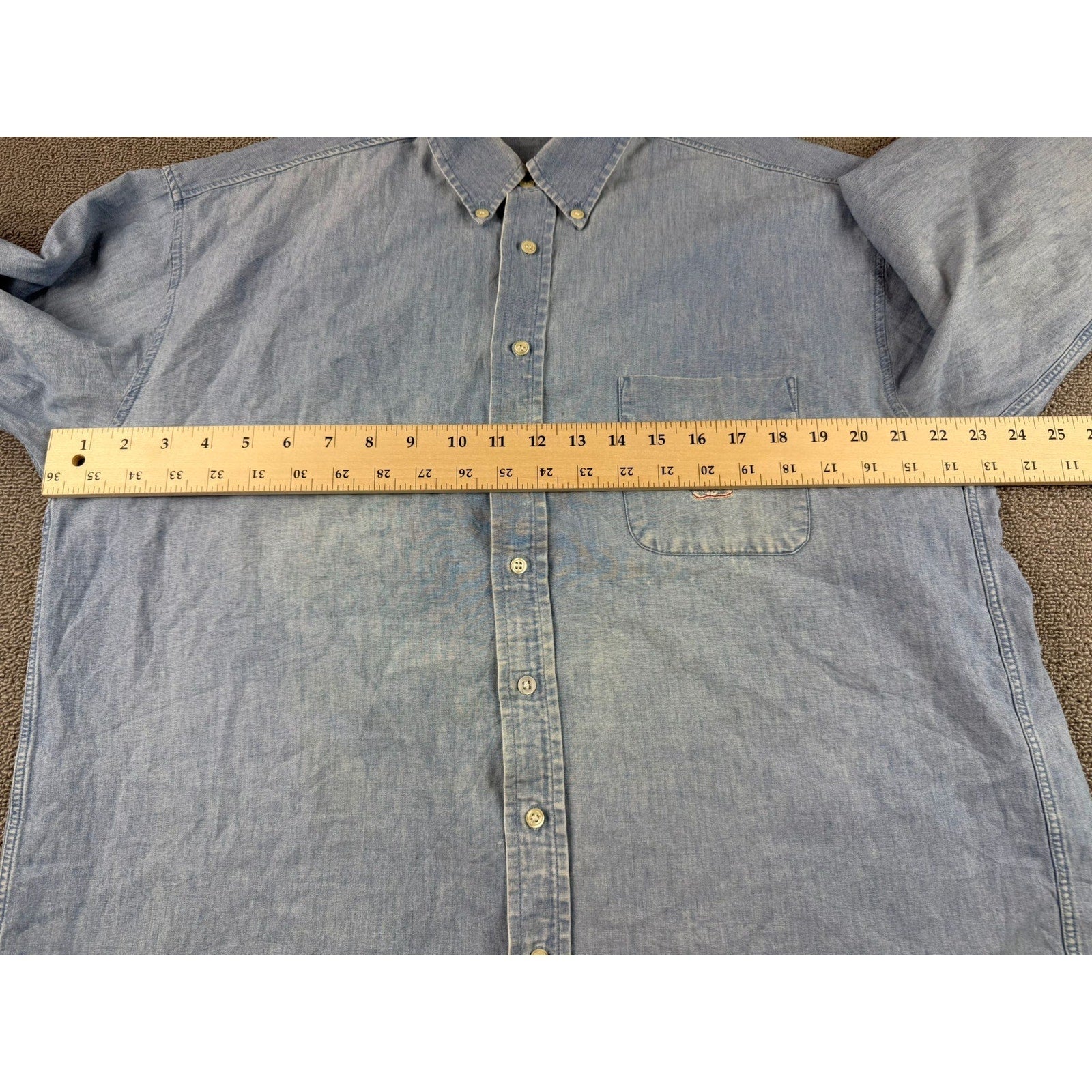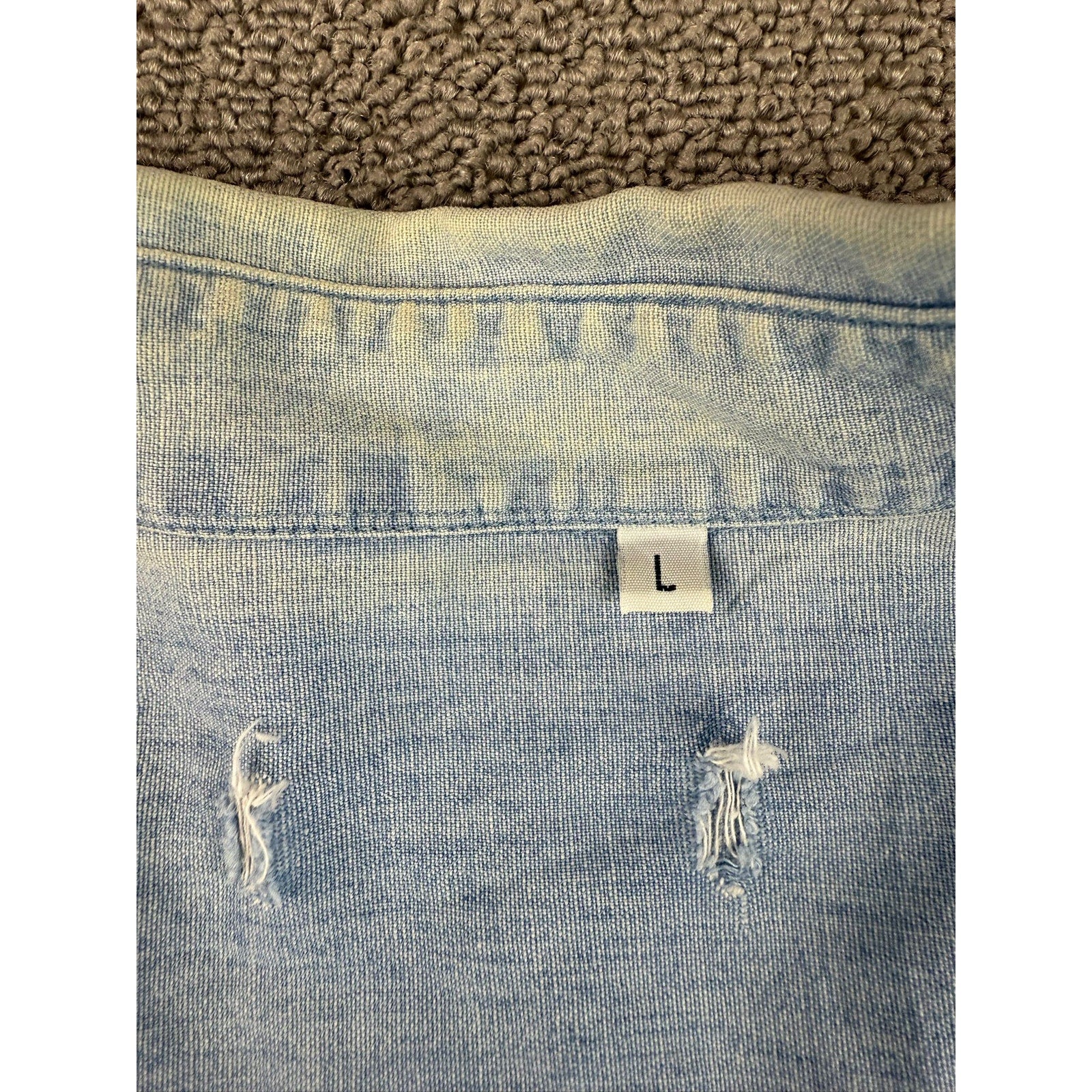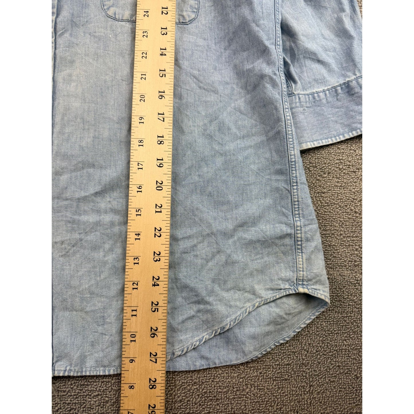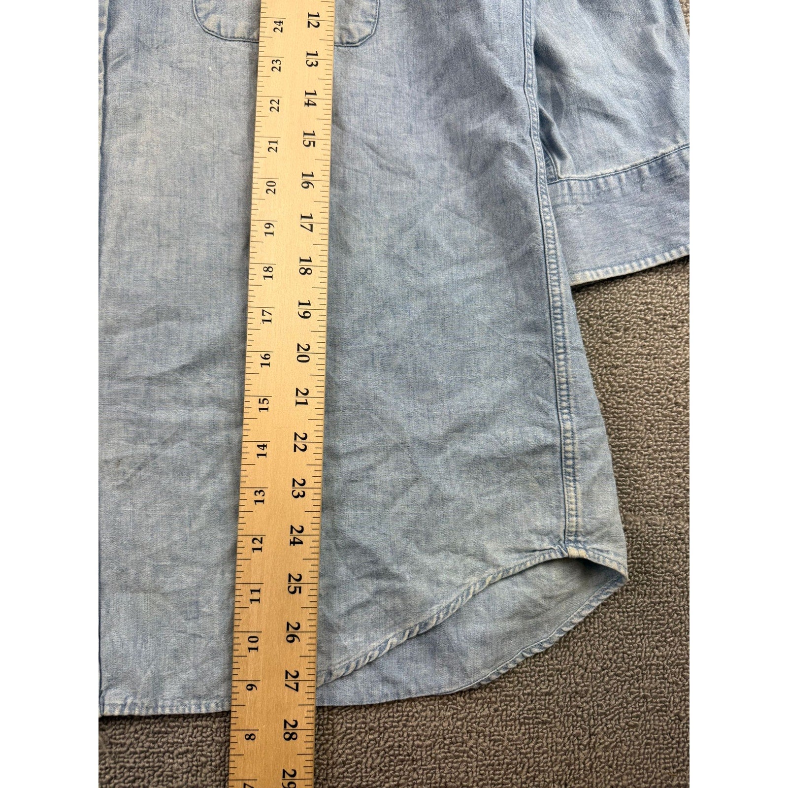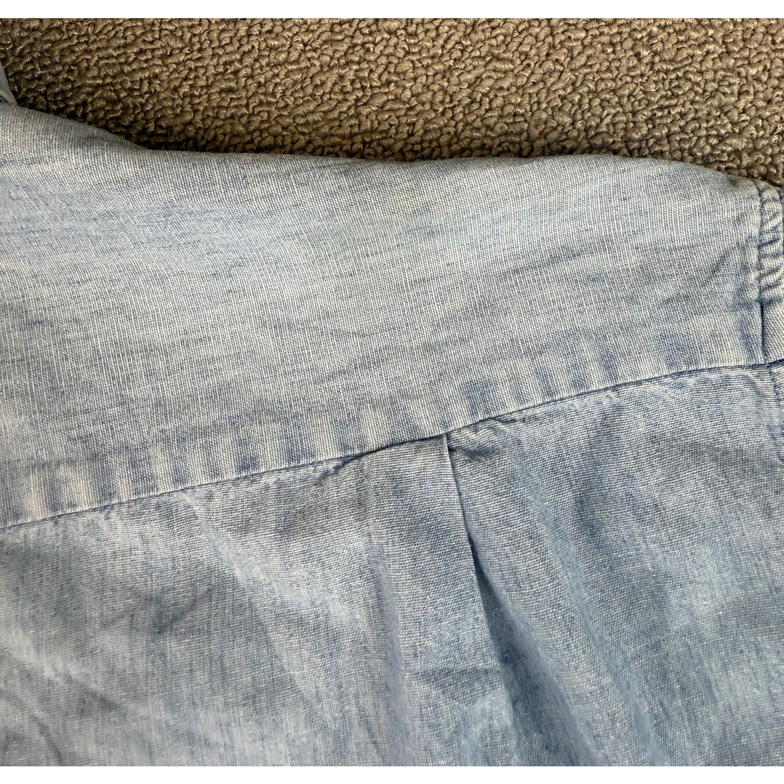 Lightwash button-down with button collar, chest pocket Mickey embroidery, and oval elbow patches. Classic fit with button cuffs and curved hem; likely 100% cotton chambray.