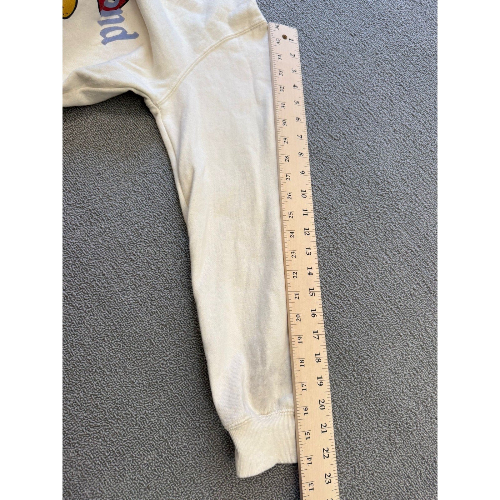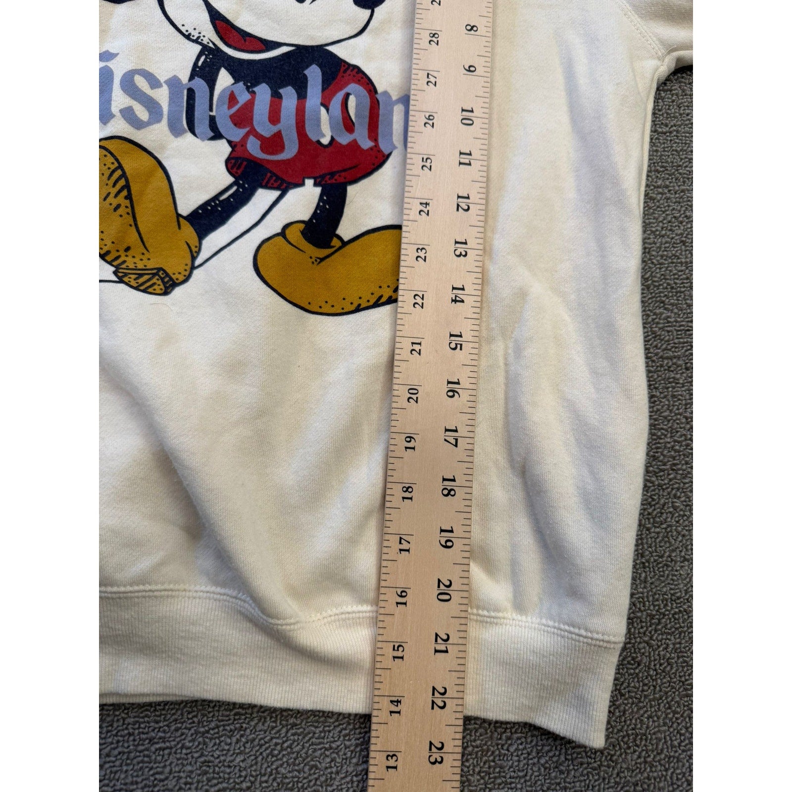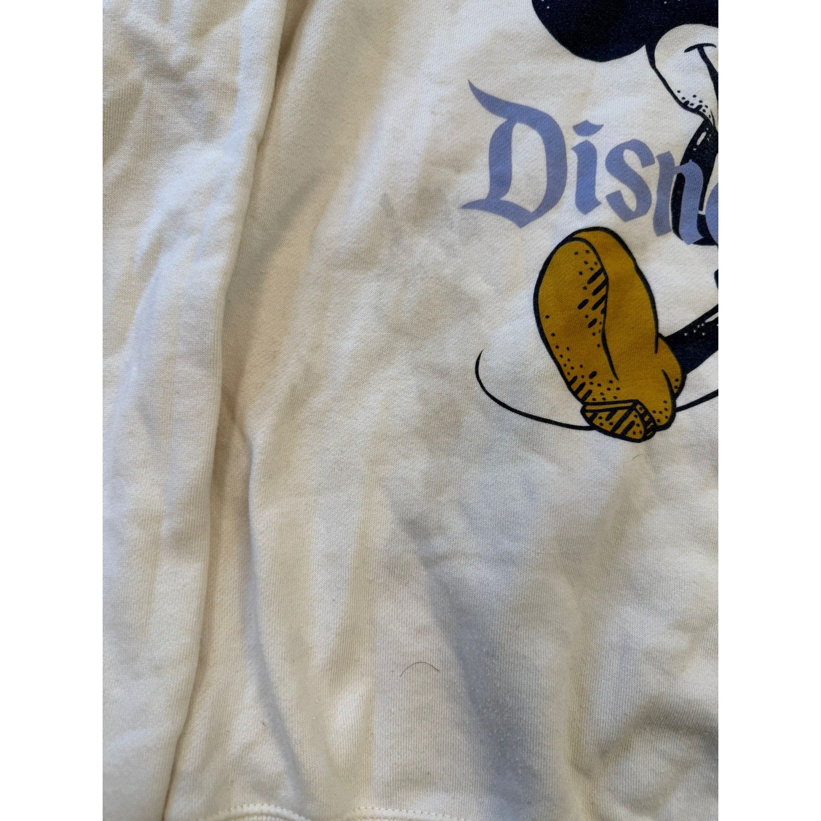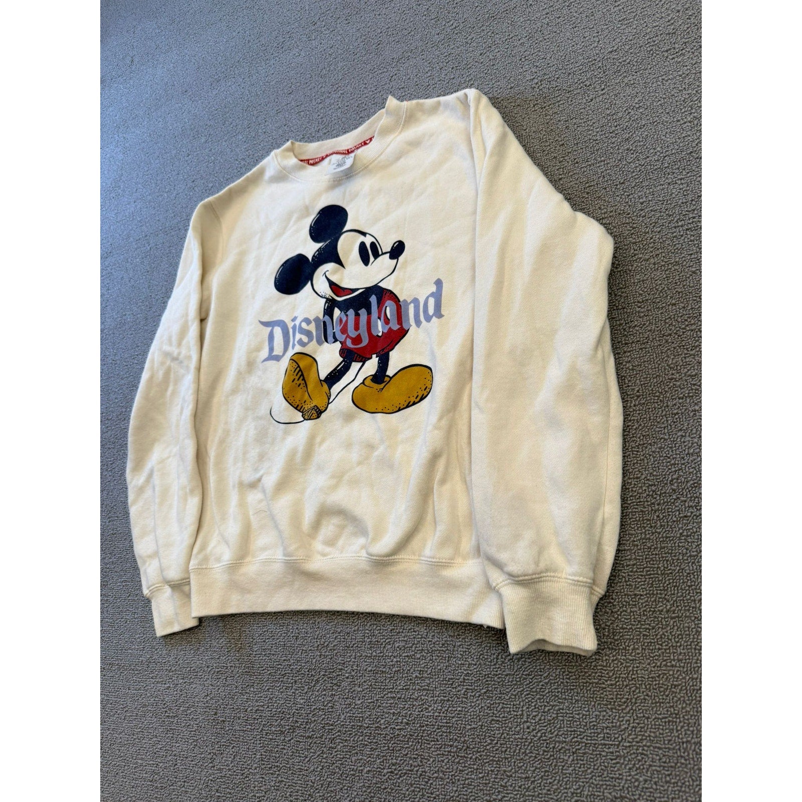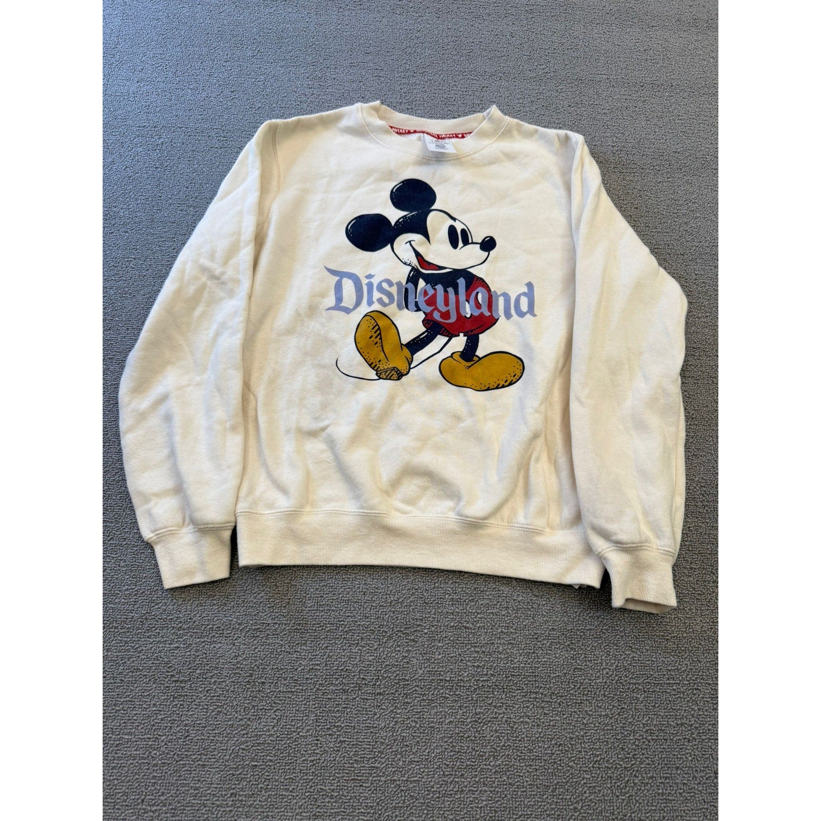 Classic crewneck sweatshirt featuring vintage-style Mickey Mouse and “Disneyland” lettering on off-white cotton blend; casual, nostalgic design with relaxed fit.