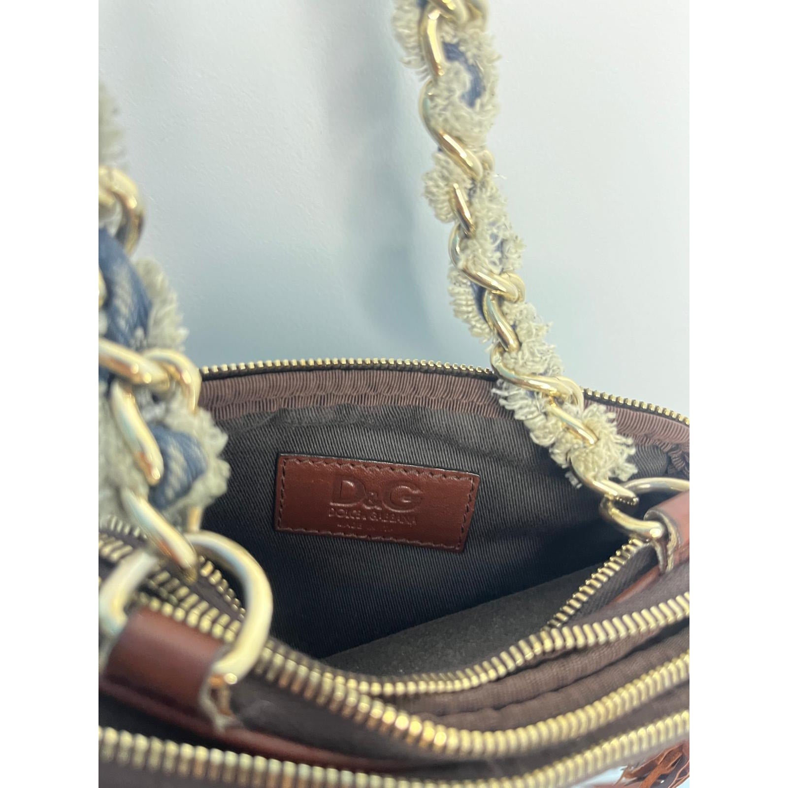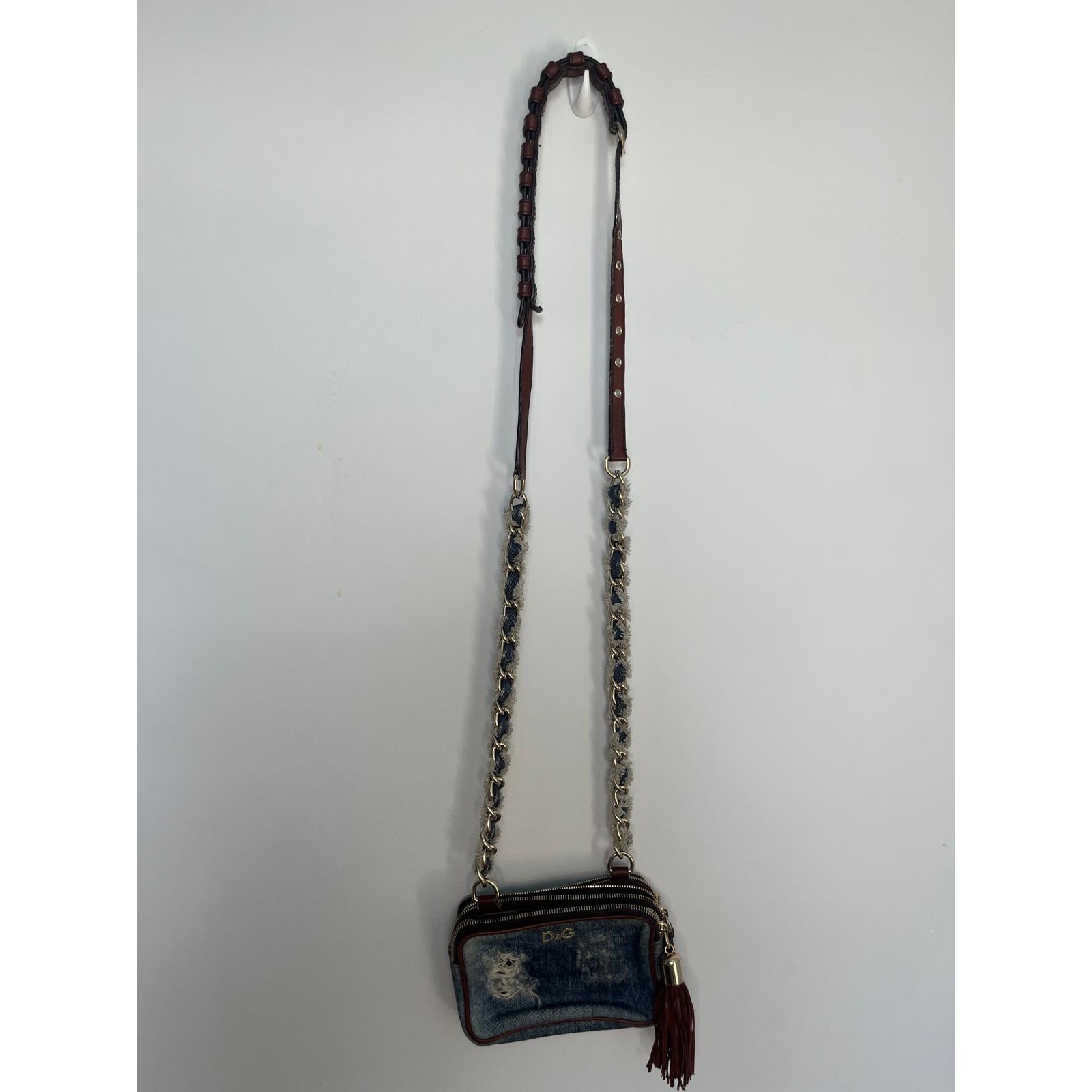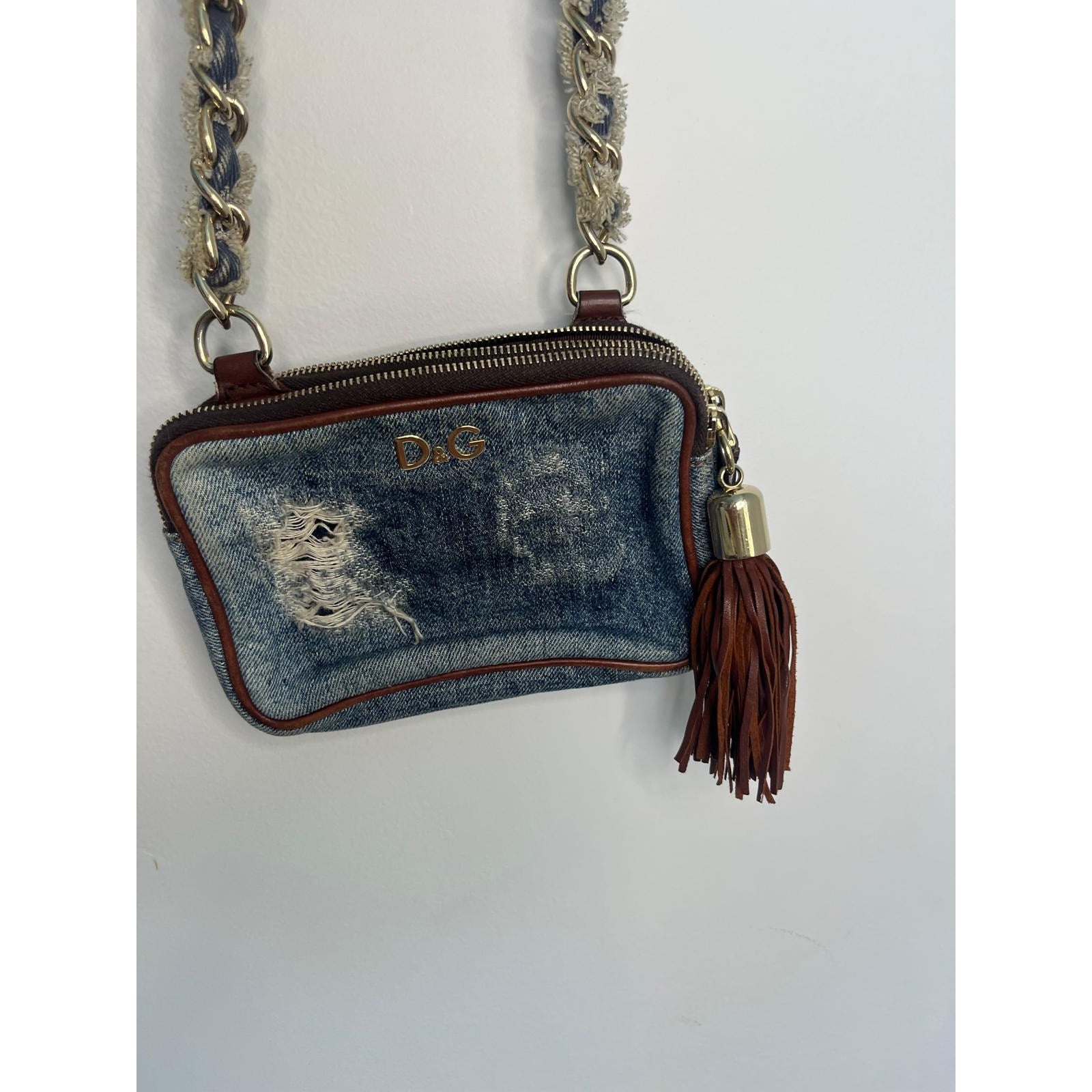 Iconic D&G mini crossbody bag featuring distressed blue denim, brown leather trim, and a chunky gold-tone chain strap woven with frayed fabric. Finished with a leather tassel zipper pull and logo plaque. 100% Authentic.