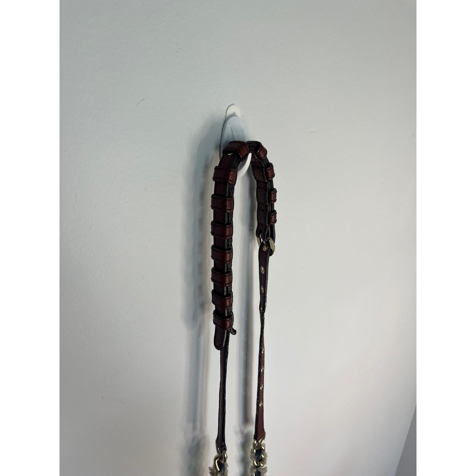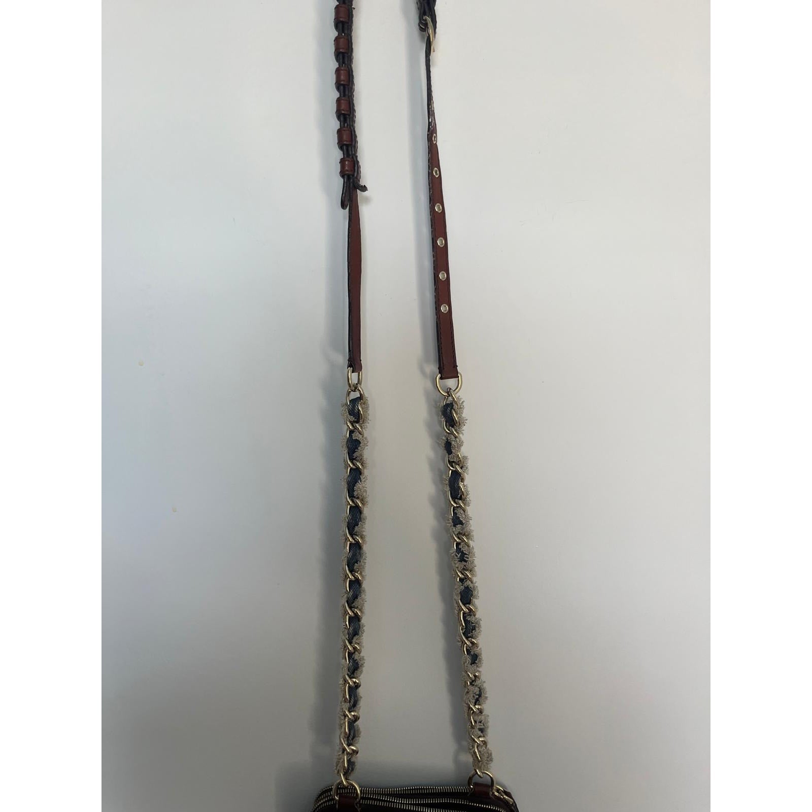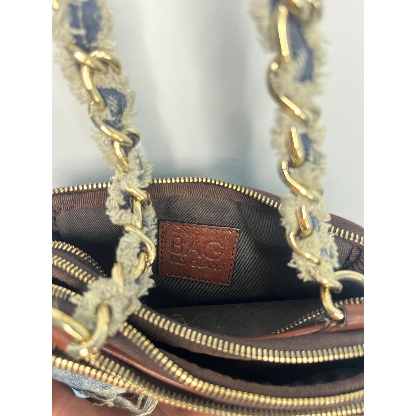 Iconic D&G mini crossbody bag featuring distressed blue denim, brown leather trim, and a chunky gold-tone chain strap woven with frayed fabric. Finished with a leather tassel zipper pull and logo plaque. 100% Authentic.