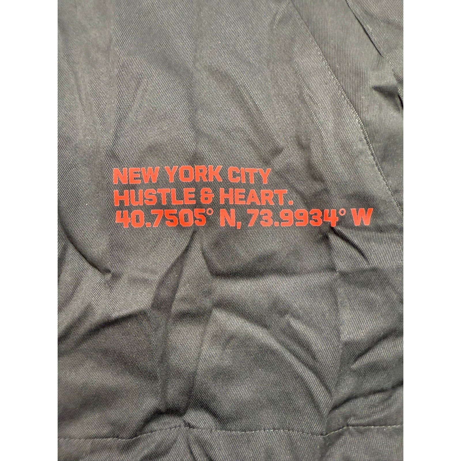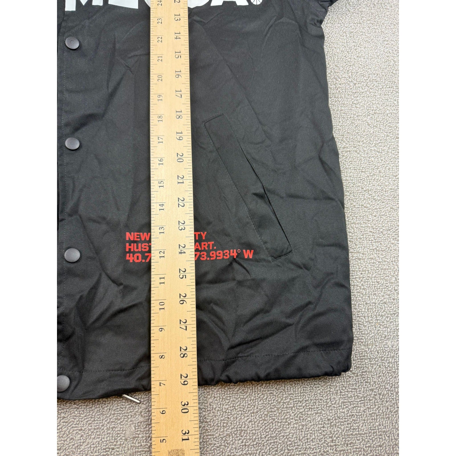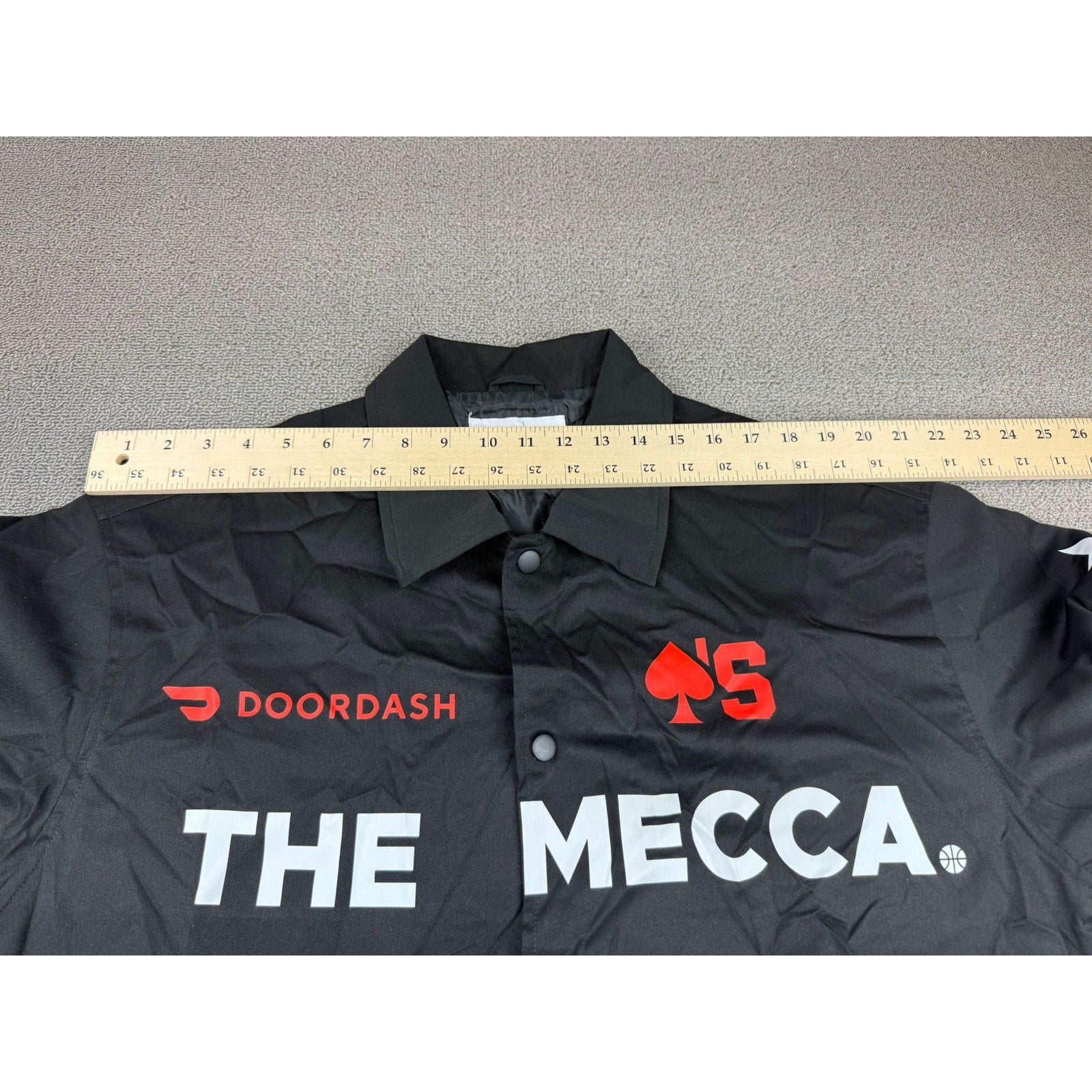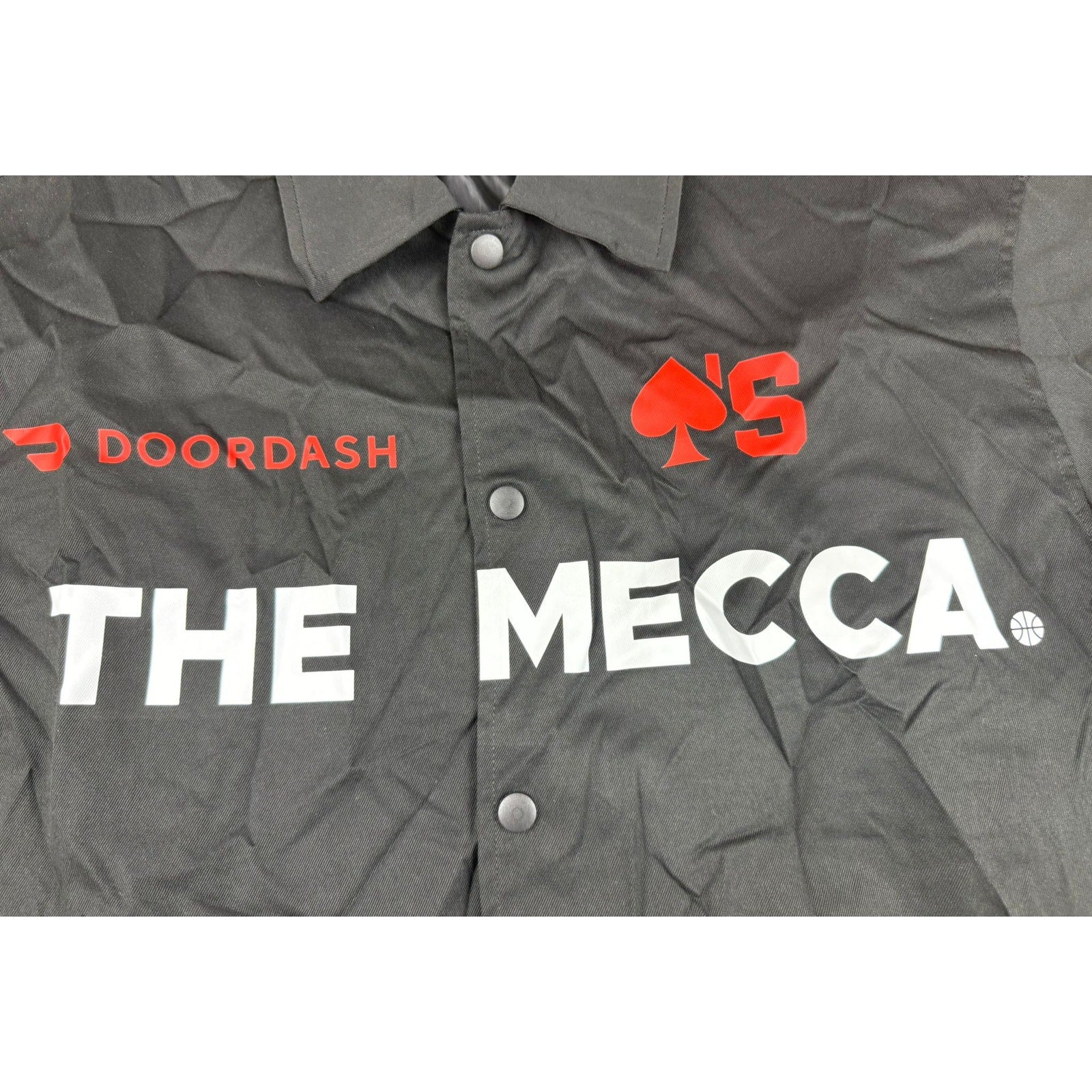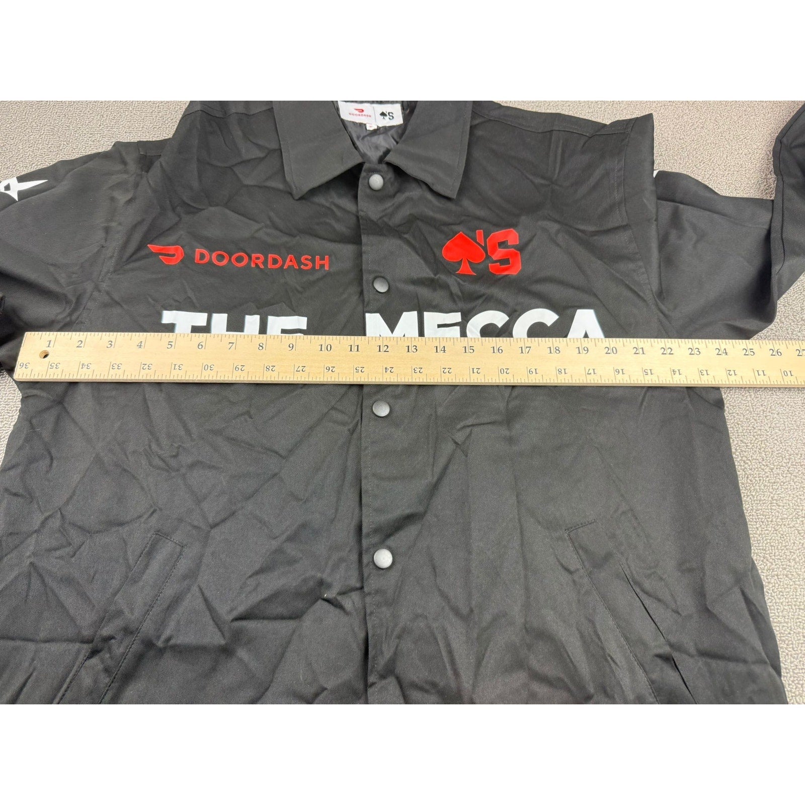 Limited edition black coach-style jacket from DoorDash x A’s collaboration. Features bold “THE MECCA” lettering across the chest, DoorDash and A’s branding, and New York City coordinates on the lower front. Snap button closure, side pockets, elastic cuffs, and lightweight padded lining. Rare promo-style piece with streetwear appeal.