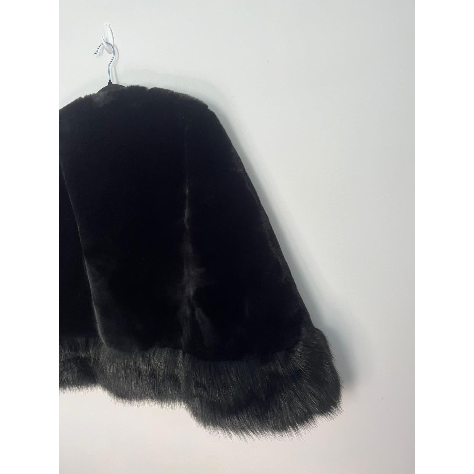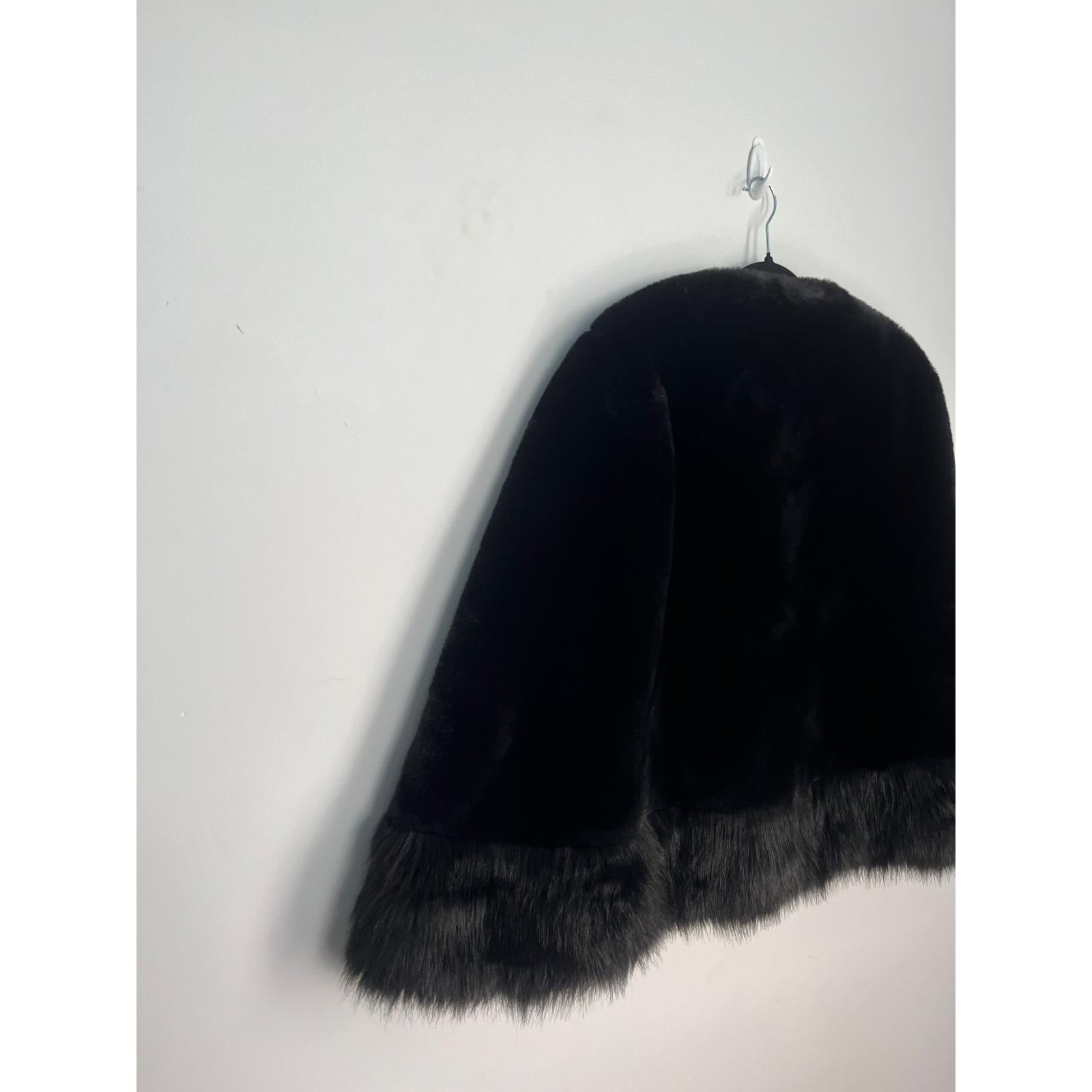 Luxe black faux fur jacket with a plush texture and chic bell-sleeve cuffs. Short length and fully lined with hidden hook closure at front. Elegant eveningwear or winter layering staple.