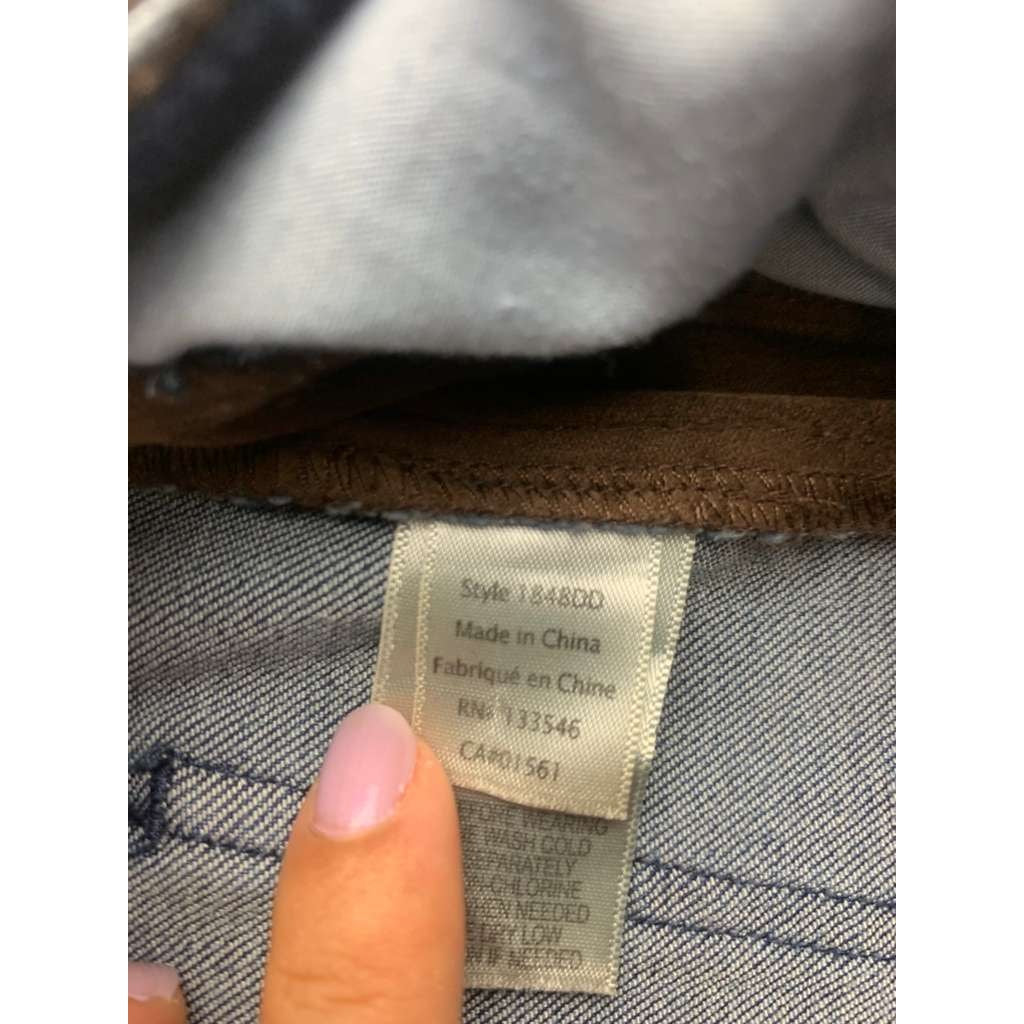 Straight leg denim with contrast brown faux suede Velvet style insets down the sides and along the waistband. Mid to high rise five pocket design with zip fly—unique two tone look that flatters and elongates the leg.