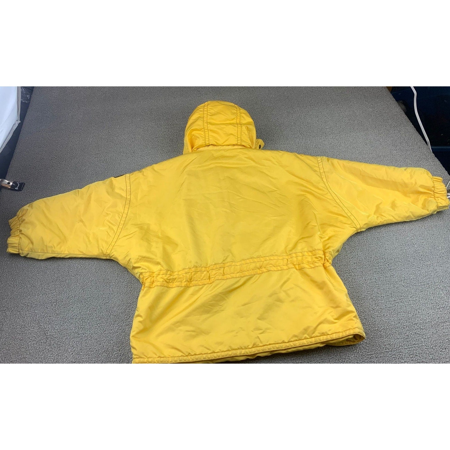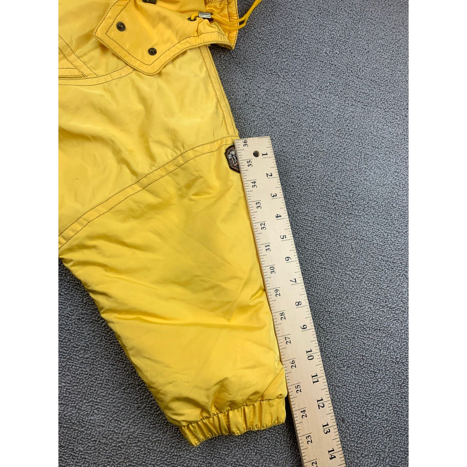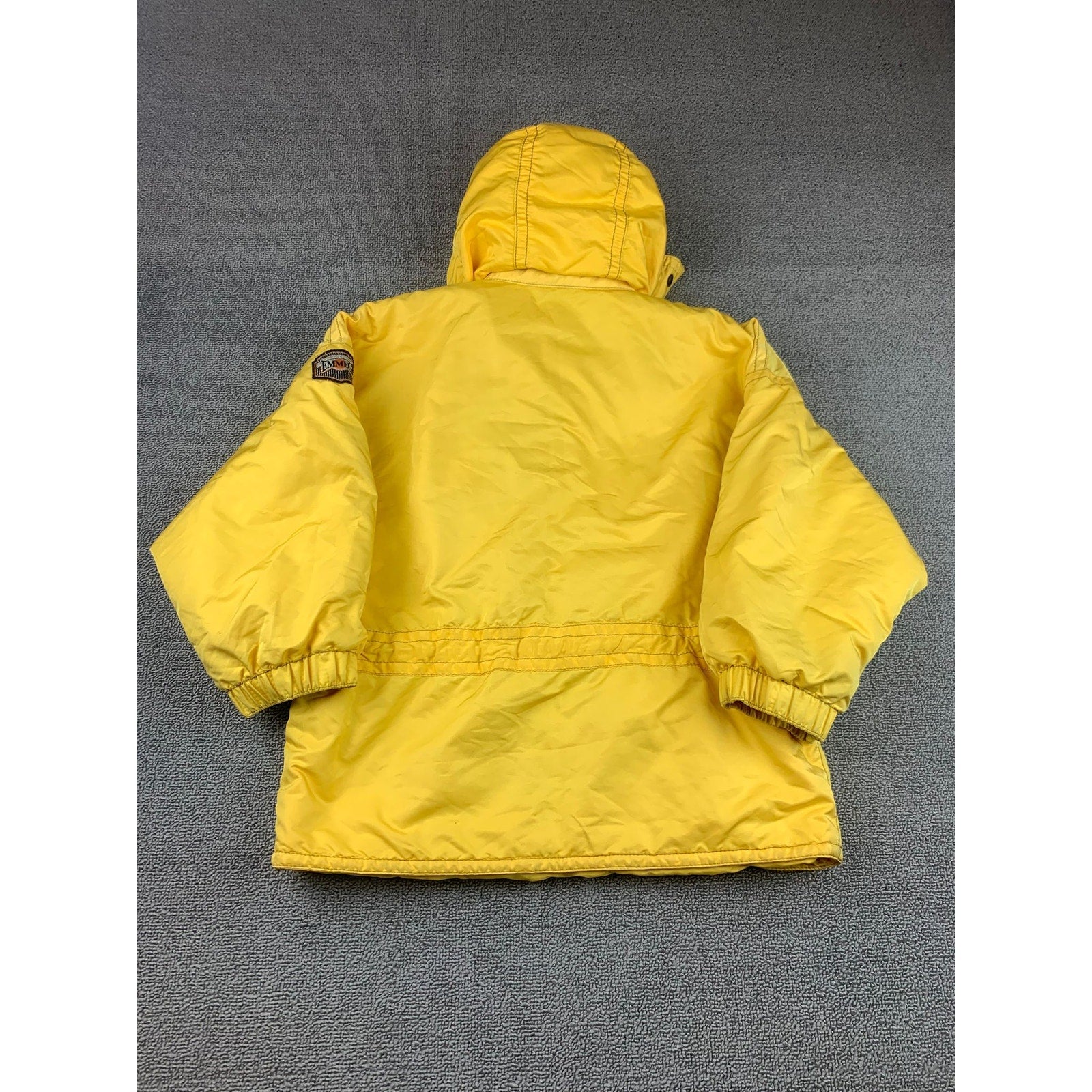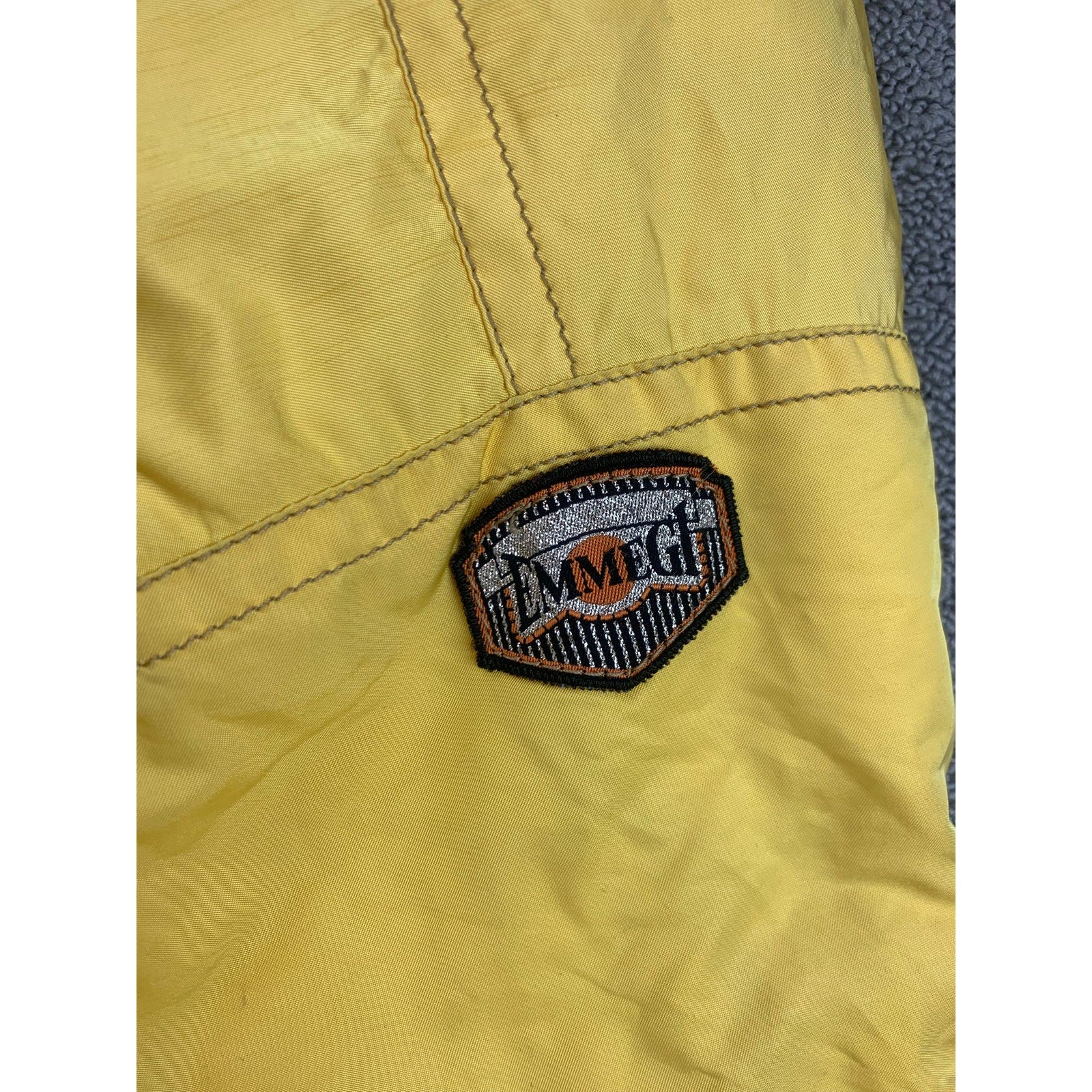 Vintage‑style Emmegi ski jacket in a vibrant yellow hue with a functional hood, front drawstring waist, oversized chest pockets, and zip‑detailing. The embroidered bold Emmegi logo artfully displayed inside (likely on lining or back) contributes a retro, statement aesthetic. Designed for ski wear, embodies technical yet feminine style from a vintage luxury label.