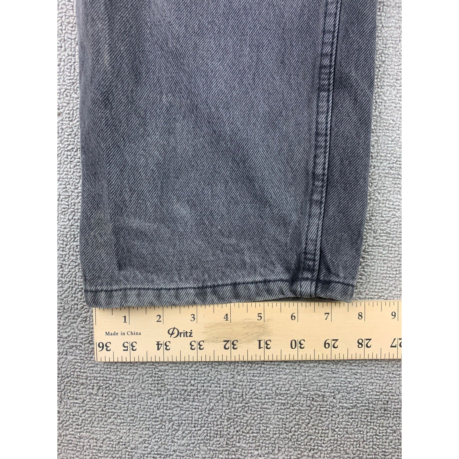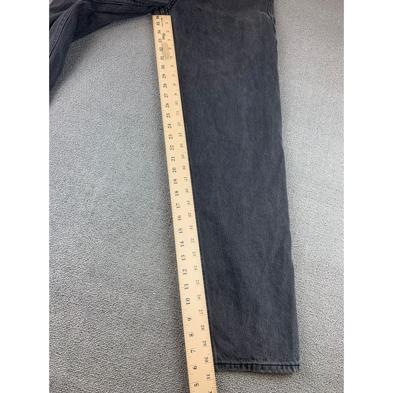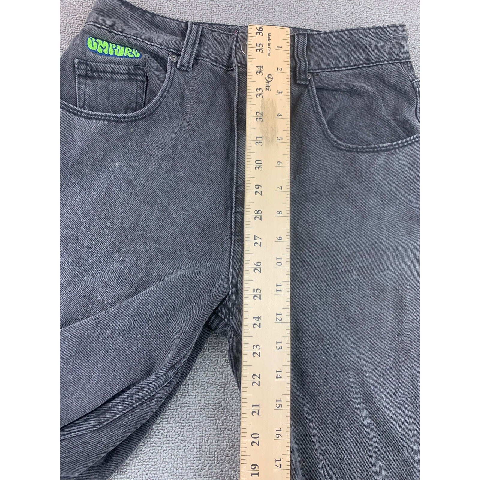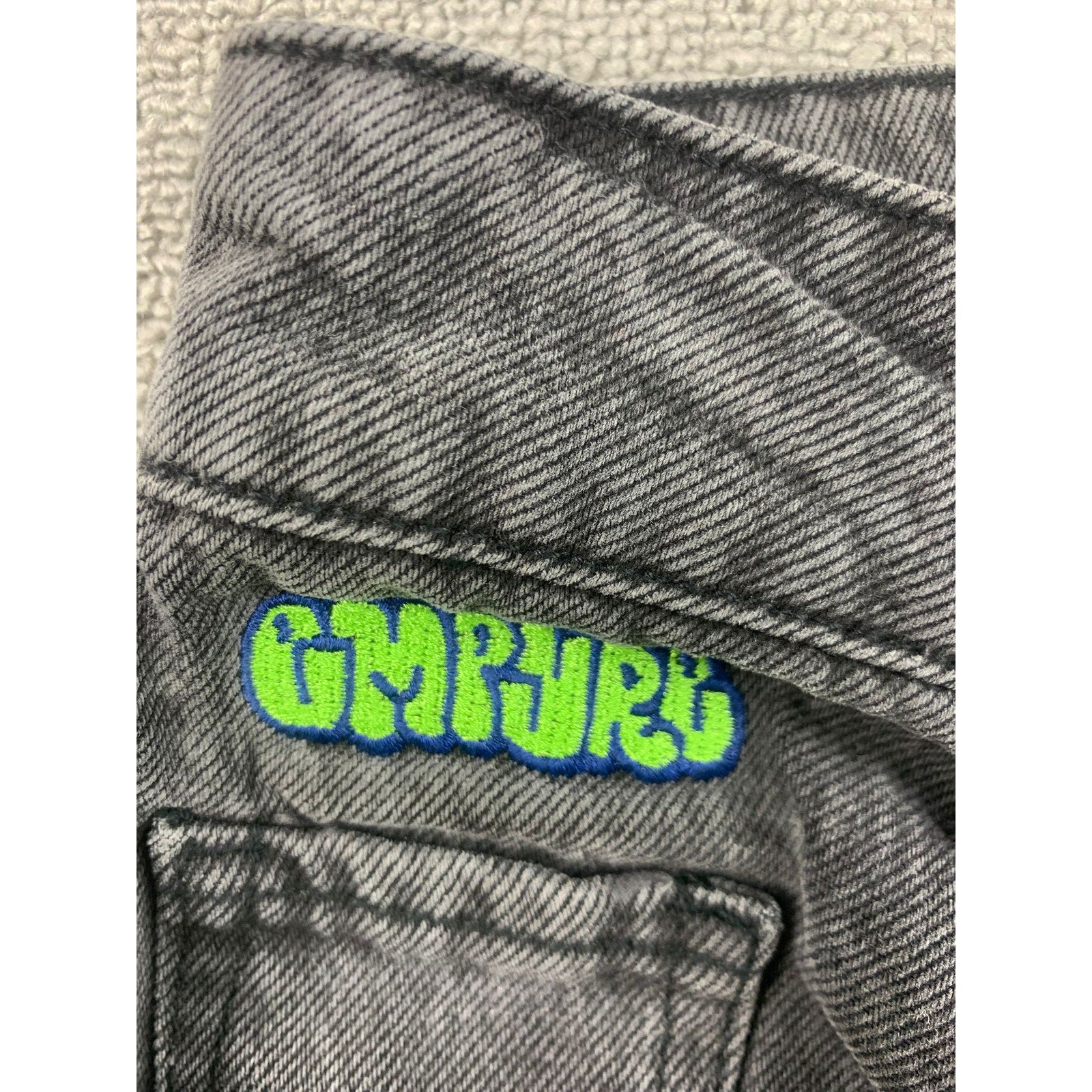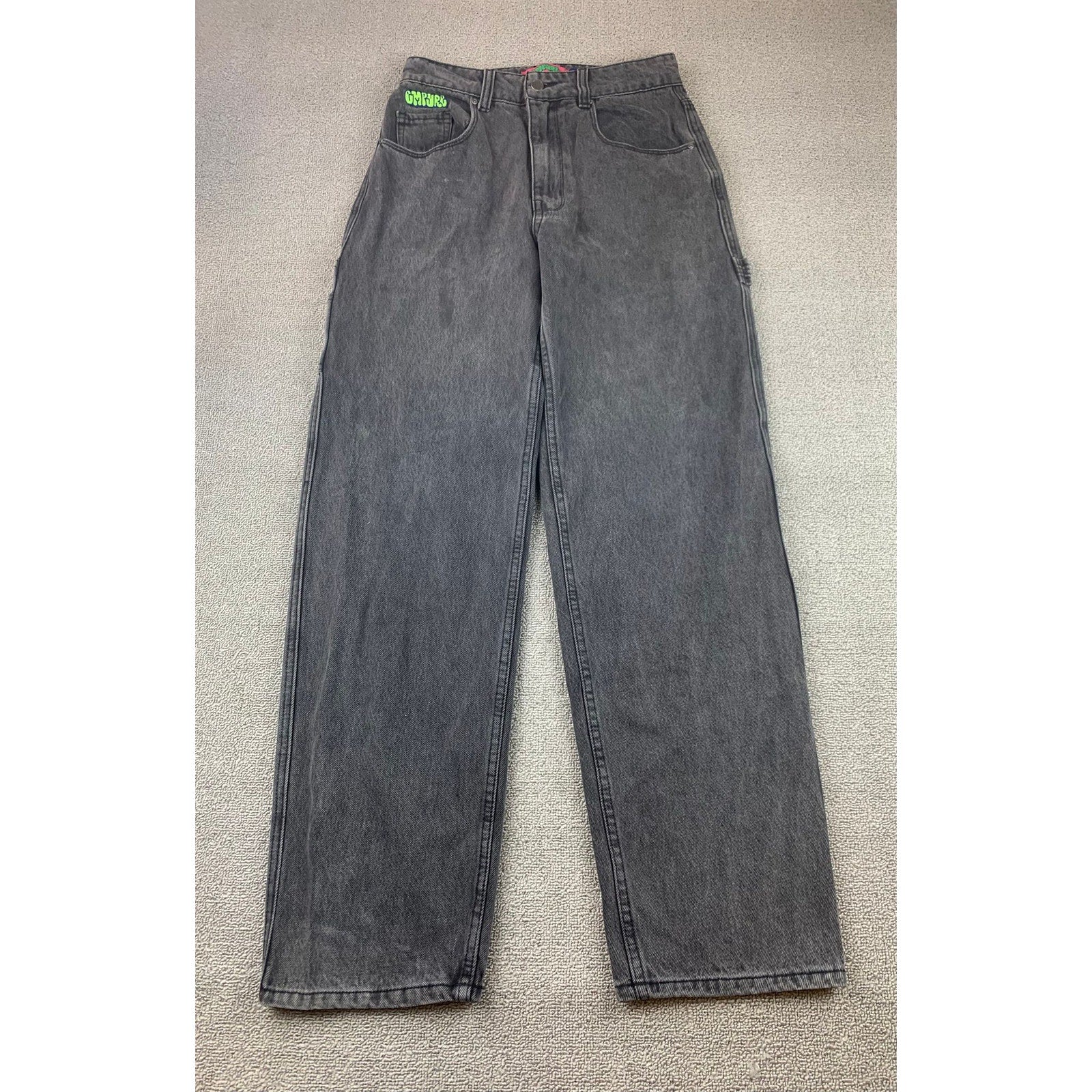 Y2K-era vibe EMPYRE jeans in a charcoal black wash with relaxed straight/wide leg. Features classic 5-pocket styling, hammer loop/carpenter details, neon logo patch at coin pocket, and high-rise fit.