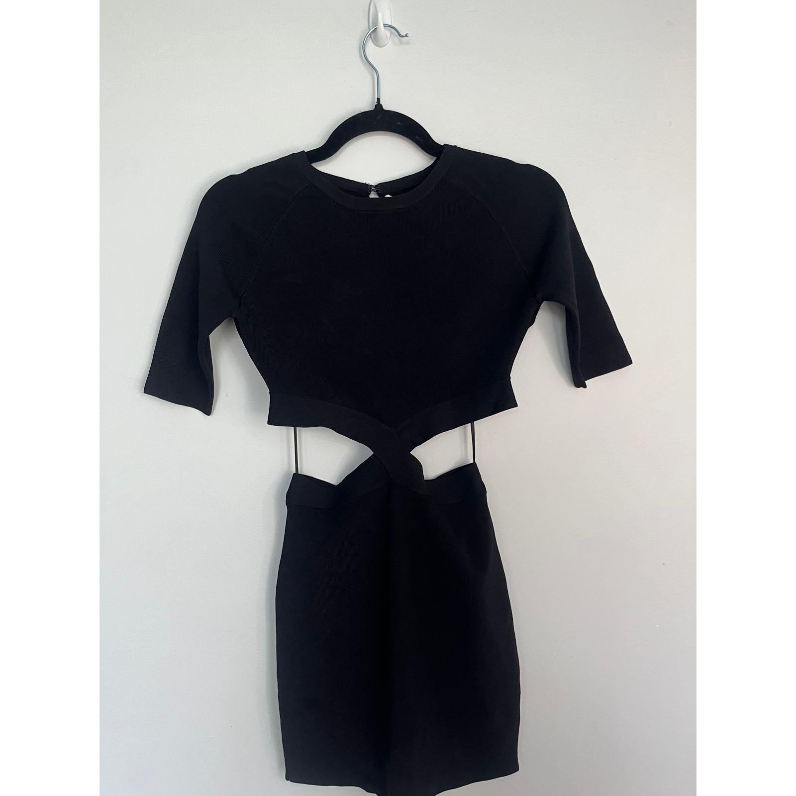 Chic and structured black mini dress with elbow-length sleeves, bodycon fit, and midsection cutout detailing. Ideal for going-out or date night looks.