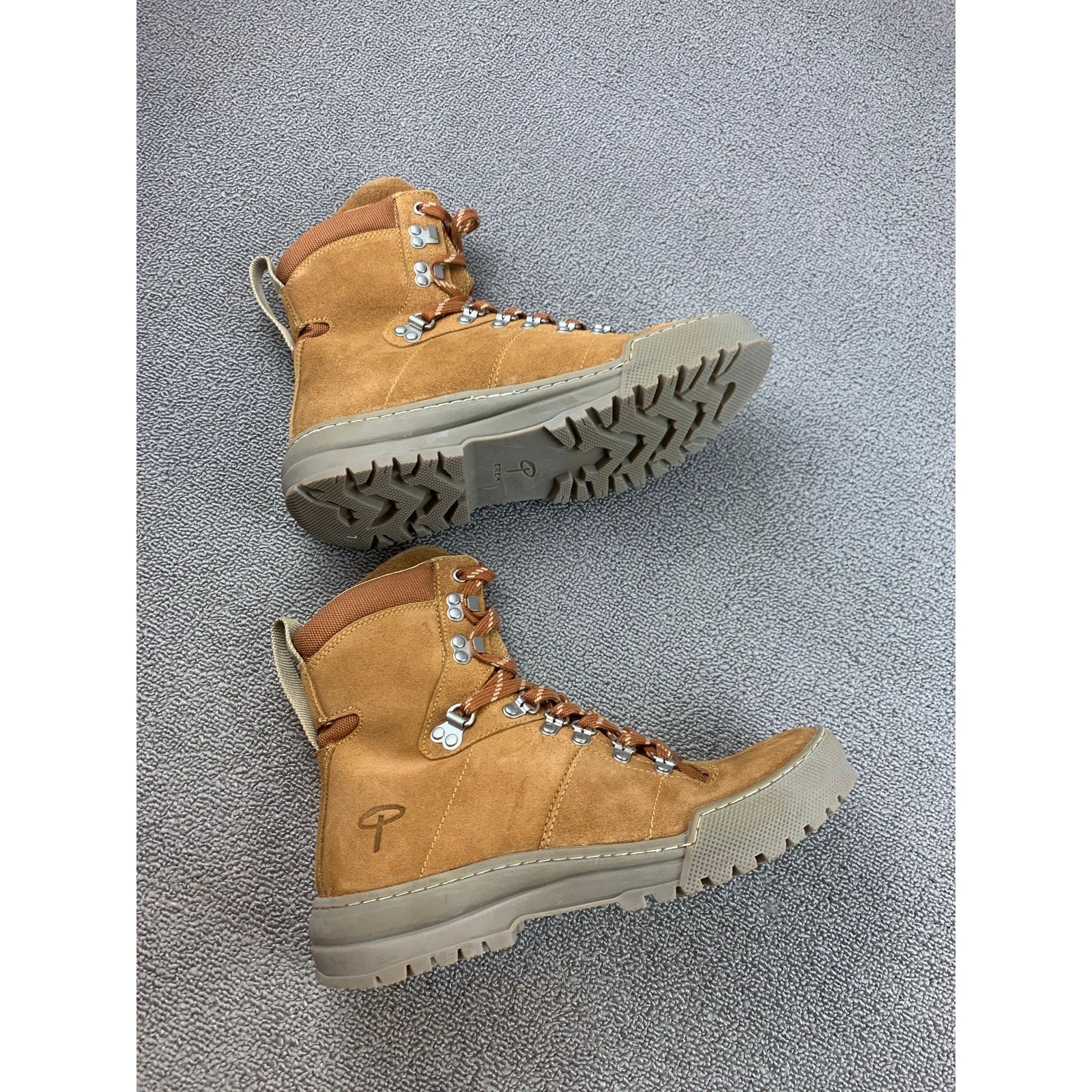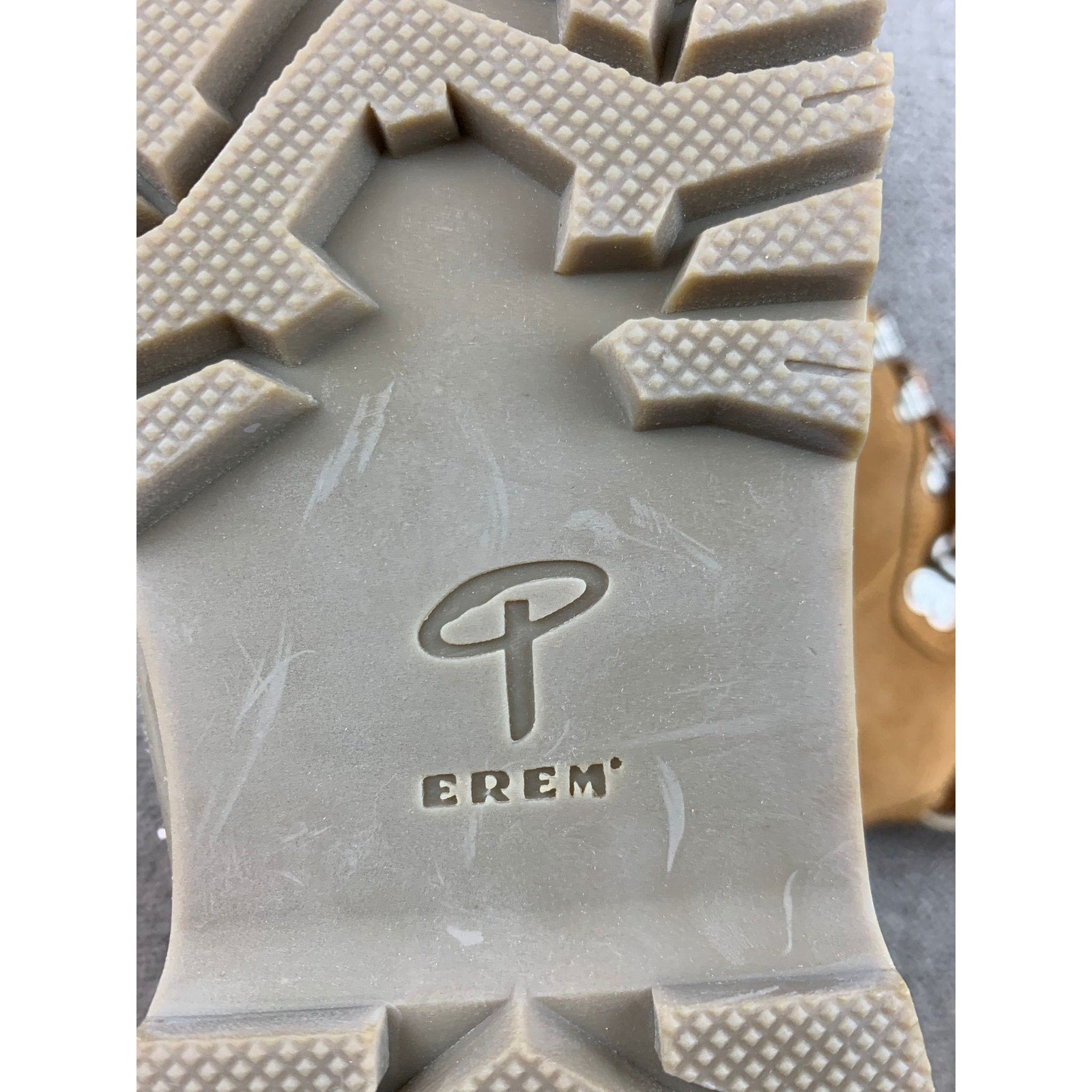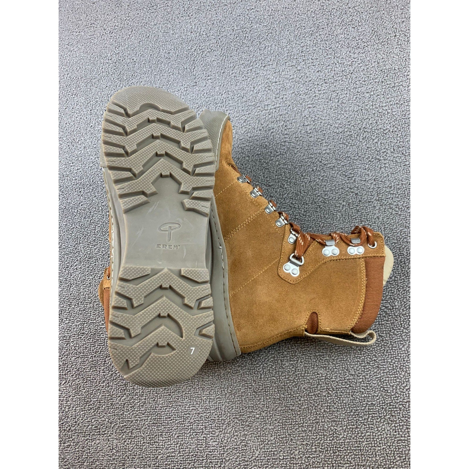 These rugged hiking boots from Erem feature light brown suede uppers styled for desert-trekking aesthetics, integrated lug soles with the Erem “P” logo, and secure lace-up hardware—durable, utilitarian, and perfect for outdoor and urban styling alike.