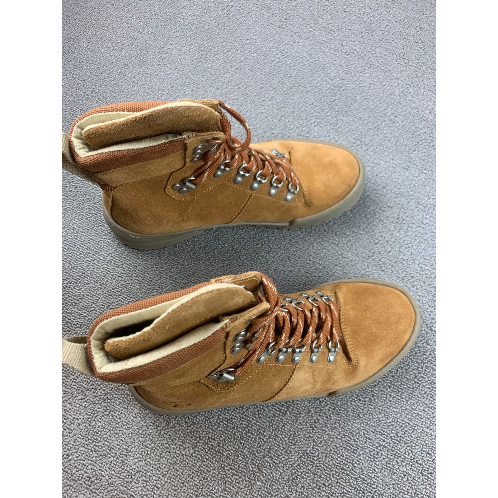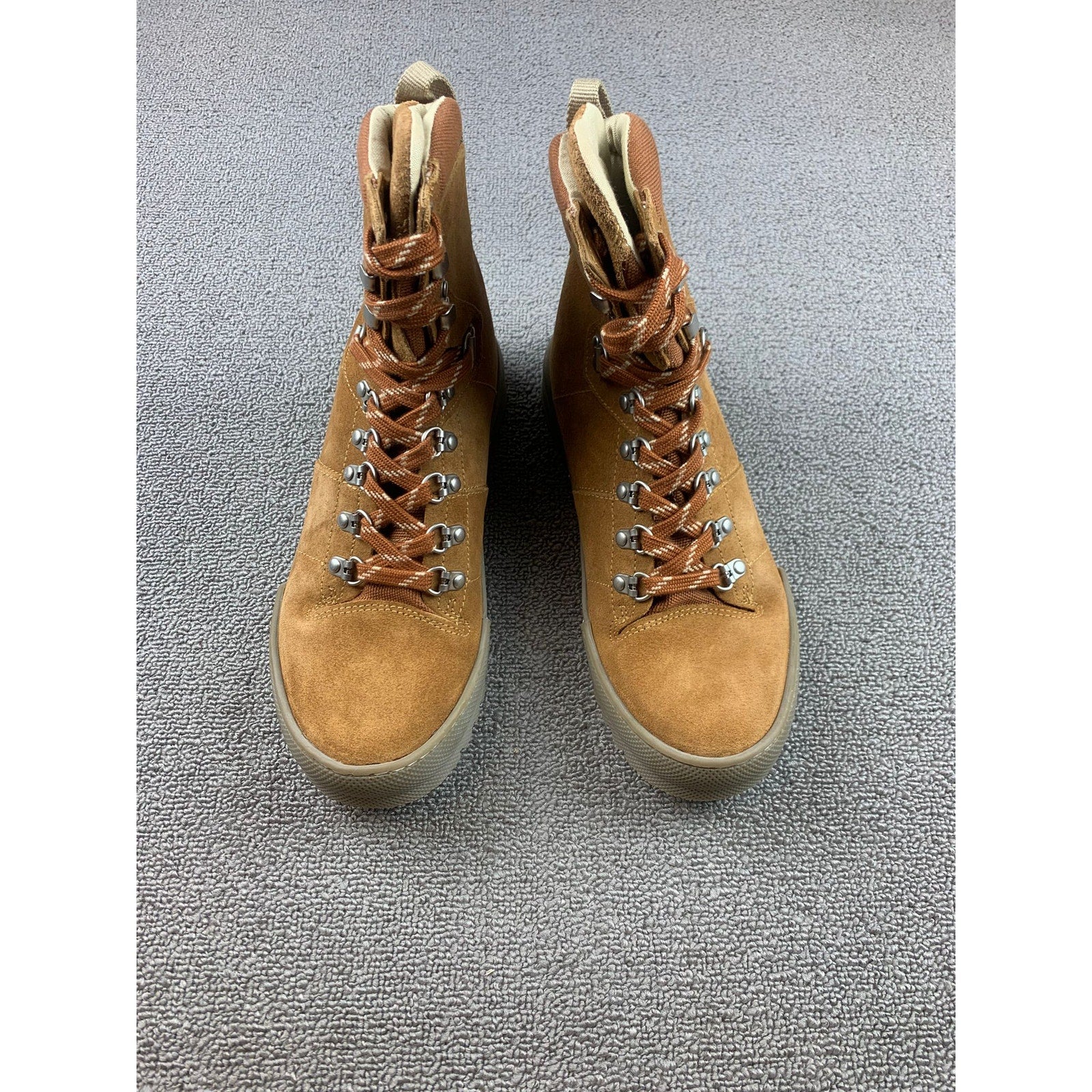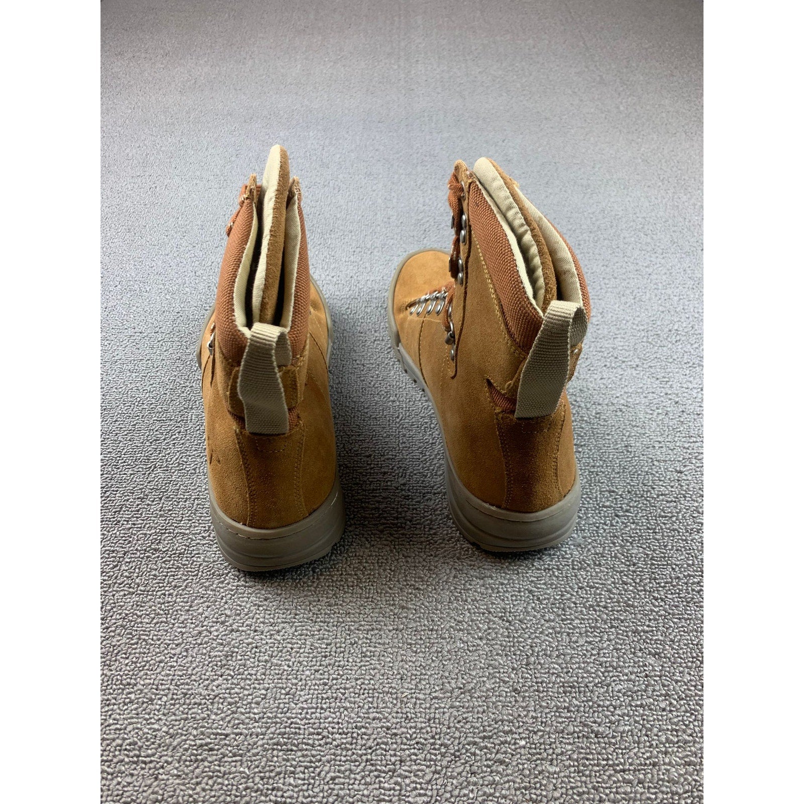 These rugged hiking boots from Erem feature light brown suede uppers styled for desert-trekking aesthetics, integrated lug soles with the Erem “P” logo, and secure lace-up hardware—durable, utilitarian, and perfect for outdoor and urban styling alike.