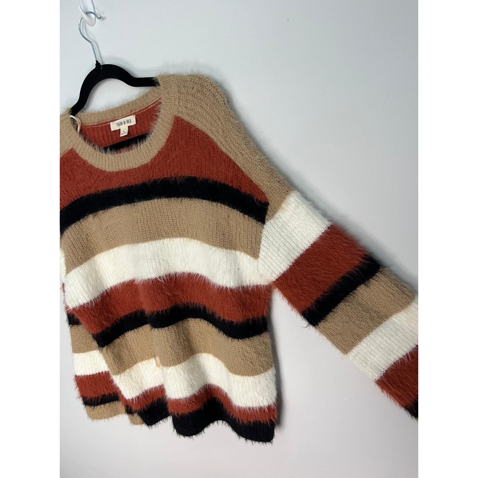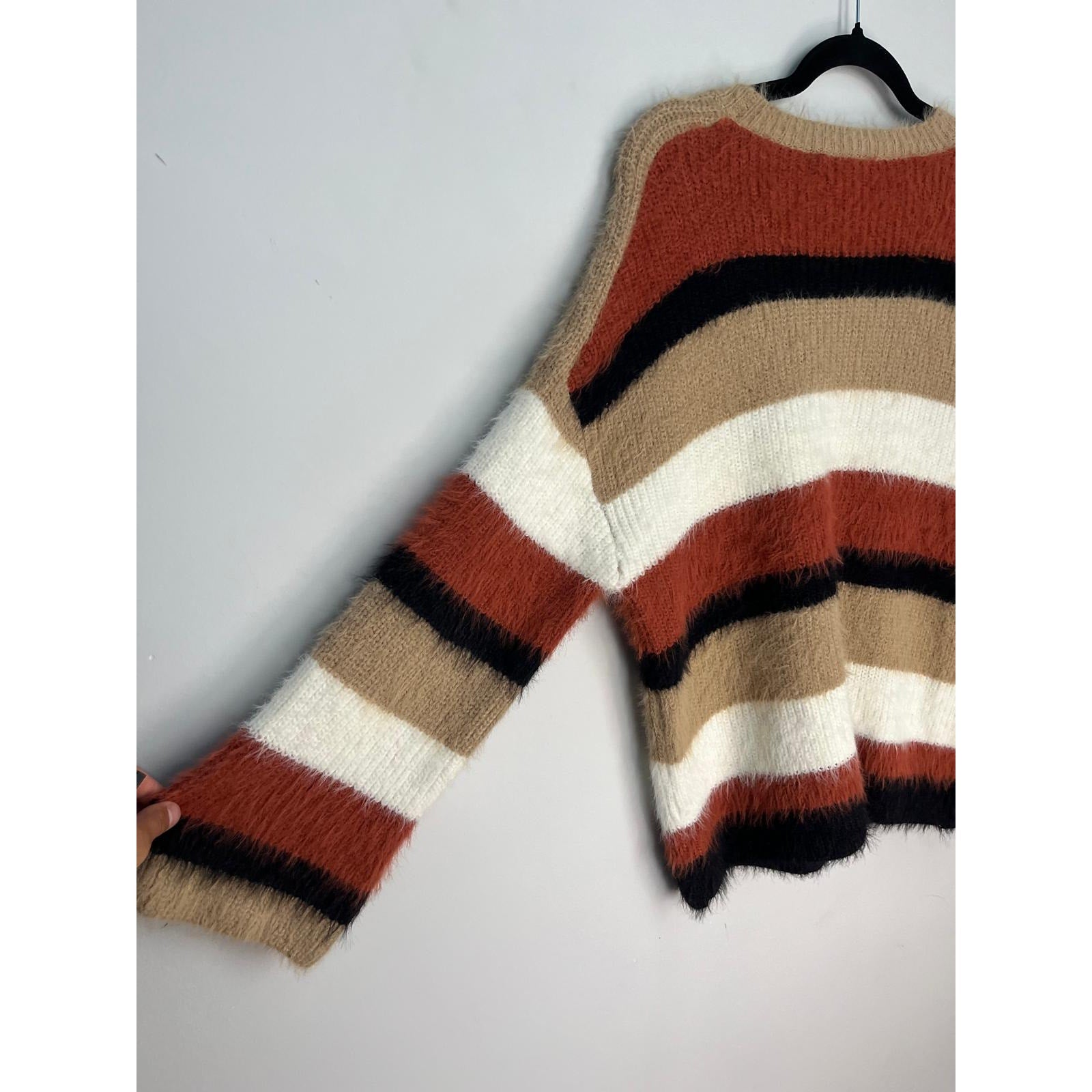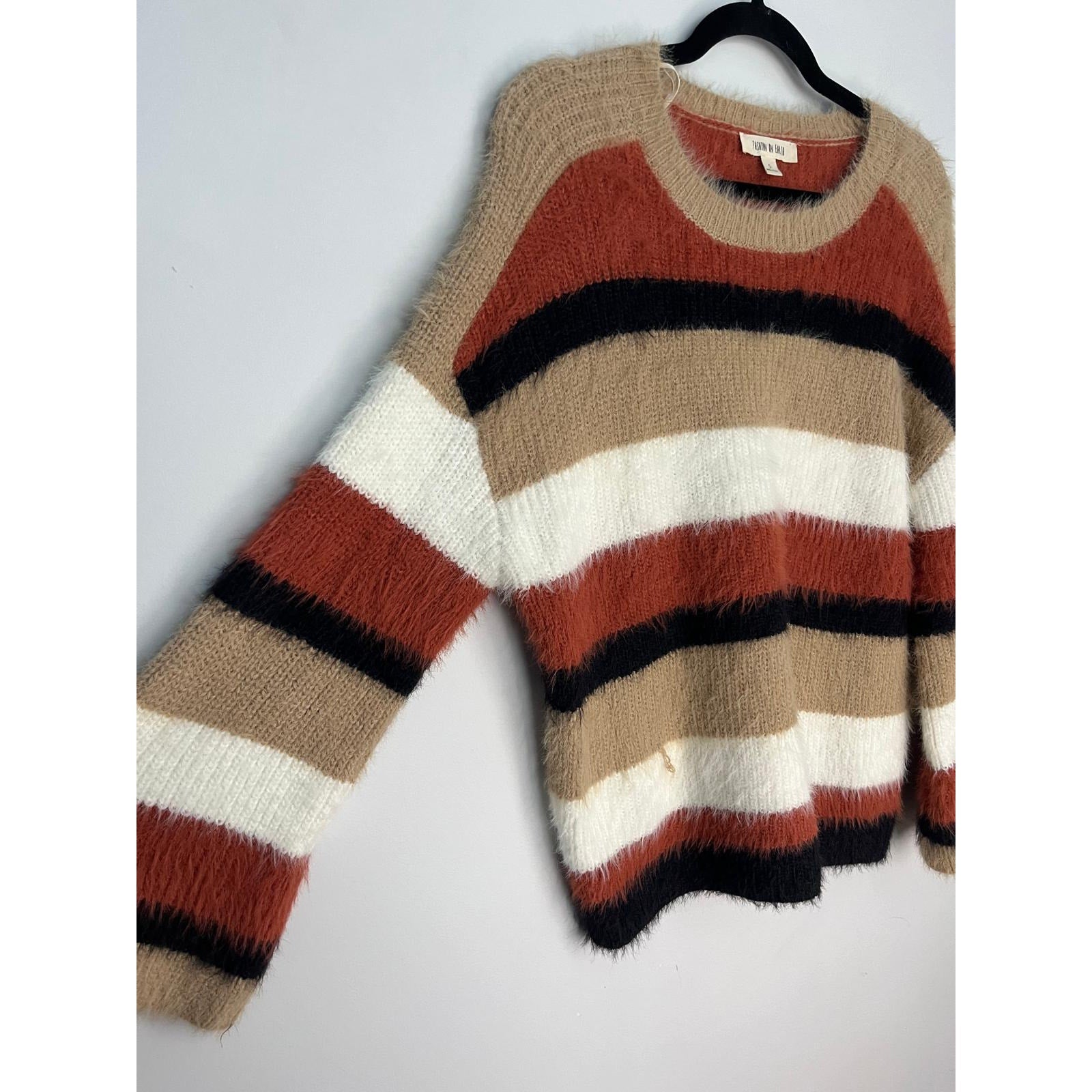 Cozy and soft fuzzy knit sweater with bold horizontal stripes in tan, rust, ivory, and black. Features a slightly cropped hem and crew neckline for a comfy fall-ready fit.