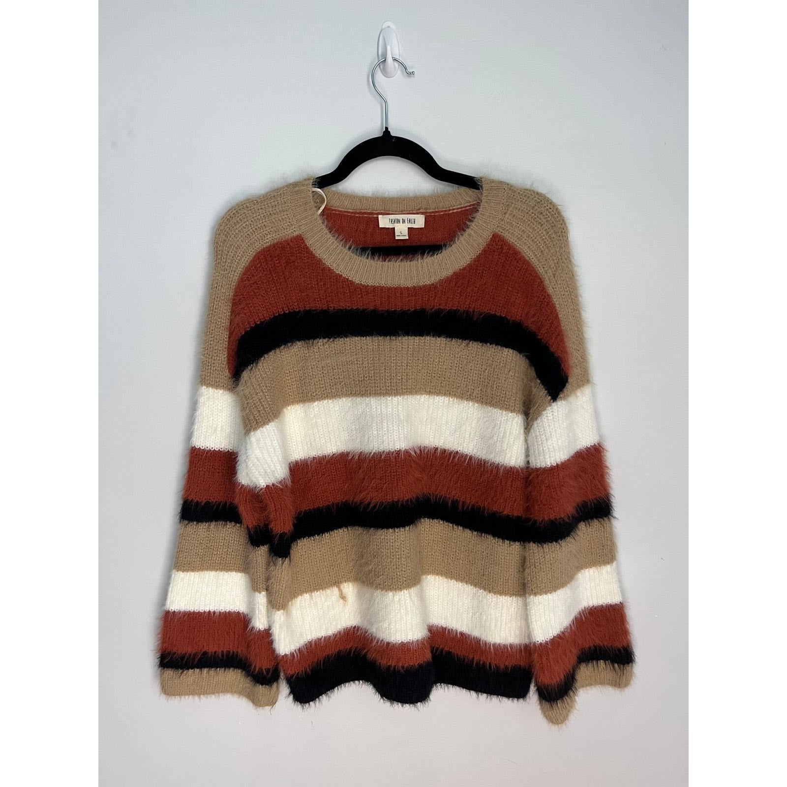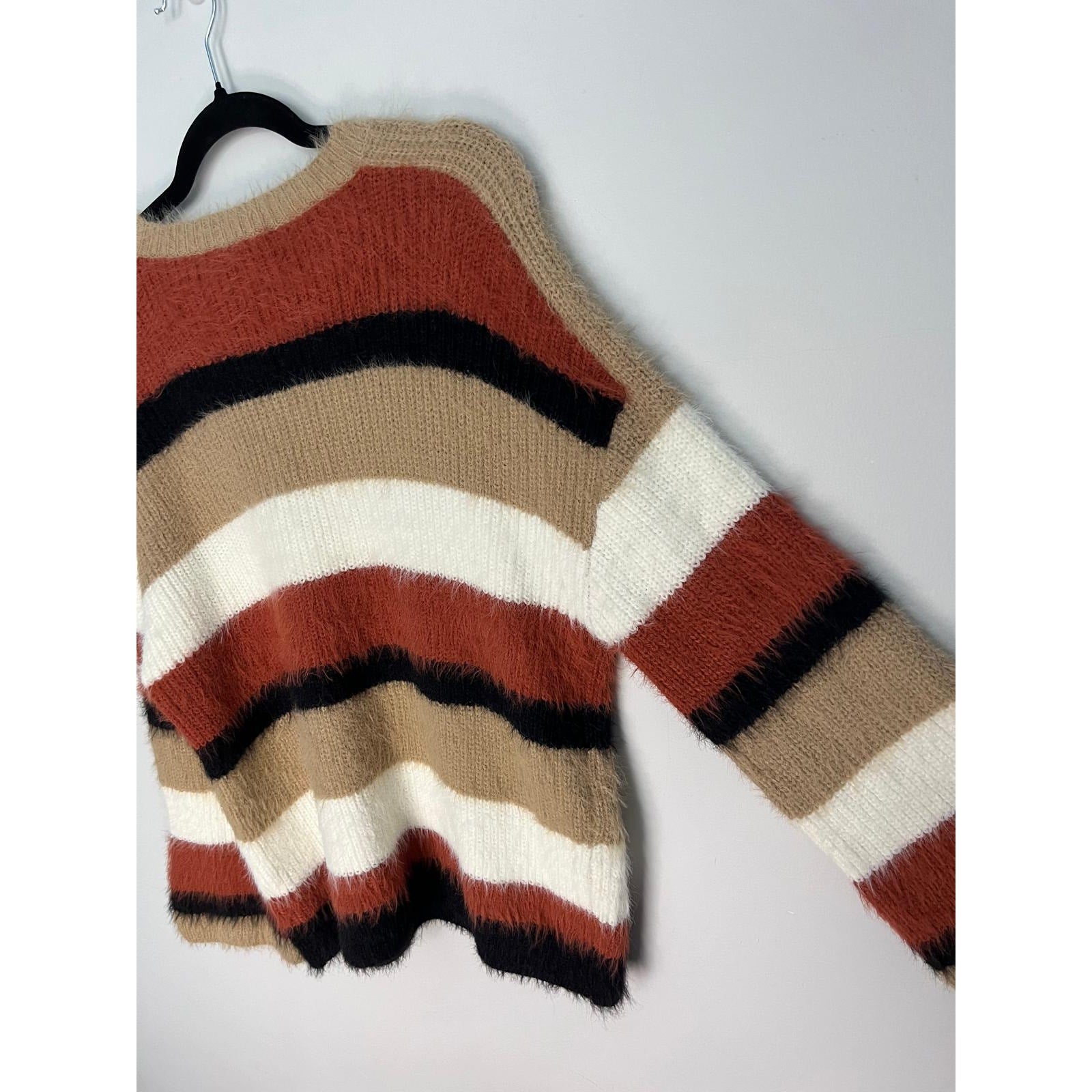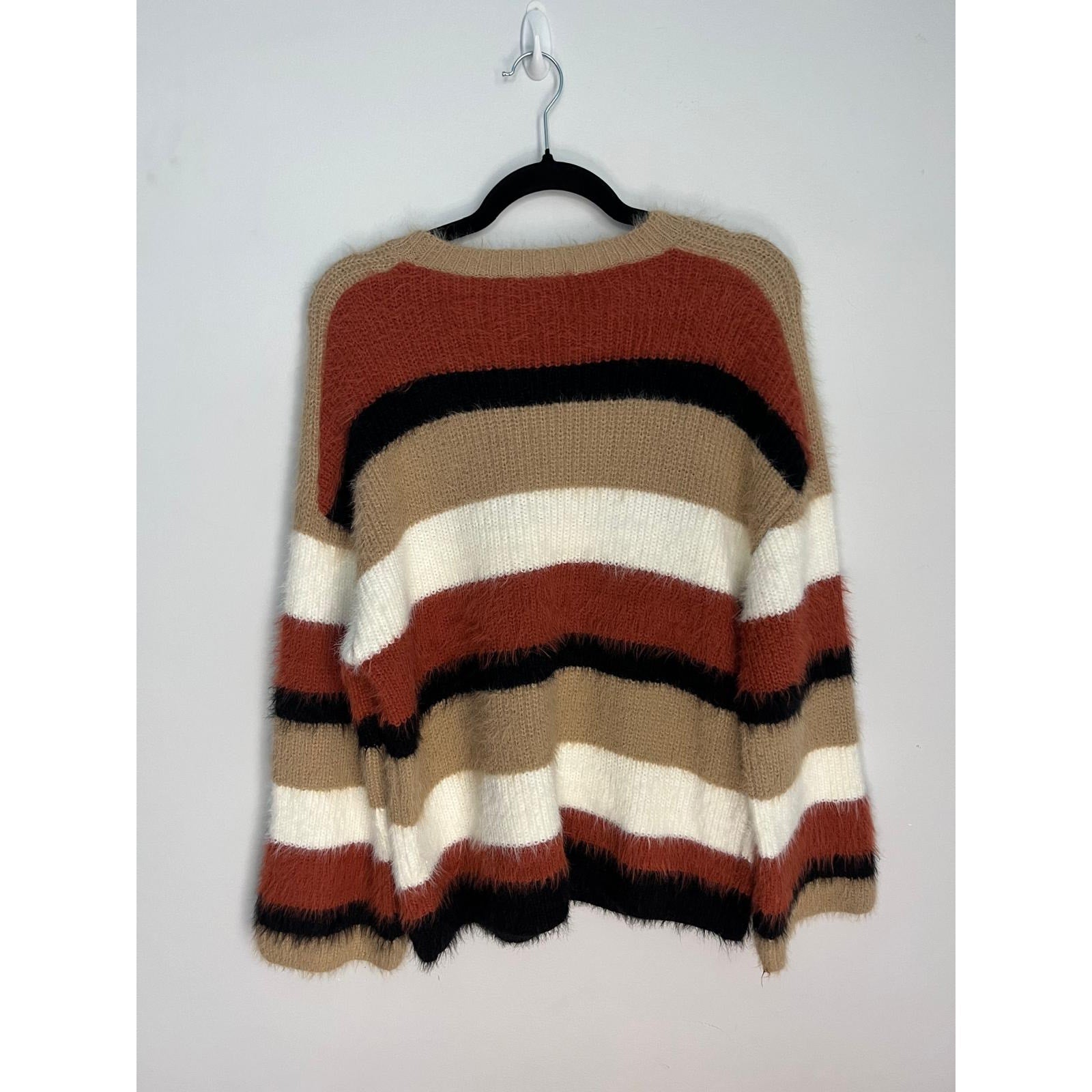 Cozy and soft fuzzy knit sweater with bold horizontal stripes in tan, rust, ivory, and black. Features a slightly cropped hem and crew neckline for a comfy fall-ready fit.